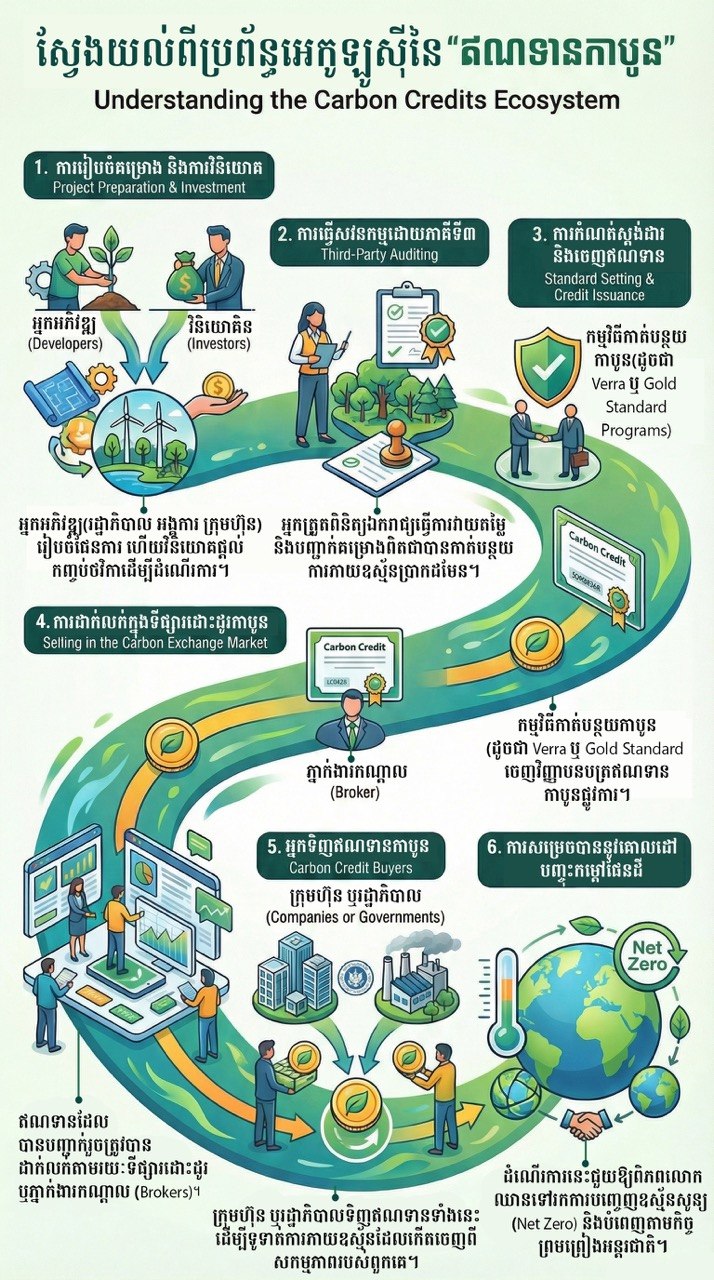 (ភ្នំពេញ)៖ ឥណទានកាបូនត្រូវបានពិភាក្សាជាញឹកញាប់ថា ជាឧបករណ៍អាកាសធាតុដ៏សាមញ្ញមួយ ដែលឥណទានមួយស្មើនឹងការកាត់បន្ថយ ឬការដកចេញឧស្ម័នកាបូនឌីអុកស៊ីត (CO₂) ចំនួនមួយតោន។ ទោះជាយ៉ាងណា ខាងក្រោយនៃគំនិតដ៏សាមញ្ញនេះ គឺមានប្រព័ន្ធអេកូឡូស៊ីដ៏ស្មុគស្មាញមួយ ដែលរួមបញ្ចូលអ្នកចូលរួមជាច្រើន ដែលធ្វើការរួមគ្នាដើម្បីធានាភាពជាក់លាក់ ភាពទុកចិត្តបាន និងដំណើរការទីផ្សារឱ្យមានប្រសិទ្ធភាព។
