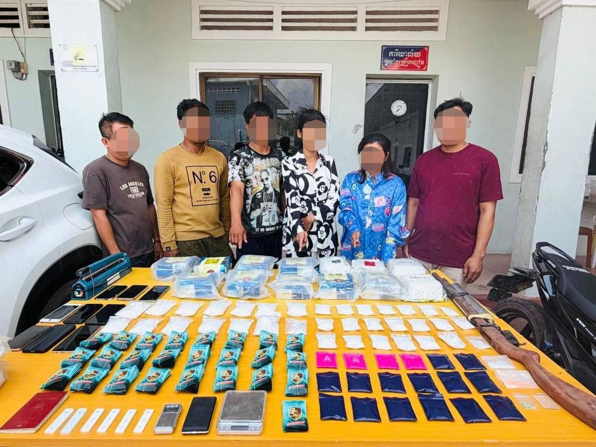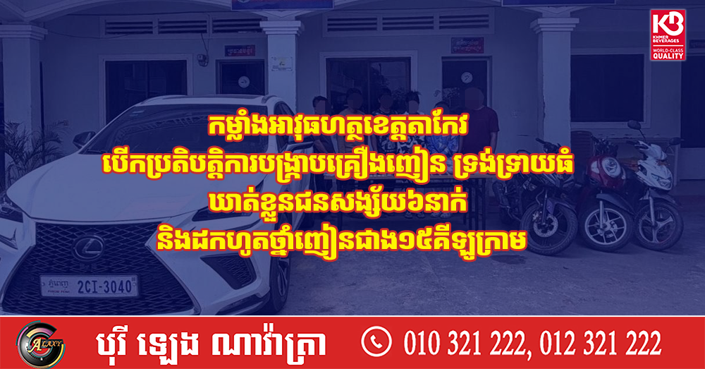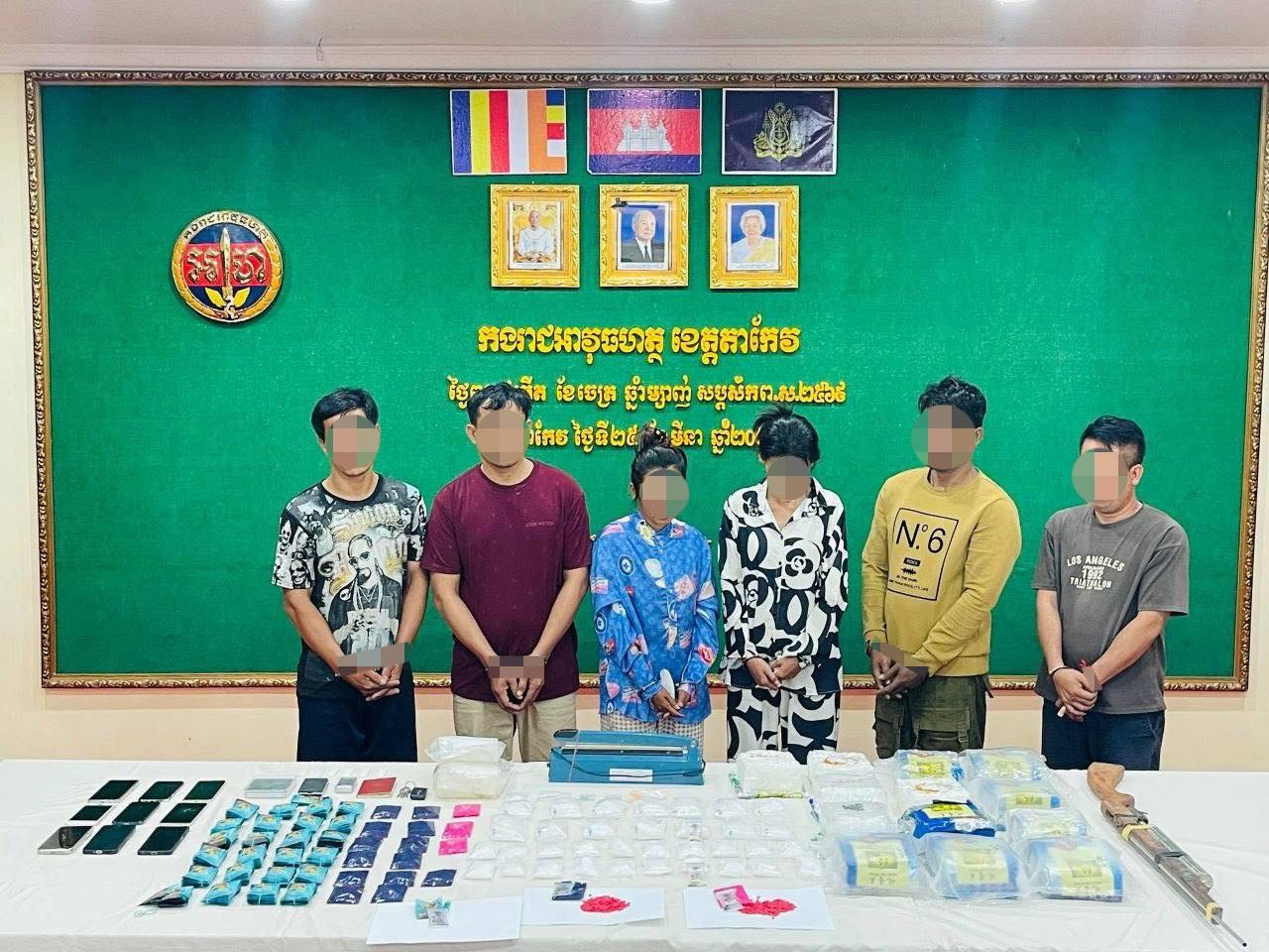 កម្លាំងអាវុធហត្ថខេត្តតាកែវ បើកប្រតិបត្តិការបង្ក្រាបគ្រឿងញៀនទ្រង់ទ្រាយធំ ឃាត់ខ្លួនជនសង្ស័យ៦នាក់ និងដកហូតថ្នាំញៀនជាង១៥គីឡូក្រាម