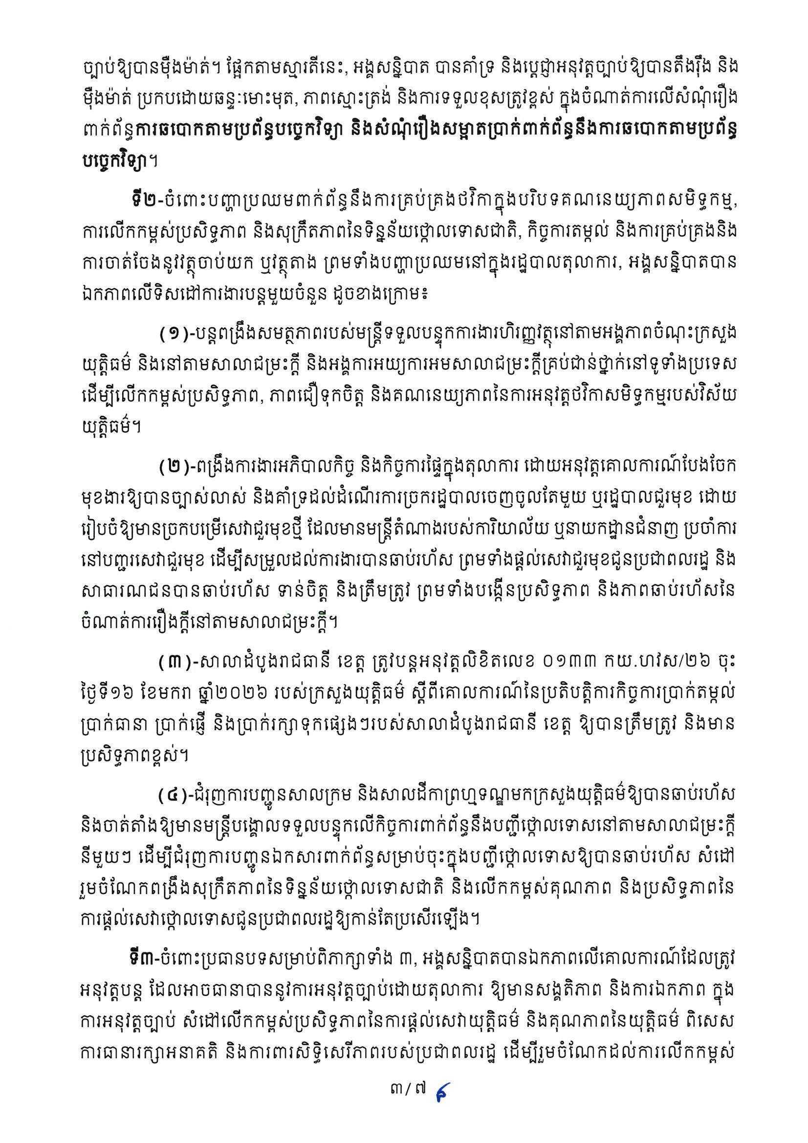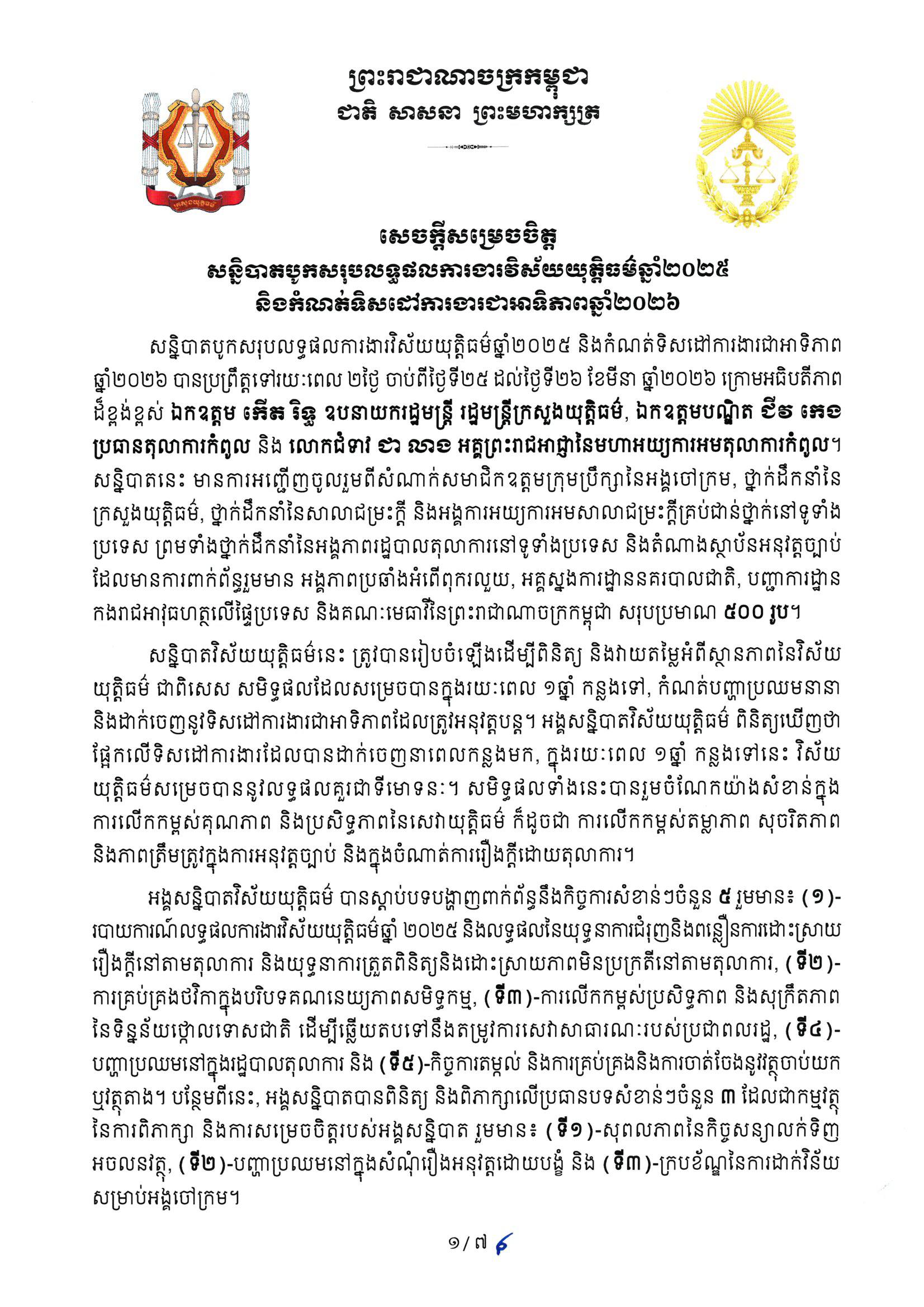 (ភ្នំពេញ)៖ ក្រសួងយុត្តិធម៌ នៅថ្ងៃទី២៧ ខែមីនា ឆ្នាំ២០២៦ បានចេញសេចក្តីសម្រេចចិត្ត ស្តីពីសន្និបាតបូកសរុបលទ្ធផលការងារវិស័យយុត្តិធម៌ឆ្នាំ២០២៥ និងកំណត់ទិសដៅការងារអាទិភាពឆ្នាំ២០២៦។ នេះបើតាមសេចក្តីសម្រេចចិត្ត ដែលបណ្តាញព័ត៌មាន Fresh News ទទួលបាន៕