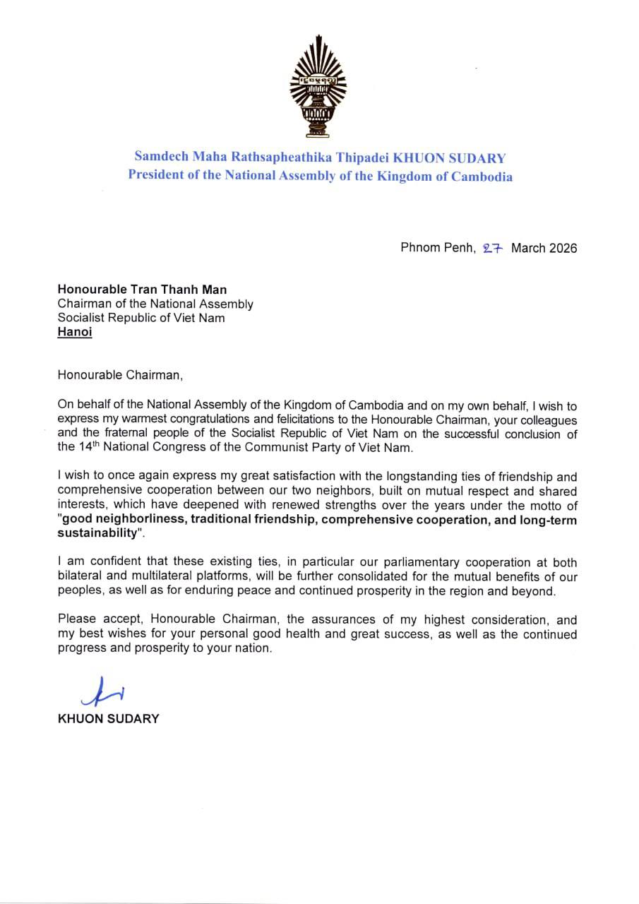 (ភ្នំពេញ)៖ សម្តេចមហារដ្ឋសភាធិការធិបតី ឃួន សុដារី ប្រធានរដ្ឋសភាកម្ពុជា ផ្ញេីសារលិខិតអបអរសាទរ លោក ជិន ថាញ់មិន (Tran Thanh Man) ប្រធានរដ្ឋសភា នៃសាធារណរដ្ឋសង្គមនិយមវៀតណាម ព្រមទាំងជូនចំពោះ សហការី និងប្រជាជនវៀតណាម ក្នុងឱកាសនៃការរៀបចំមហាសន្និបាតជាតិ លើកទី១៤ នៃគណបក្សកុម្មុយនីស្តវៀតណាម ដែលបានបិទបញ្ចប់ដោយជោគជ័យយ៉ាងត្រចះត្រចង់។