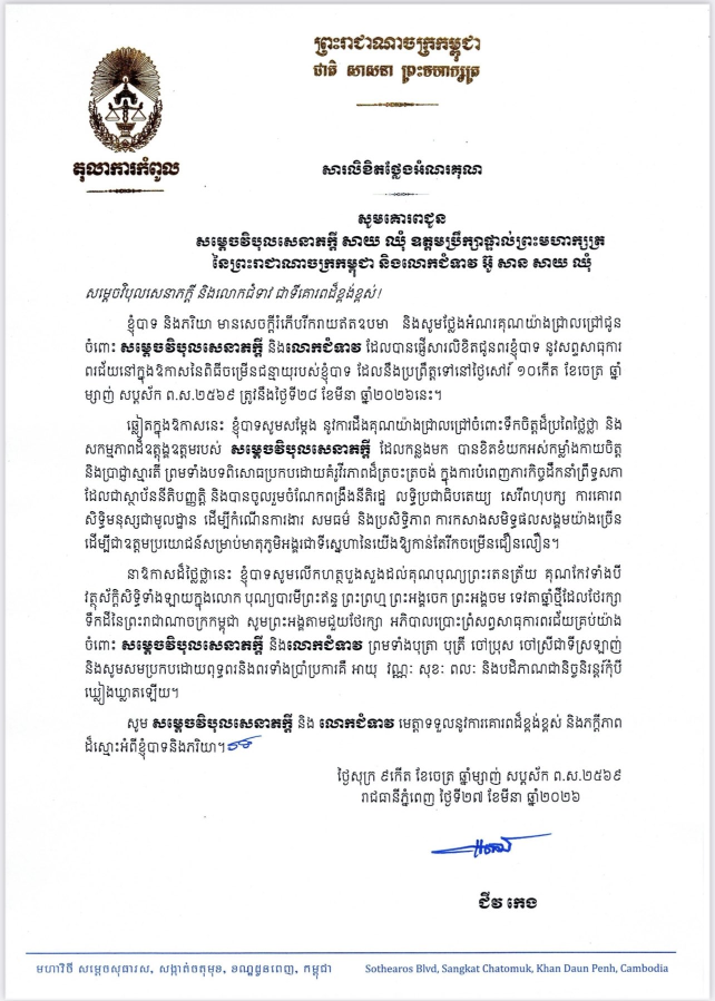 ក្នុងលិខិតថ្លែងអំណរគុណ បានសរសេរថា «ខ្ញុំបាទ និងភរិយា មានសេចក្តីរំភើបរីករាយឥតឧបមា និងសូមថ្លែងអំណរគុណយ៉ាងជ្រាលជ្រៅជូន ចំពោះ សម្តេចវិបុលសេនាភក្តី និងលោកជំទាវ ដែលបានផ្ញើសារលិខិតជូនពរខ្ញុំបាទ នូវសព្ទសាធុការ ពរជ័យនៅក្នុងឱកាសនៃពិធីចម្រើនជន្មាយុរបស់ខ្ញុំបាទ ដែលនឹងប្រព្រឹត្តទៅនៅថ្ងៃសៅរ៍ ១០កើត ខែចេត្រ ឆ្នាំ ម្សាញ់ សប្តស័ក ព.ស.២៥៦៩ ត្រូវនឹងថ្ងៃទី២៨ ខែមីនា ឆ្នាំ២០២៦នេះ។