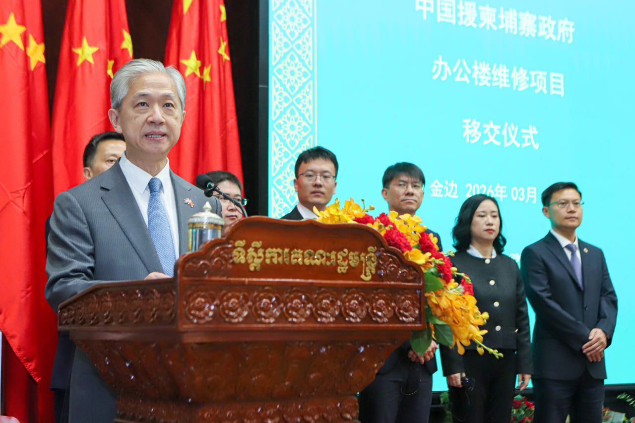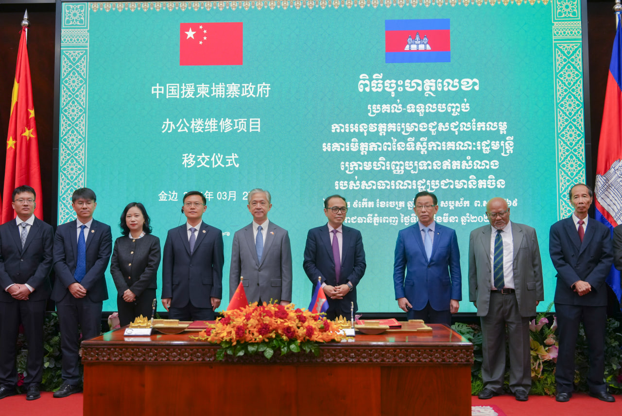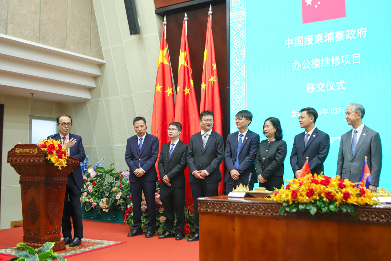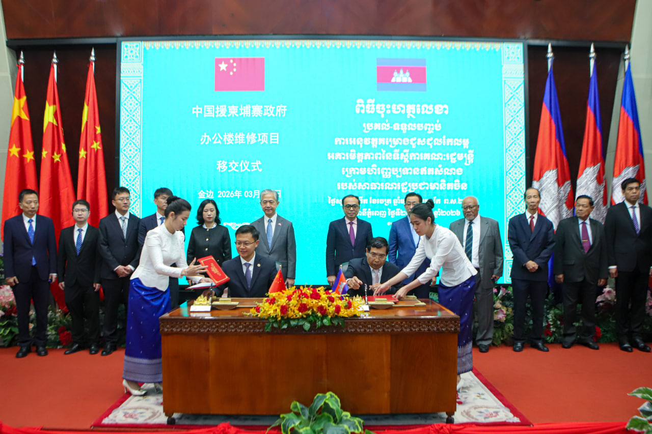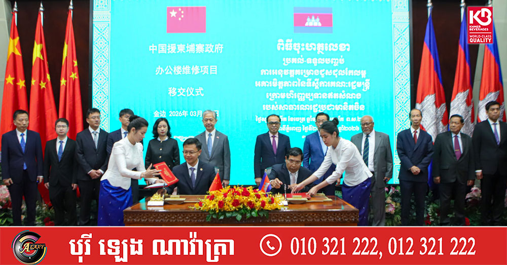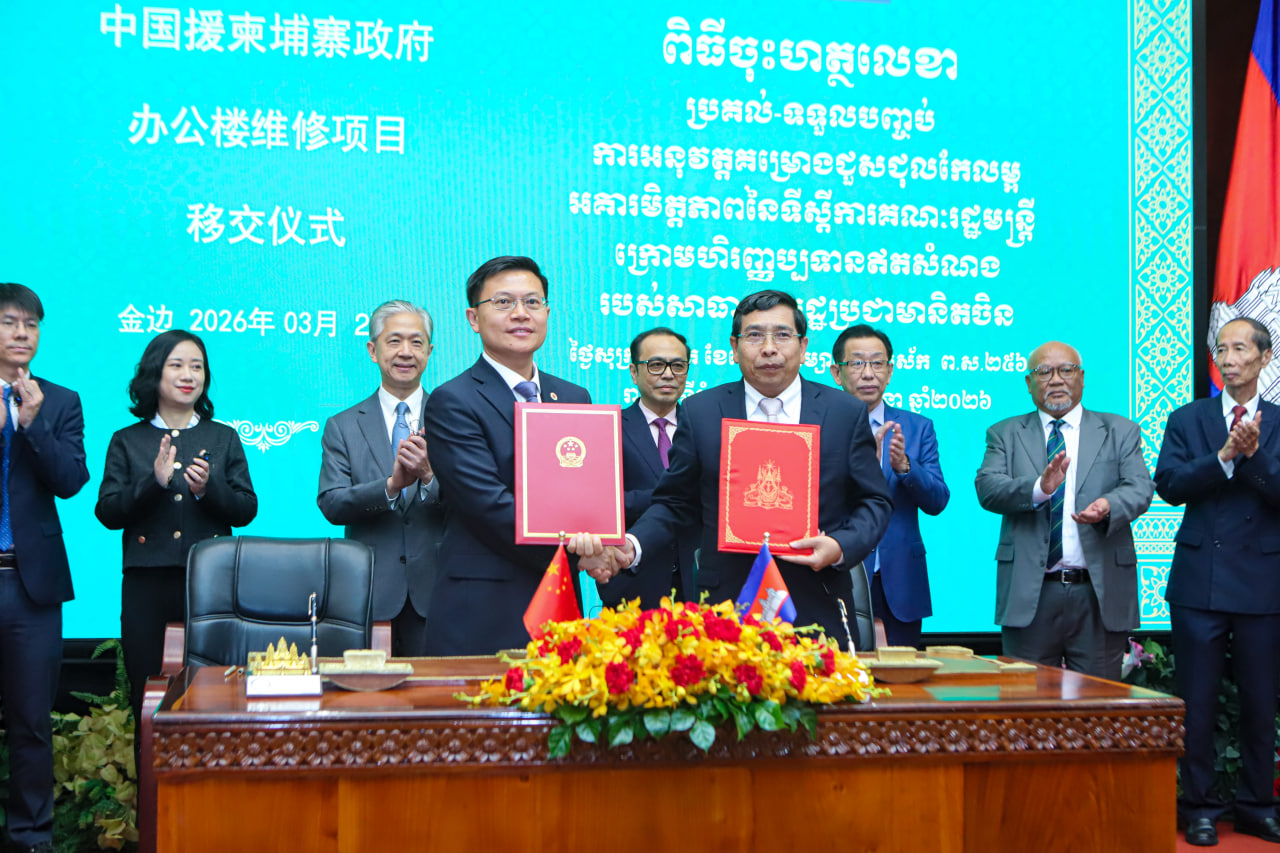 (ភ្នំពេញ)៖ នាព្រឹកថ្ងៃទី២៧ ខែមីនា ឆ្នាំ២០២៦ នៅទីស្តីការគណៈរដ្ឋមន្រ្តី មានការរៀបចំពិធីចុះហត្ថលេខាប្រគល់-ទទួលបញ្ចប់គម្រោងជួសជុលកែលម្អអគារមិត្តភាព នៃទីស្តីការគណៈរដ្ឋមន្ត្រី ដែលមានទឹកប្រាក់ស្មើនឹងប្រមាណ ៧លានដុល្លារអាម៉េរិក ក្រោមហិរញ្ញប្បទានឥតសំណងរបស់សាធារណរដ្ឋប្រជាមានិតចិន។