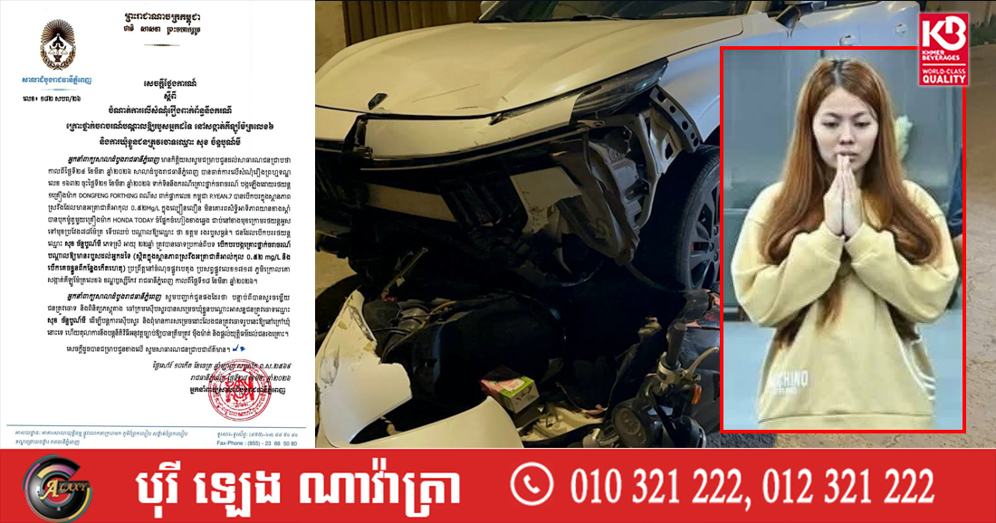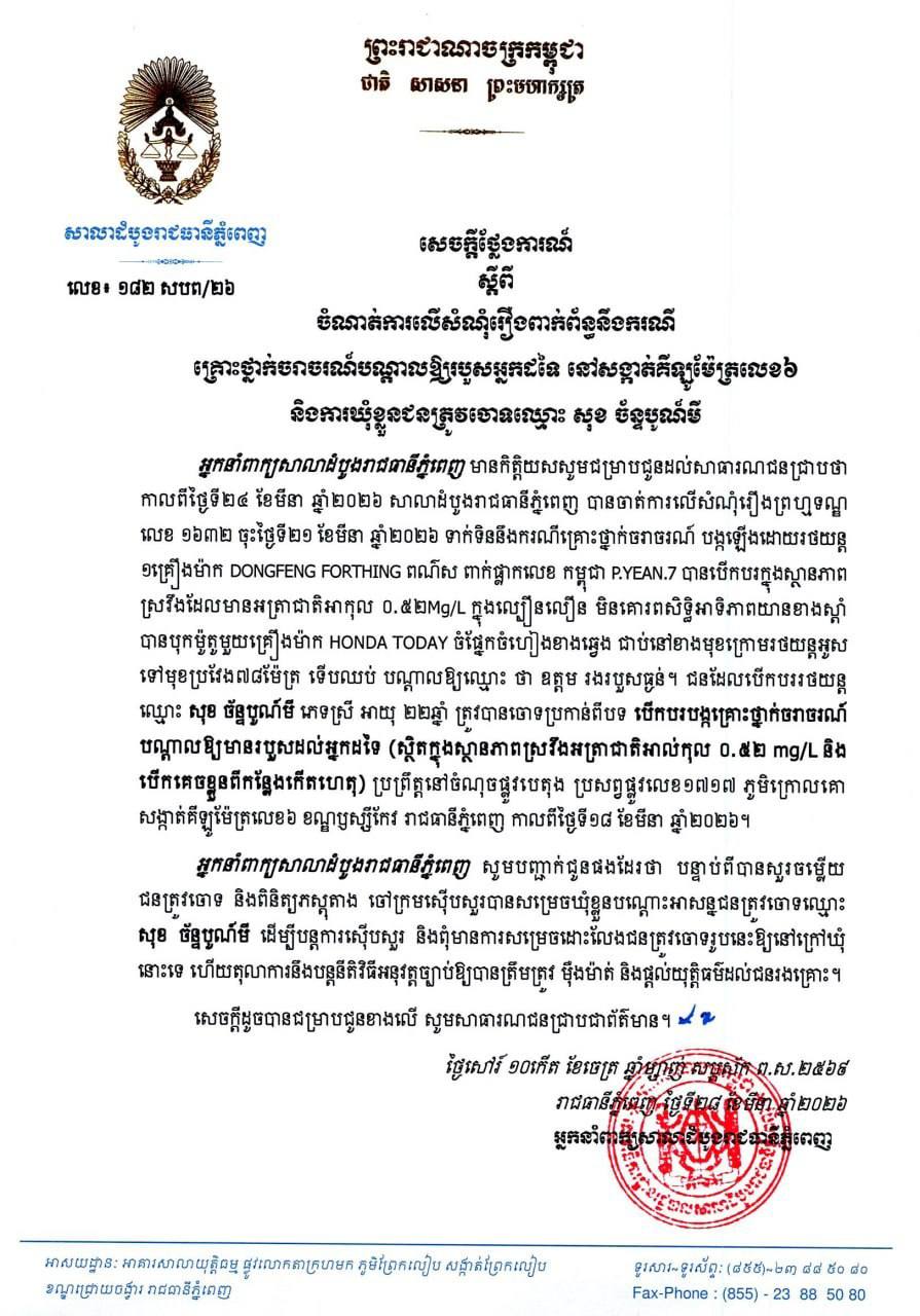 ជនដែលបើកបររថយន្តឈ្មោះ សុខ ច័ន្ទបូណ៍មី ភេទស្រី អាយុ ២២ឆ្នាំ ត្រូវបានចោទប្រកាន់ពីបទបើកបរបង្កគ្រោះថ្នាក់ចរាចរណ៍បណ្តាលឱ្យមានរបួសដល់អ្នកដទៃ (ស្ថិតក្នុងស្ថានភាពស្រវឹងអត្រាជាតិអាល់កុល ០.៥២ mg/L និងបើកគេចខ្លួនពីកន្លែងកើតហេតុ) ប្រព្រឹត្តនៅចំណុចផ្លូវបេតុង ប្រសព្វផ្លូវលេខ១៧១៧ ភូមិក្រោលគោ សង្កាត់គីឡូម៉ែត្រលេខ៦ ខណ្ឌឫស្សីកែវ រាជធានីភ្នំពេញ កាលពីថ្ងៃទី១៨ ខែមីនា ឆ្នាំ២០២៦។