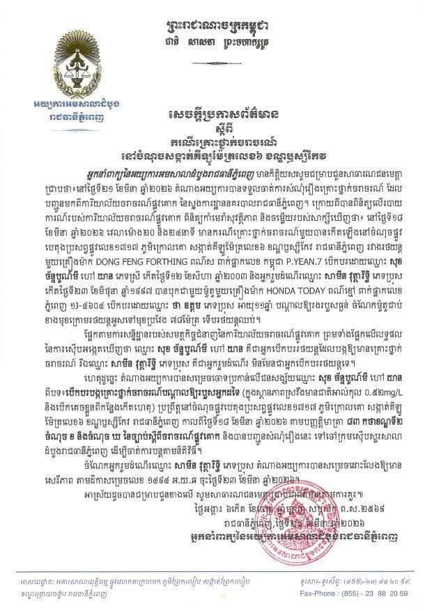 (ភ្នំពែញ)៖ អ្នកនាំពាក្យសាលាដំបូងរាជធានីភ្នំពេញ បានចាត់ការលើសំណុំរឿងព្រហ្មទណ្ឌលេខ ១៦៣២ ចុះថ្ងៃទី២១ ខែមីនា ឆ្នាំ២០២៦ ទាក់ទិននឹងករណីគ្រោះថ្នាក់ចរាចរណ៍បង្កឡើងដោយរថយន្ត ១គ្រឿងម៉ាក DONGFENG FORTHING ពណ៌ស ពាក់ផ្លាកលេខកម្ពុជា P.YEAN.7 បានបើកបរក្នុងស្ថានភាពស្រវឹងដែលមានអត្រាជាតិអាកុល ០.៥២Mg/L ក្នុងល្បឿនលឿន មិនគោរពសិទ្ធិអាទិភាពយានខាងស្តាំ បានបុកម៉ូតូមួយគ្រឿងម៉ាក HONDA TODAY ចំផ្នែកចំហៀងខាងឆ្វេង ជាប់នៅខាងមុខក្រោមរថយន្តអូស ទៅមុខប្រវែង៧៨ម៉ែត្រ ទើបឈប់បណ្តាលឱ្យឈ្មោះ ថា ឧត្តម រងរបួសធ្ងន់។