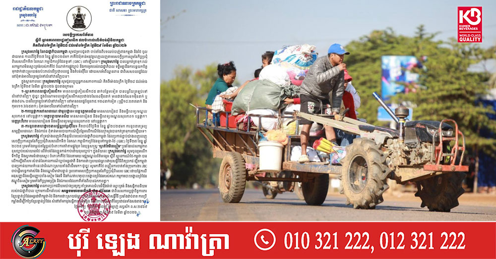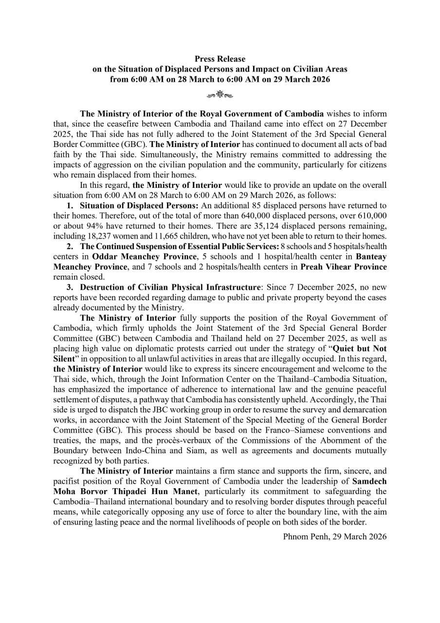 (ភ្នំពេញ)៖ ក្រសួងមហាផ្ទៃ បានឱ្យដឹងថា គិតពីម៉ោង៦ព្រឹក ថ្ងៃទី២៨ ដល់ម៉ោង ៦ព្រឹក ថ្ងៃទី២៩ ខែមីនា ឆ្នាំ២០២៦ មានពលរដ្ឋភៀសសឹក៨៥ នាក់បន្ថែមទៀត បានបន្តវិលត្រឡប់ទៅលំនៅឋានវិញ។