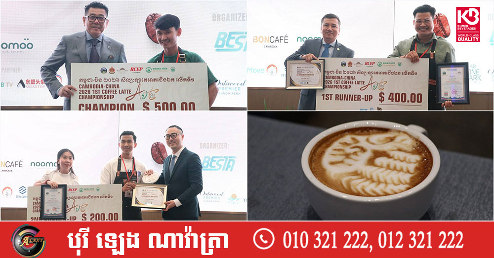 (ភ្នំពេញ)៖ ព្រឹត្តិការណ៍ប្រកួតជើងឯកសិល្បៈកាហ្វេឡាតេអាត កម្ពុជា-ចិន លើកទី១ ឆ្នាំ២០២៦ (1st Championships Latte Art ) ដែលមានការទទួលស្គាល់ពីស្ថាប័ន ICLA របស់ប្រទេសចិន ក្រោមប្រធានបទ «កាហ្វេបង្រួបបង្រួមយើងទាំងអស់» ដេីម្បីលេីកកម្ពស់ជំនាញផ្នែកឆុងកាហ្វេនៅកម្ពុជា ក៏ដូចជាដេីម្បីពង្រឹងកិច្ចសហប្រតិបត្តិការរវាងកម្ពុជា-ចិន នោះ បានឈានដល់វគ្គផ្តាច់ព្រ័ត្រ និងបានរកឃើញម្ចាស់ជ័យលាភី គិតត្រឹមល្ងាចថ្ងៃទី២៩ ខែមីនា ឆ្នាំ២០២៦នេះ។