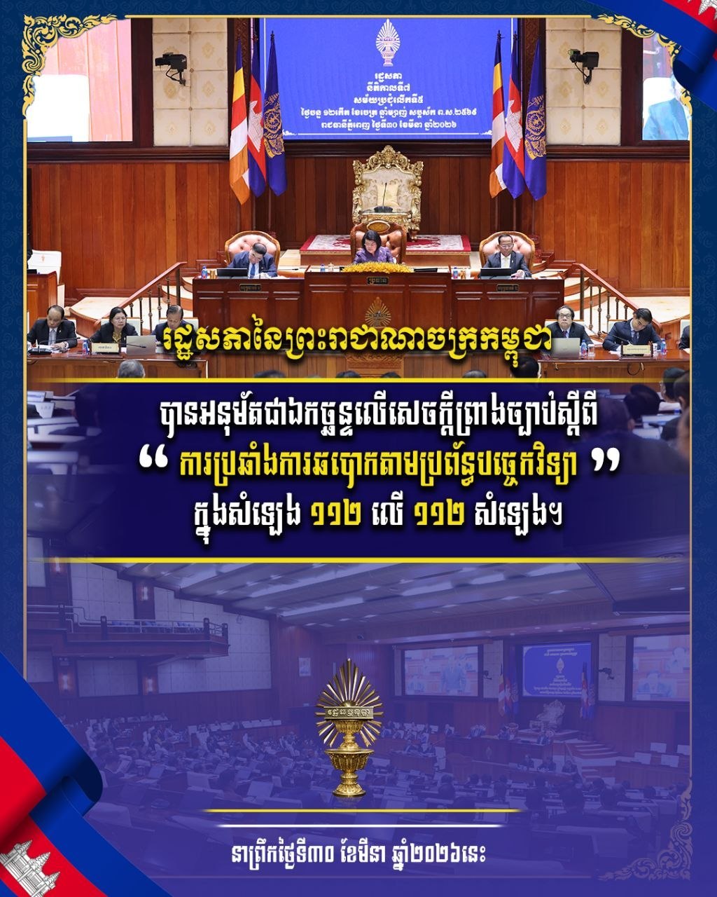 (ភ្នំពេញ)៖ រដ្ឋសភាកម្ពុជា នៅព្រឹកថ្ងៃទី៣០ ខែមីនា ឆ្នាំ២០២៦នេះ បានអនុម័តជាឯកច្ឆ័នហើយ លើសេចក្តីព្រាងច្បាប់ ស្តីពីការប្រឆាំងការឆបោកតាមប្រព័ន្ធបច្ចេកវិទ្យា ក្នុងសំឡេង ១១២ លើ១១២ សំឡេង។