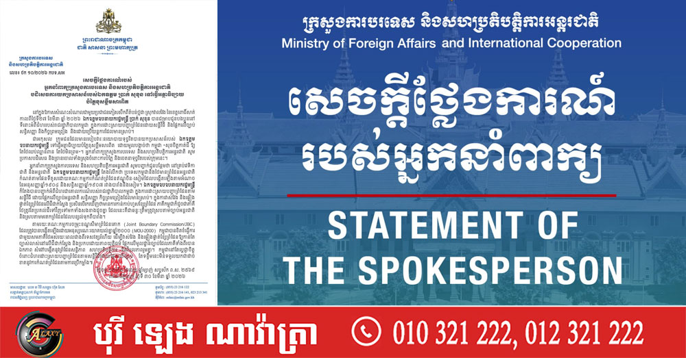 អ្នកនាំពាក្យក្រសួងការបរទេស និងសហប្រតិបត្តិការអន្តរជាតិ សូមបញ្ជាក់ជូនបន្ថែមថា នៅគ្រប់វេទិកាជាតិ និងអន្តរជាតិ ឧបនាយករដ្ឋមន្ត្រី តែងរំលឹកថា ប្រទេសកម្ពុជា និងថៃ មានព្រំដែនអន្តរជាតិ កំណត់តាមផែនទីគូសដោយគណៈកម្មការកំណត់ព្រំដែនឥណ្ឌូចិន-សៀម ដែលបង្កើតឡើងតាមអំណាចនៃអនុសញ្ញាឆ្នាំ១៩០៤ និងសន្ធិសញ្ញាឆ្នាំ១៩០៧ រវាងបារាំងនិងសៀម។