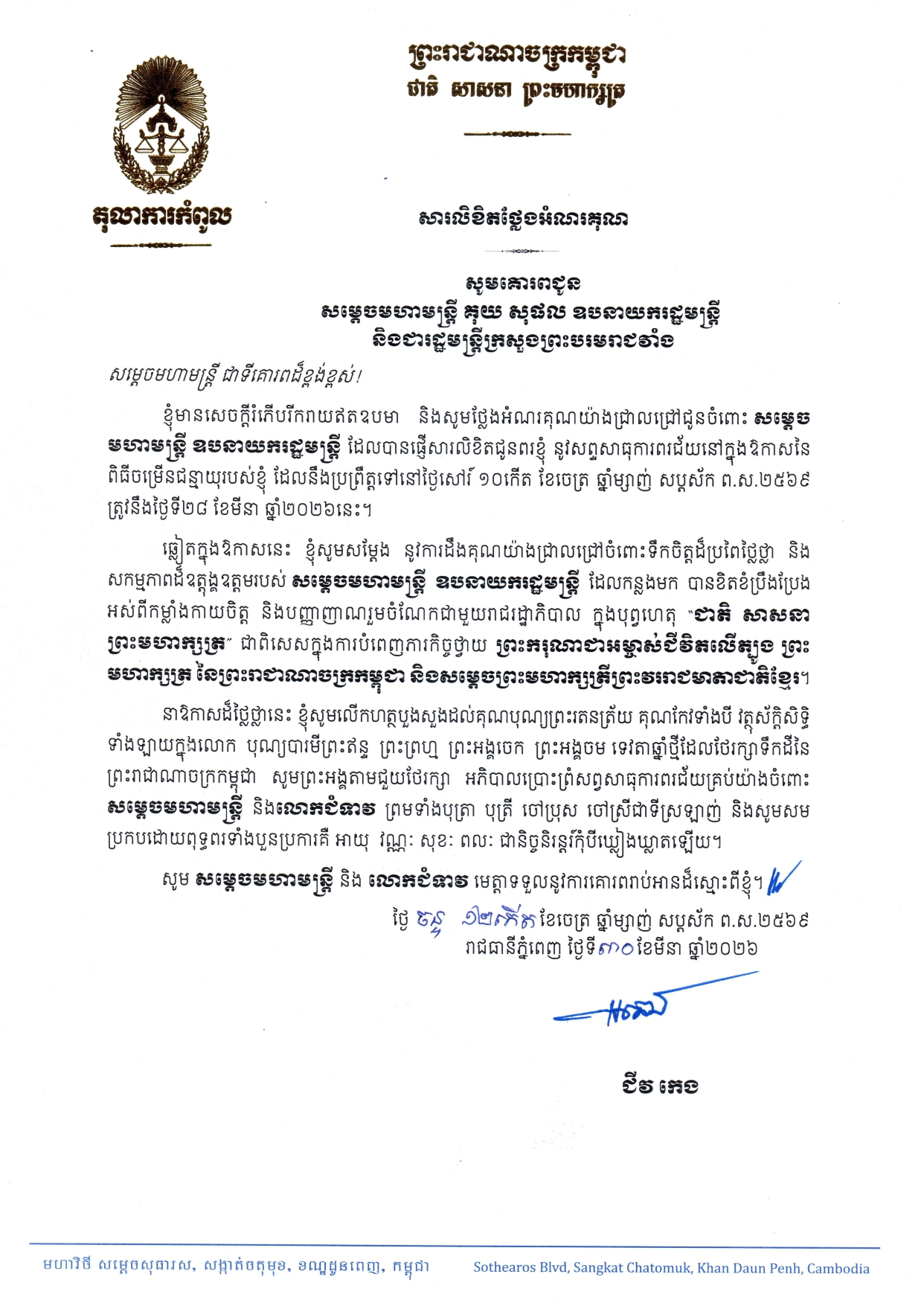 ក្នុងលិខិតថ្លែងអំណរគុណ បានសរសេរថា «ខ្ញុំមានសេចក្តីរំភើបរីករាយឥតឧបមា និងសូមថ្លែងអំណរគុណយ៉ាងជ្រាលជ្រៅជូនចំពោះ សម្តេច មហាមន្ត្រី ឧបនាយករដ្ឋមន្ត្រី ដែលបានផ្ញើសារលិខិតជូនពរខ្ញុំ នូវសព្ទសាធុការពរជ័យនៅក្នុងឱកាសនៃ ពិធីចម្រើនជន្មាយុរបស់ខ្ញុំ ដែលនឹងប្រព្រឹត្តទៅនៅថ្ងៃសៅរ៍ ១០កើត ខែចេត្រ ឆ្នាំម្សាញ់ សប្តស័ក ព.ស.២៥៦៩ ត្រូវនឹងថ្ងៃទី២៨ ខែមីនា ឆ្នាំ២០២៦នេះ។