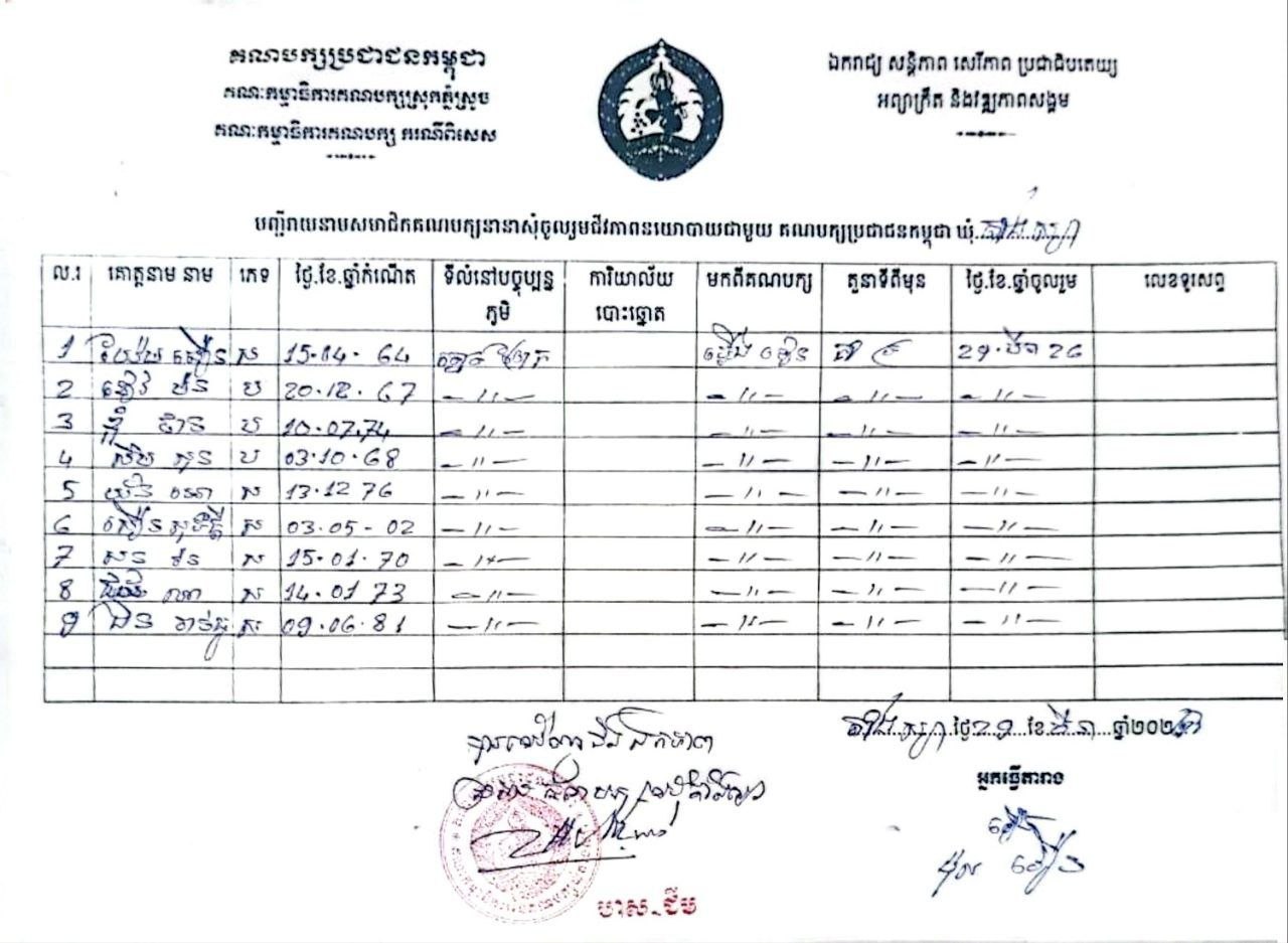 ភ្នាក់ងារសង្កេតការណ៍និងសកម្មជនគាំទ្រ គណបក្សភ្លើងទៀន ចំនួន១៤រូប បានស្ម័គ្រចិត្តចូលមករួមរស់ជីវភាពនយោបាយជាមួយគណបក្សប្រជាជនកម្ពុជា តាមរយៈក្រុមការងារចលនាកសាងសមាជិកគណបក្ស នៅមូលដ្ឋានខេត្តកំពង់ស្ពឺ ដែលដឹកនាំដោយ លោក ទី ប៊ុនថេង ឥតមានការបង្ខិតបង្ខំ ឬទិញដូរអ្វីឡើយ។