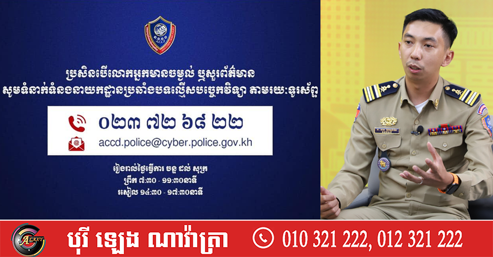 (ភ្នំពេញ)៖ លោកវរសេនីយ៍ទោ ឆាយ ប៊ុនរម្យម៉ានិត នាយការិយាល័យប្រឆាំងបទល្មើសសង្គមបច្ចេកវិទ្យា បានបញ្ជាក់ឲ្យដឹងថា នាយកដ្ឋានប្រឆាំងបទល្មើសបច្ចេកវិទ្យា មានយន្តការច្បាស់លាស់ ក្នុងការទទួលពាក្យបណ្តឹងពីប្រជាពលរដ្ឋទាំងផ្ទាល់ និងតាមអនឡាញ។