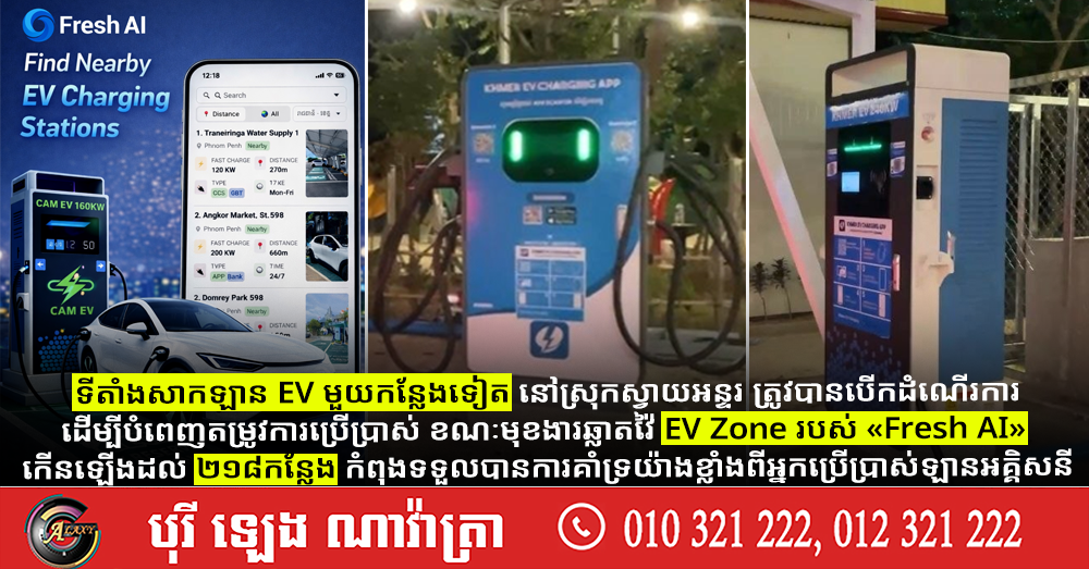 ទីតាំងសាកឡាន EV មួយកន្លែងទៀត នៅស្រុកស្វាយអន្ទរ ត្រូវបានបើកដំណើរការដើម្បីបំពេញតម្រូវការប្រើប្រាស់ ខណៈមុខងារឆ្លាតវ៉ៃ EV Zone របស់ «Fresh AI» កើនឡើងដល់ ២១៨កន្លែង កំពុងទទួលបានការគាំទ្រយ៉ាងខ្លាំងពីអ្នកប្រើប្រាស់ឡានអគ្គិសនី (Video inside)