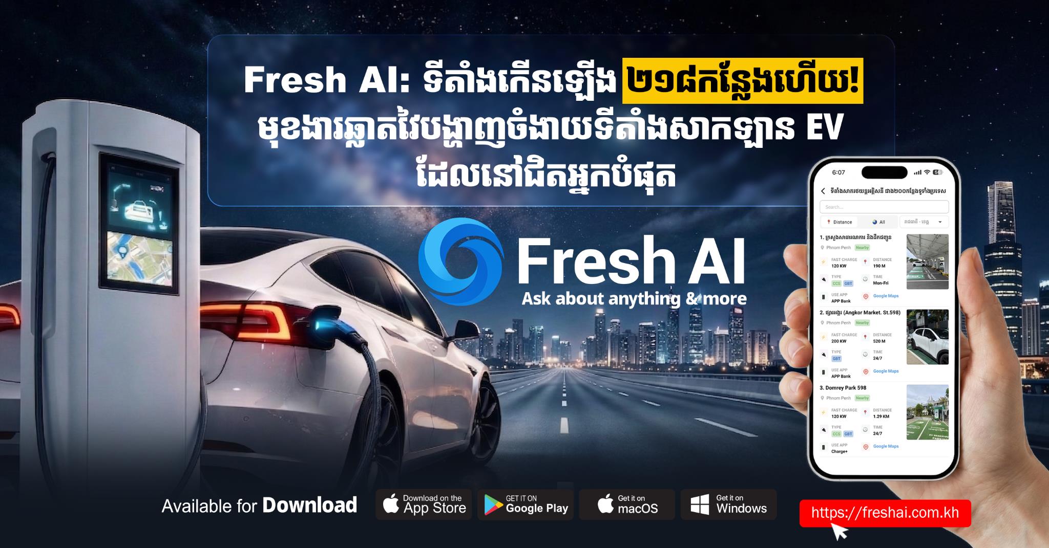 ដើម្បីឆ្លើយតបទៅនឹងកំណើននៃការប្រើប្រាស់រថយន្តអគ្គិសនី EV នៅក្នុងប្រទេសកម្ពុជា Fresh AI បានដាក់ចេញនូវមុខងារឆ្លាតវៃ EV Zone ដែលមានទីតាំង សាកថាមពលអគ្គីសនីចំនួន ២១៨កន្លែង គឺកំពុងទទួលបានការគាំទ្រពេញទំហឹងពីសំណាក់អ្នកប្រើប្រាស់ឡានអគ្គិសនី។