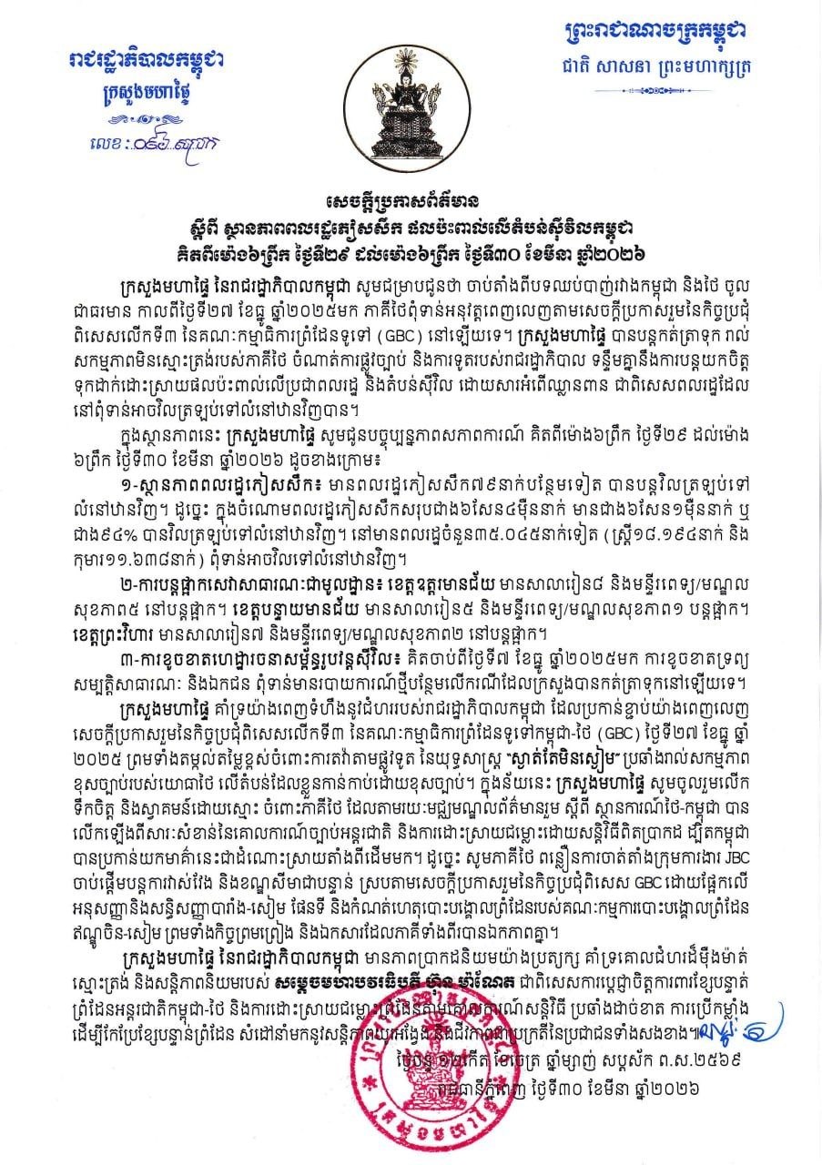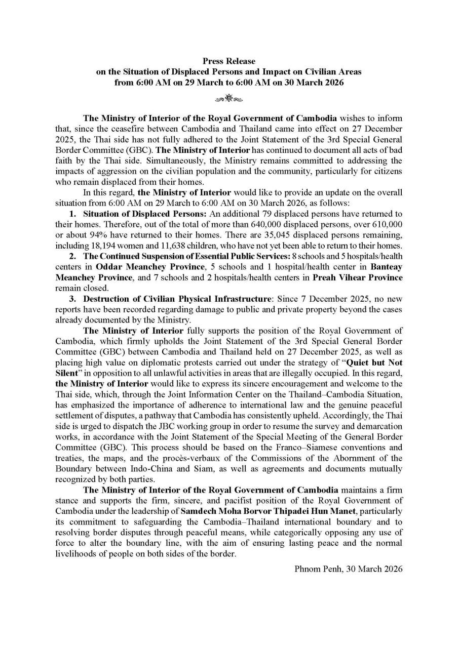 (ភ្នំពេញ)៖ ក្រសួងមហាផ្ទៃ នៅថ្ងៃទី៣០ ខែមីនា ឆ្នាំ២០២៦នេះ បានឲ្យដឹងថា គិតចាប់ពីម៉ោង ៦ព្រឹក ថ្ងៃទី២៩ ដល់ម៉ោង៦ព្រឹក ថ្ងៃទី៣០ ខែមីនា ឆ្នាំ២០២៦នេះ មានប្រជាពលរដ្ឋភៀសសឹក ៧៩នាក់បន្ថែមទៀត បានវិលត្រឡប់ទៅលំនៅឋានវិញ។ ដូច្នេះក្នុងចំណោមពលរដ្ឋភៀសសឹក សរុបជាង៦សែន ៤ម៉ឺននាក់ មានជាង ៦សែន ១ម៉ឺននាក់ ស្មើជាង ៩៤ភាគរយ បានវិលត្រឡប់ទៅលំនៅឋានវិញ។