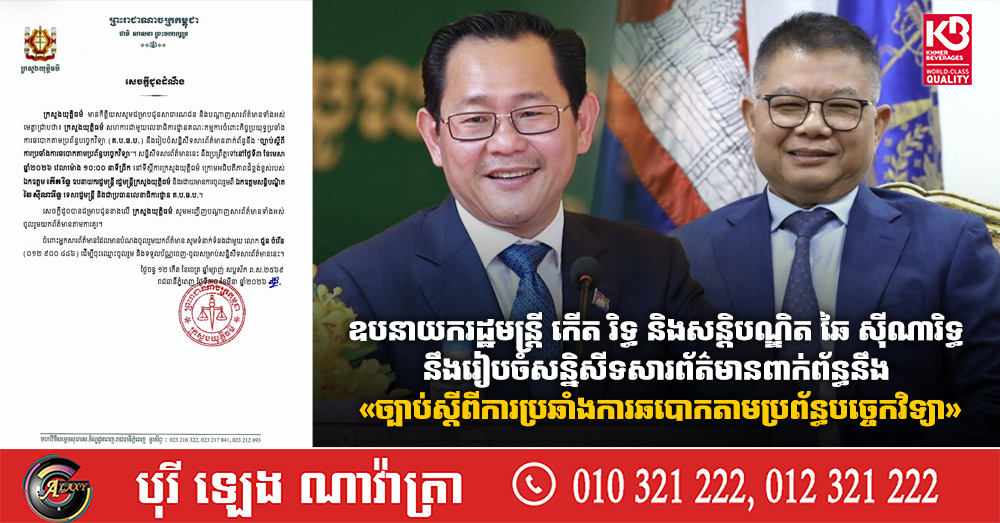 ឧបនាយករដ្ឋមន្រ្តី កើត រិទ្ធ និងសន្តិបណ្ឌិត ឆៃ ស៊ីណារិទ្ធ នឹងរៀបចំសន្និសីទសារព័ត៌មានពាក់ព័ន្ធនឹង «ច្បាប់ស្តីពីការប្រឆាំងការឆបោកតាមប្រព័ន្ធបច្ចេកវិទ្យា»