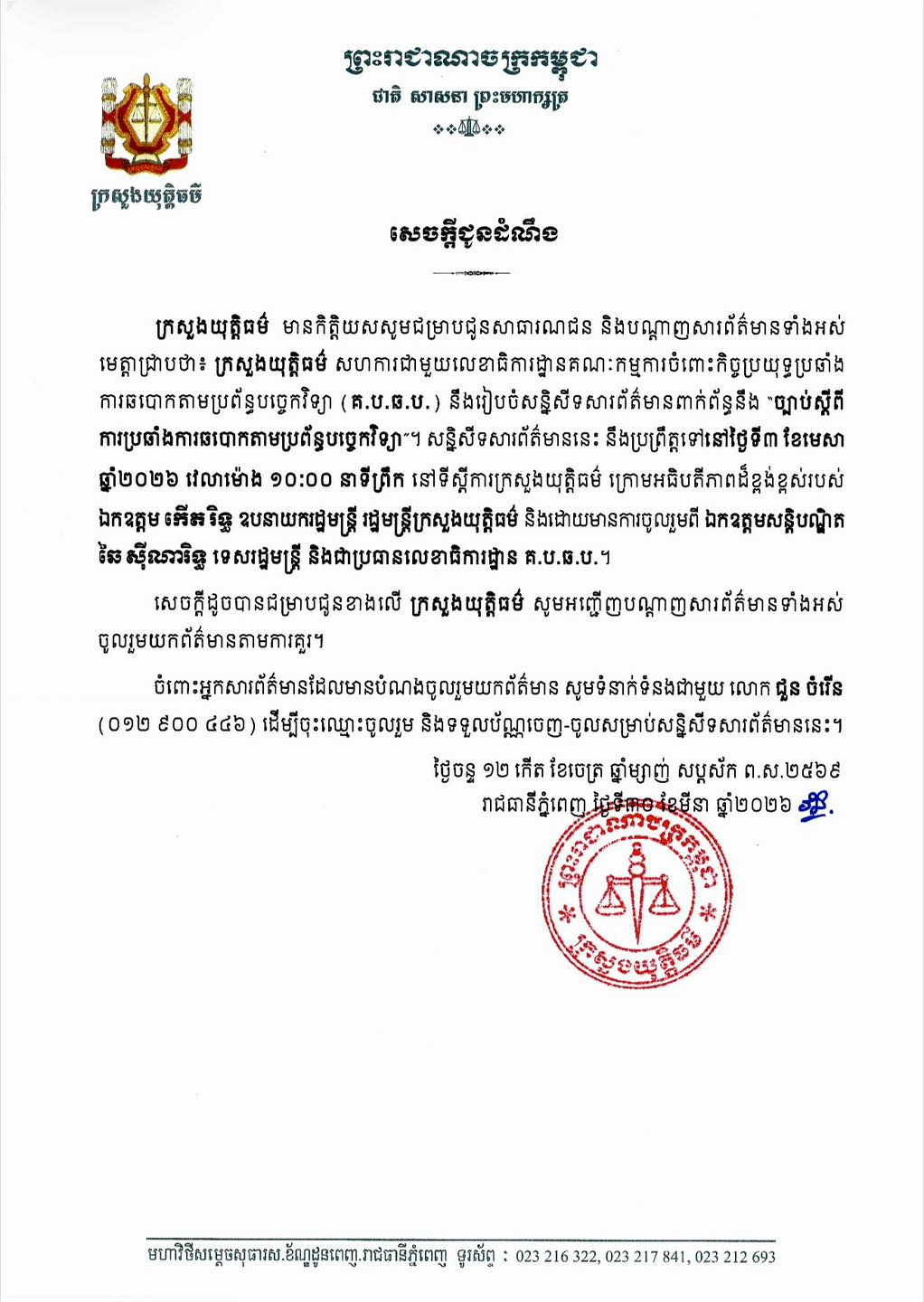 (ភ្នំពេញ)៖ ឧបនាយករដ្ឋមន្ត្រី កើត រិទ្ធ រដ្ឋមន្ត្រីក្រសួងយុត្តិធម៌ និងលោកសន្តិបណ្ឌិត ឆៃ ស៊ីណារិទ្ធ ទេសរដ្ឋមន្ត្រី និងជាប្រធានលេខាធិការដ្ឋាន គ.ប.ឆ.ប នឹងធ្វើសន្និសីទសារព័ត៌មាននេះ នៅថ្ងៃទី៣ ខែមេសា ឆ្នាំ២០២៦ វេលាម៉ោង ១០:០០ នាទីព្រឹក នៅទីស្តីការក្រសួងយុត្តិធម៌។