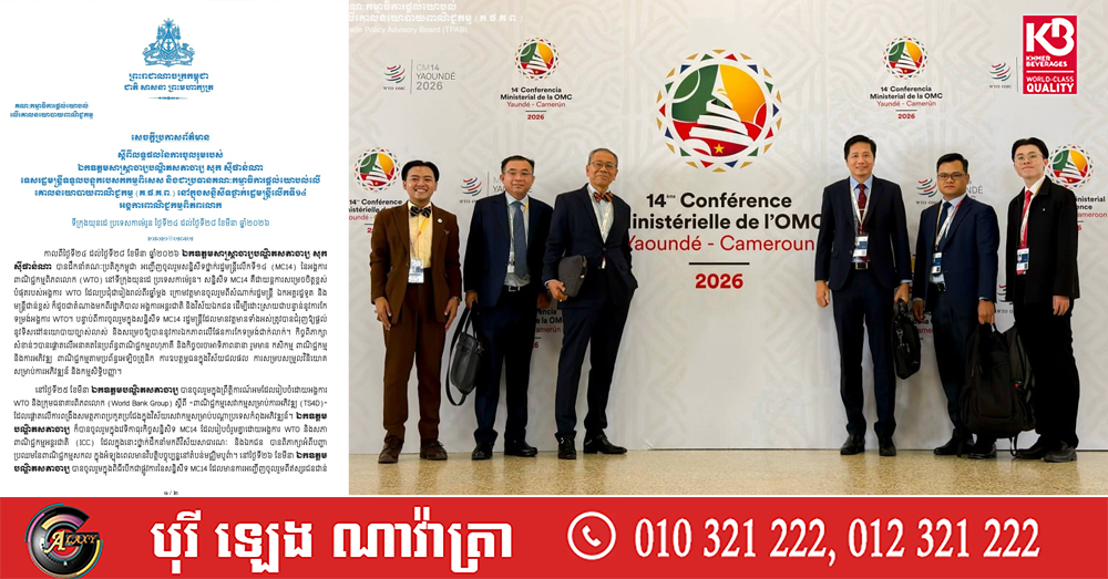 (កាម៉េរូន)៖ លោកសាស្ត្រាចារ្យបណ្ឌិតសភាចារ្យ សុក ស៊ីផាន់ណា កាលពីថ្ងៃទី២៤ ដល់ថ្ងៃទី២៨ ខែមីនា ឆ្នាំ២០២៦ បានដឹកនាំគណៈប្រតិភូកម្ពុជា អញ្ជើញចូលរួមសន្និសីទ ថ្នាក់រដ្ឋមន្ត្រីលើកទី១៤ (MC14) នៃអង្គការ ពាណិជ្ជកម្មពិភពលោក (WTO) នៅទីក្រុងយុនដេ ប្រទេសកាម៉េរូន។