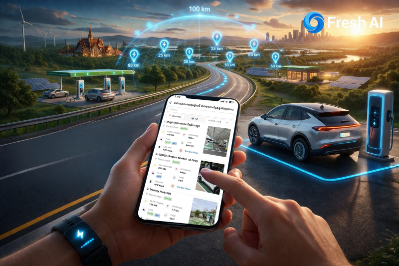 សម្រាប់អ្នកដែលកំពុងប្រើប្រាស់រថយន្តអគ្គិសនី ការមាន Fresh AI ជាប់នឹងទូរស័ព្ទ គឺប្រៀបដូចជាមានជំនួយការដ៏វៃឆ្លាតមួយ ដែលចាំផ្ដល់ព័ត៌មានអំពីទីតាំងសាកថាមពលនៅគ្រប់ទីកន្លែង និងគ្រប់ពេលវេលា៕