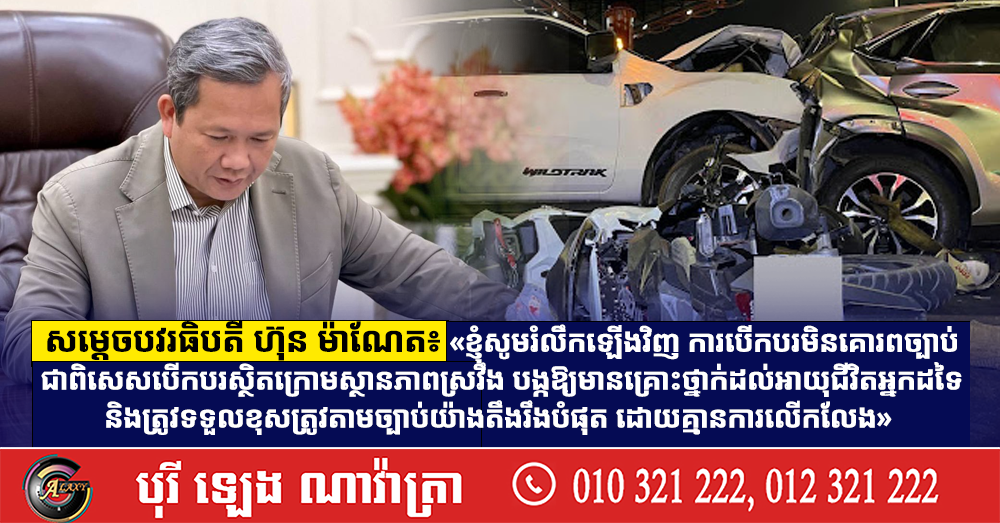 សម្តេចបវរធិបតី ហ៊ុន ម៉ាណែត៖ «ខ្ញុំសូមរំលឹកឡើងវិញ ការបើកបរមិនគោរពច្បាប់ ជាពិសេសបើកបរស្ថិតក្រោមស្ថានភាពស្រវឹង បង្កឱ្យមានគ្រោះថ្នាក់ដល់អាយុជីវិតអ្នកដទៃ និងត្រូវទទួលខុសត្រូវតាមច្បាប់យ៉ាងតឹងរឹងបំផុត ដោយគ្មានការលើកលែង» (Video inside)