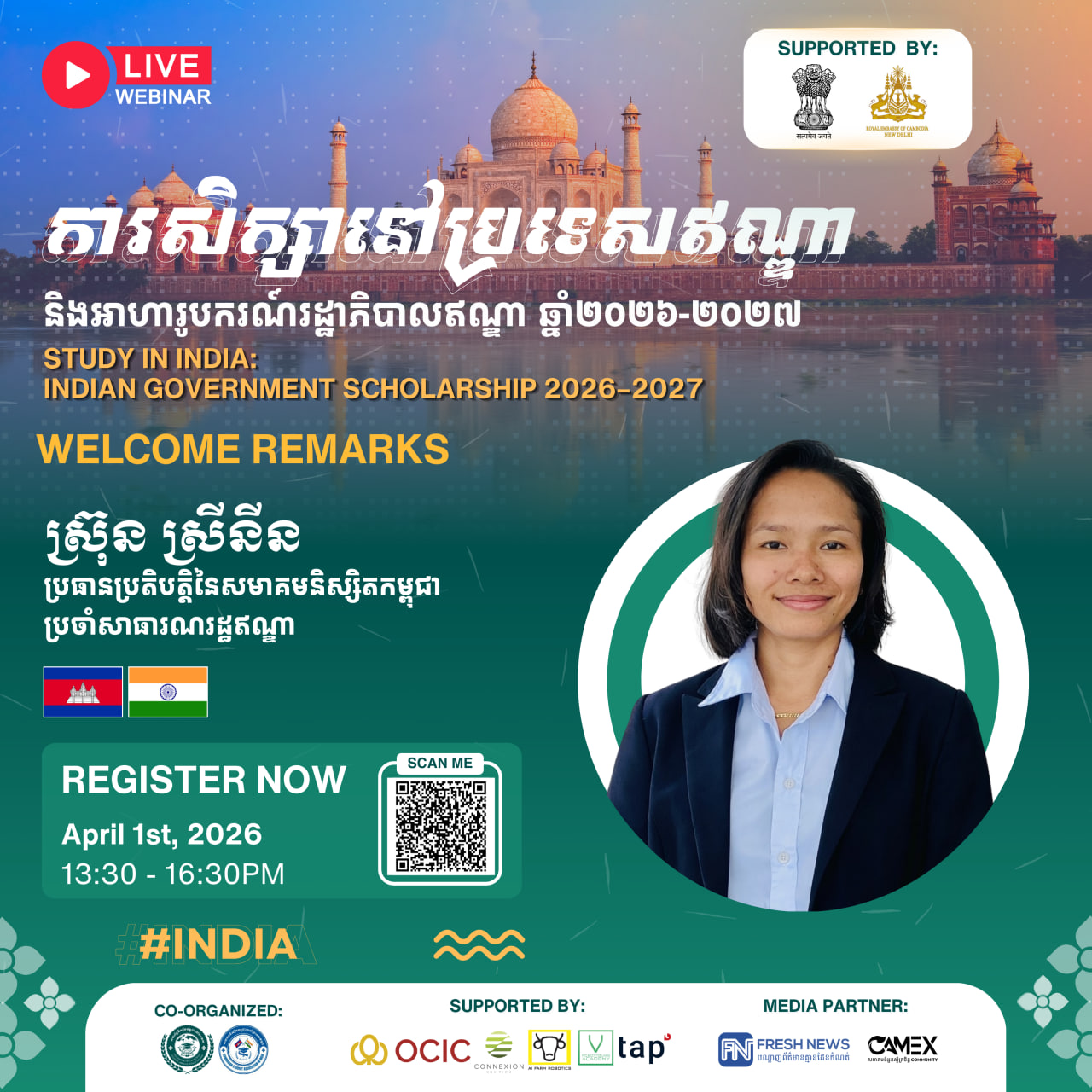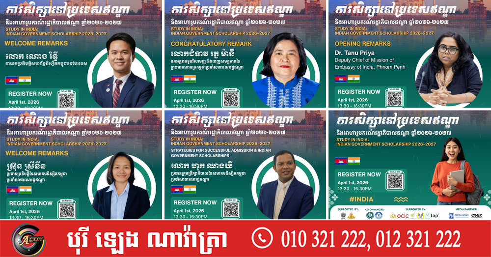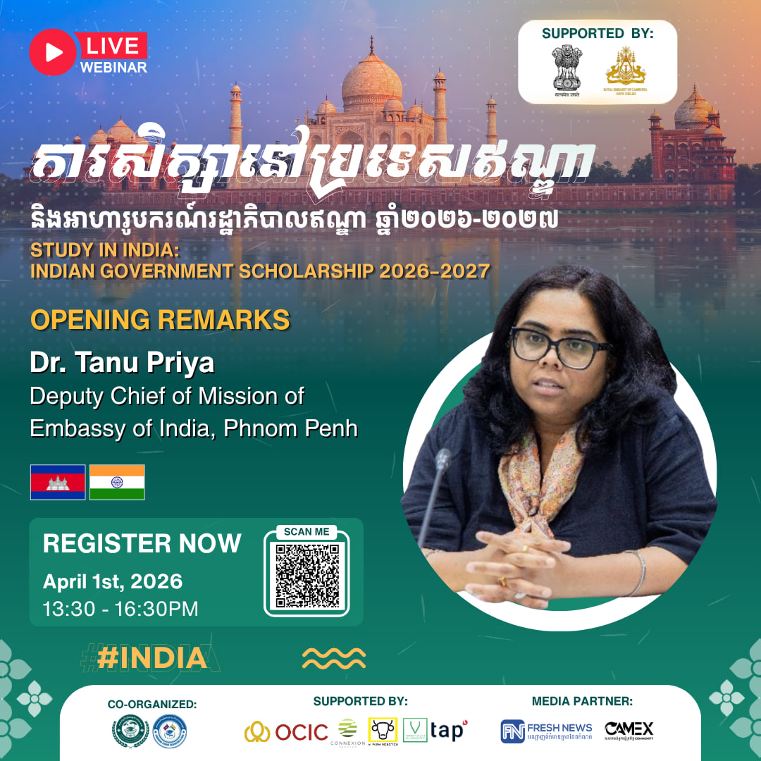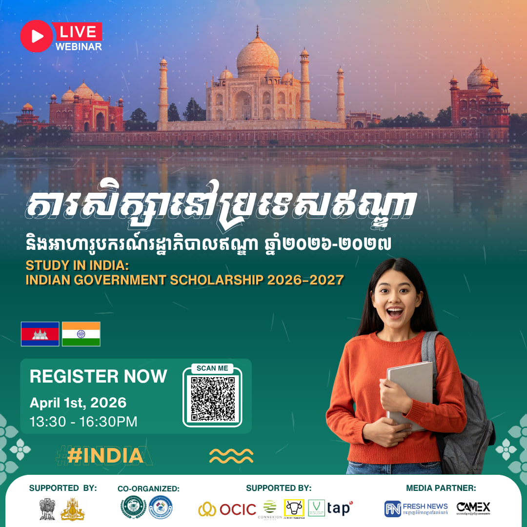 (ភ្នំពេញ)៖ សហព័ន្ធនិស្សិតកម្ពុជានៅបរទេស (CamStudent) សហការជាមួយ សមាគមនិស្សិតកម្ពុជាប្រចាំនៅប្រទេសឥណ្ឌា (CamSai) ដោយមានការគាំទ្រពីស្ថានទូតឥណ្ឌាប្រចាំកម្ពុជា និងស្ថានទូតកម្ពុជាប្រចាំប្រទេសឥណ្ឌា នឹងរៀបចំសិក្ខាសាលាអនឡាញមួយក្រោមប្រធានបទ «ការសិក្សានៅប្រទេសឥណ្ឌា និងអាហារូបករណ៍រដ្ឋាភិបាលឥណ្ឌា ២០២៦-២០២៧» នៅថ្ងៃទី0១ ខែមេសា ឆ្នាំ២០២៦ នាម៉ោង១៖៣០រសៀល ដល់ ៤៖៣០ល្ងាច (ម៉ោងនៅកម្ពុជា)។