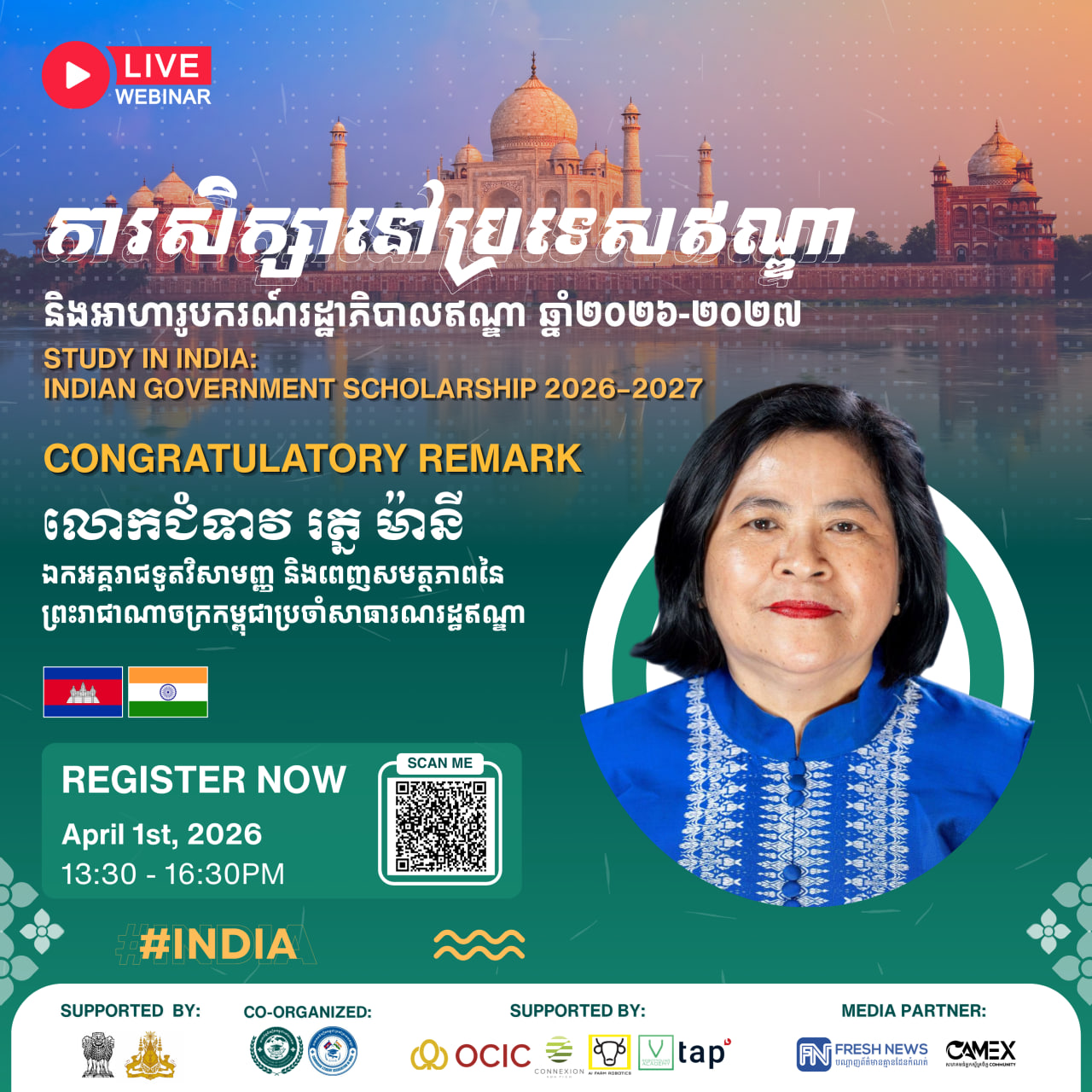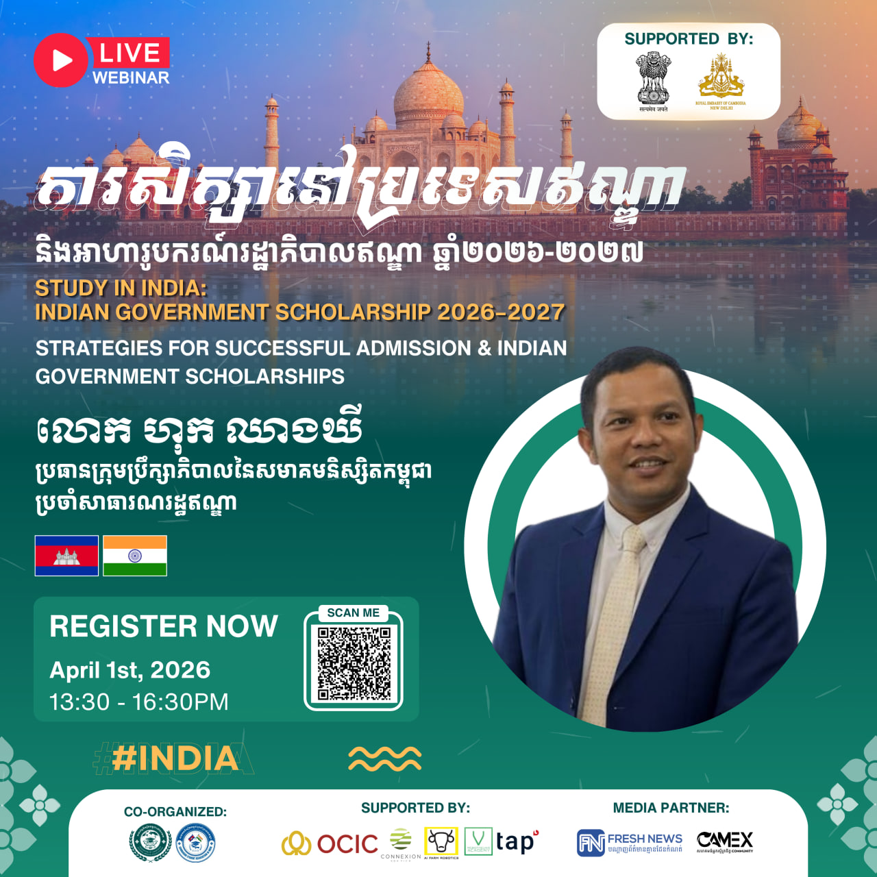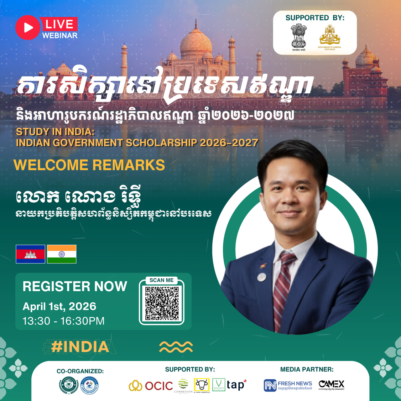 (ភ្នំពេញ)៖ សហព័ន្ធនិស្សិតកម្ពុជានៅបរទេស (CamStudent) សហការជាមួយ សមាគមនិស្សិតកម្ពុជាប្រចាំនៅប្រទេសឥណ្ឌា (CamSai) ដោយមានការគាំទ្រពីស្ថានទូតឥណ្ឌាប្រចាំកម្ពុជា និងស្ថានទូតកម្ពុជាប្រចាំប្រទេសឥណ្ឌា នឹងរៀបចំសិក្ខាសាលាអនឡាញមួយក្រោមប្រធានបទ «ការសិក្សានៅប្រទេសឥណ្ឌា និងអាហារូបករណ៍រដ្ឋាភិបាលឥណ្ឌា ២០២៦-២០២៧» នៅថ្ងៃទី0១ ខែមេសា ឆ្នាំ២០២៦ នាម៉ោង១៖៣០រសៀល ដល់ ៤៖៣០ល្ងាច (ម៉ោងនៅកម្ពុជា)។