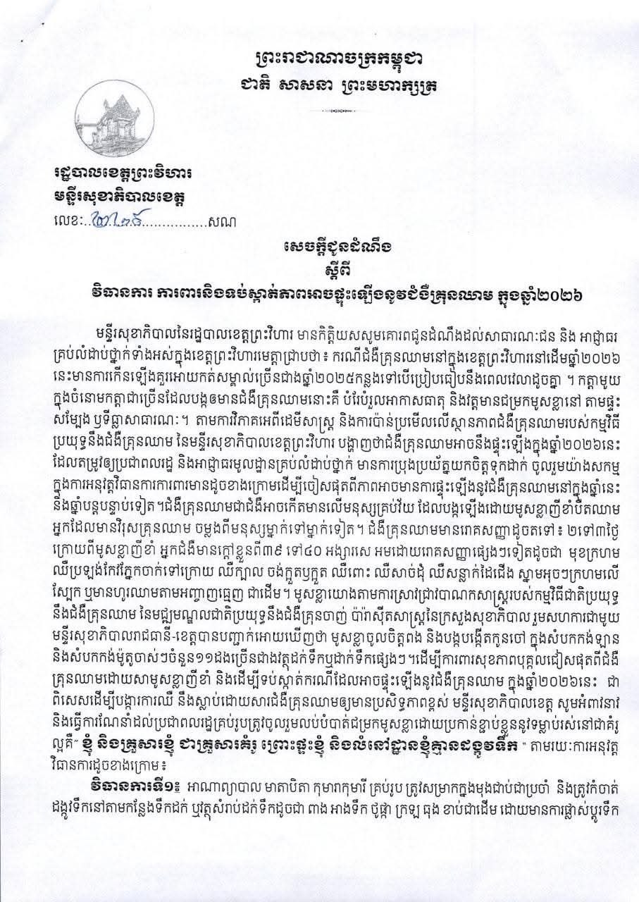 (ព្រះវិហារ)៖ មន្ទីរសុខាភិបាល នៃរដ្ឋបាលខេត្តព្រះវិហារ នៅព្រឹកថ្ងៃទី៣១ ខែមីនា ឆ្នាំ២០២៦ បានចេញសេចក្តីជូនដំណឹង ស្តីពីវិធានការ ការពារនិងទប់ស្កាត់ភាពអាចផ្ទុះឡើងនូវជំងឺគ្រុនឈាម ក្នុងឆ្នាំ២០២៦។