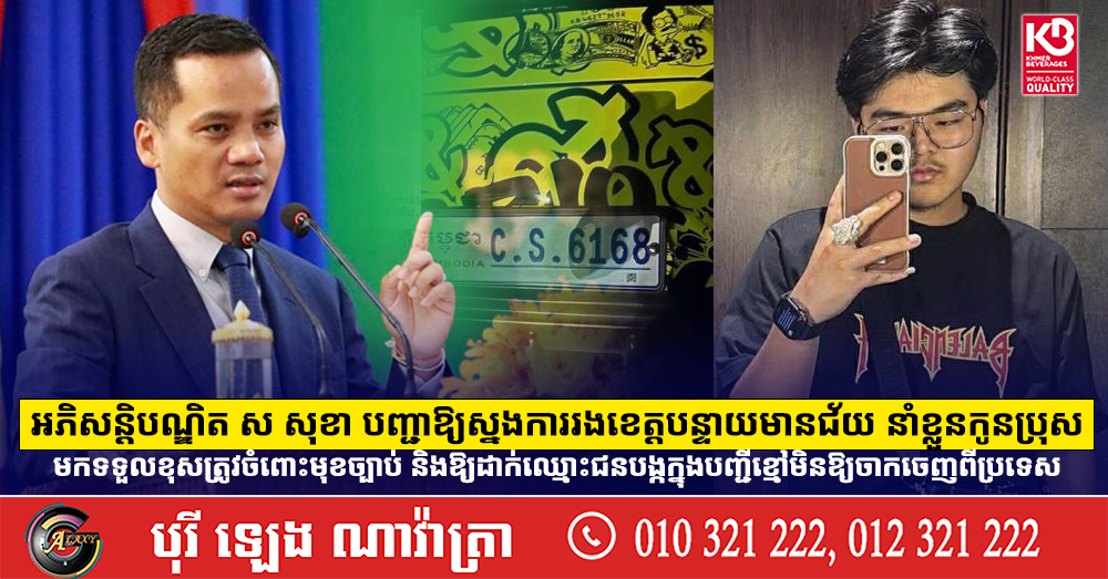 អភិសន្តិបណ្ឌិត ស សុខា បញ្ជាឱ្យស្នងការរងខេត្តបន្ទាយមានជ័យ នាំខ្លួនកូនប្រុសមកទទួលខុសត្រូវចំពោះមុខច្បាប់ និងឱ្យដាក់ឈ្មោះជនបង្កក្នុងបញ្ជីខ្មៅមិនឱ្យចាកចេញពីប្រទេស