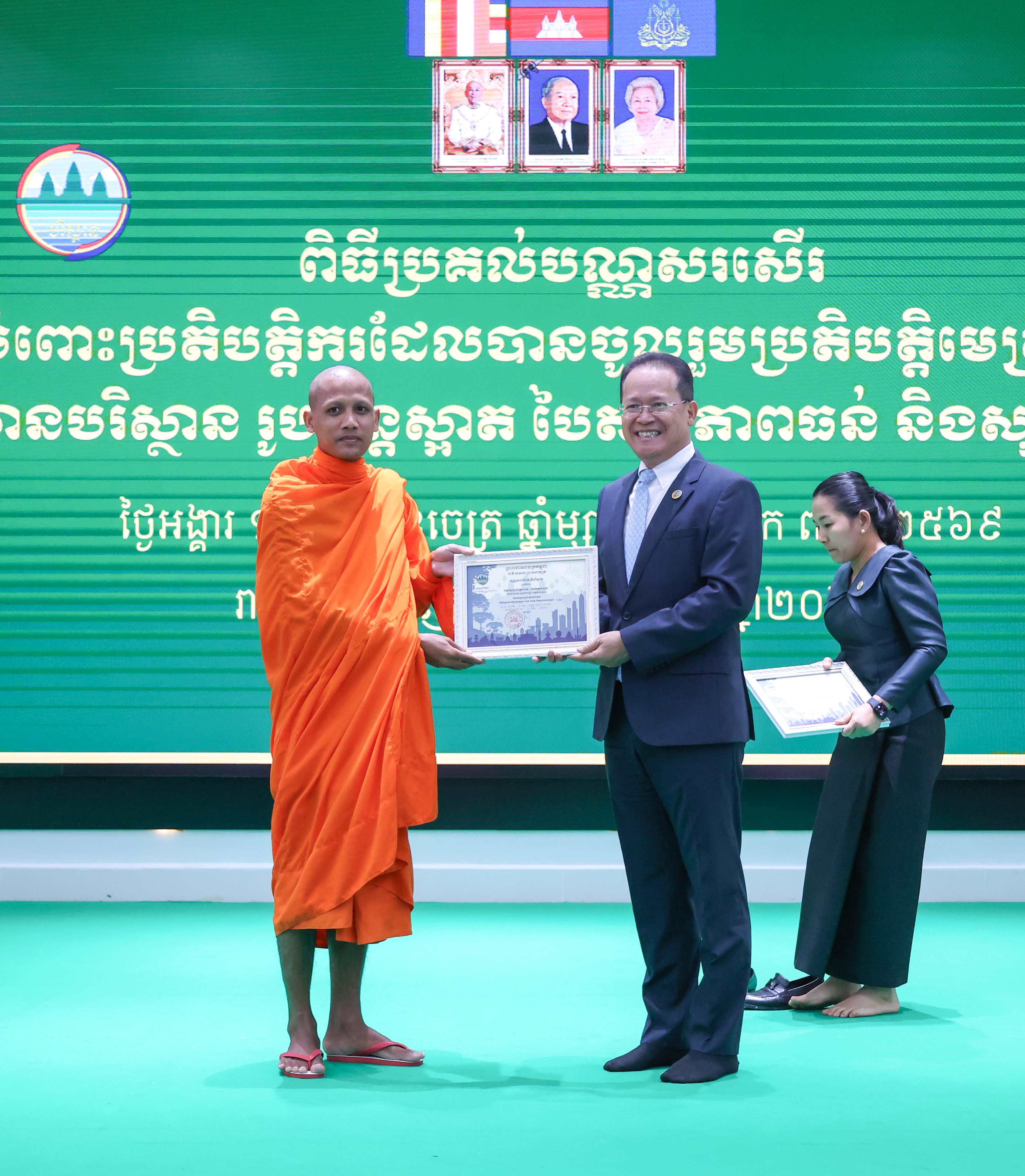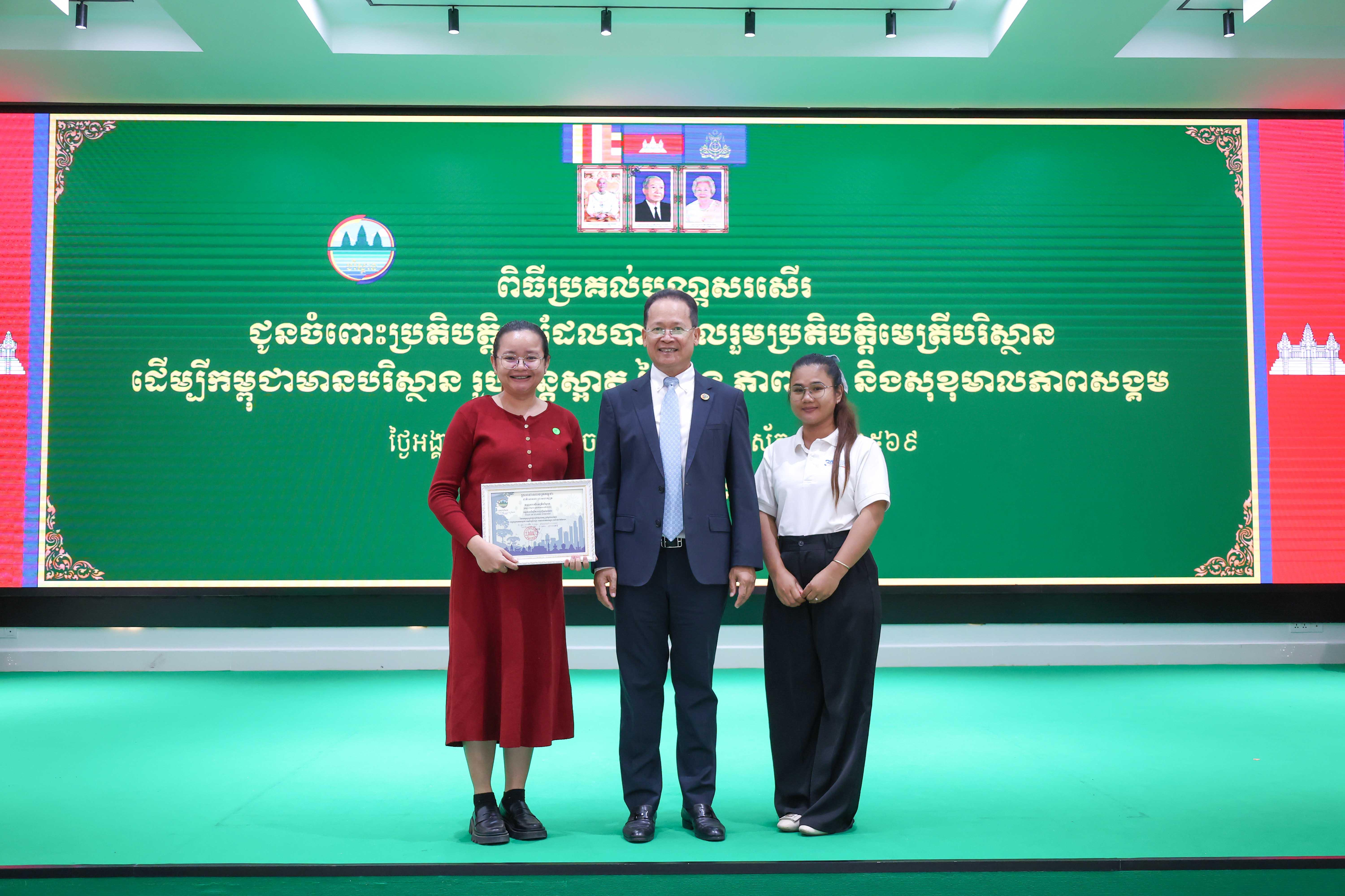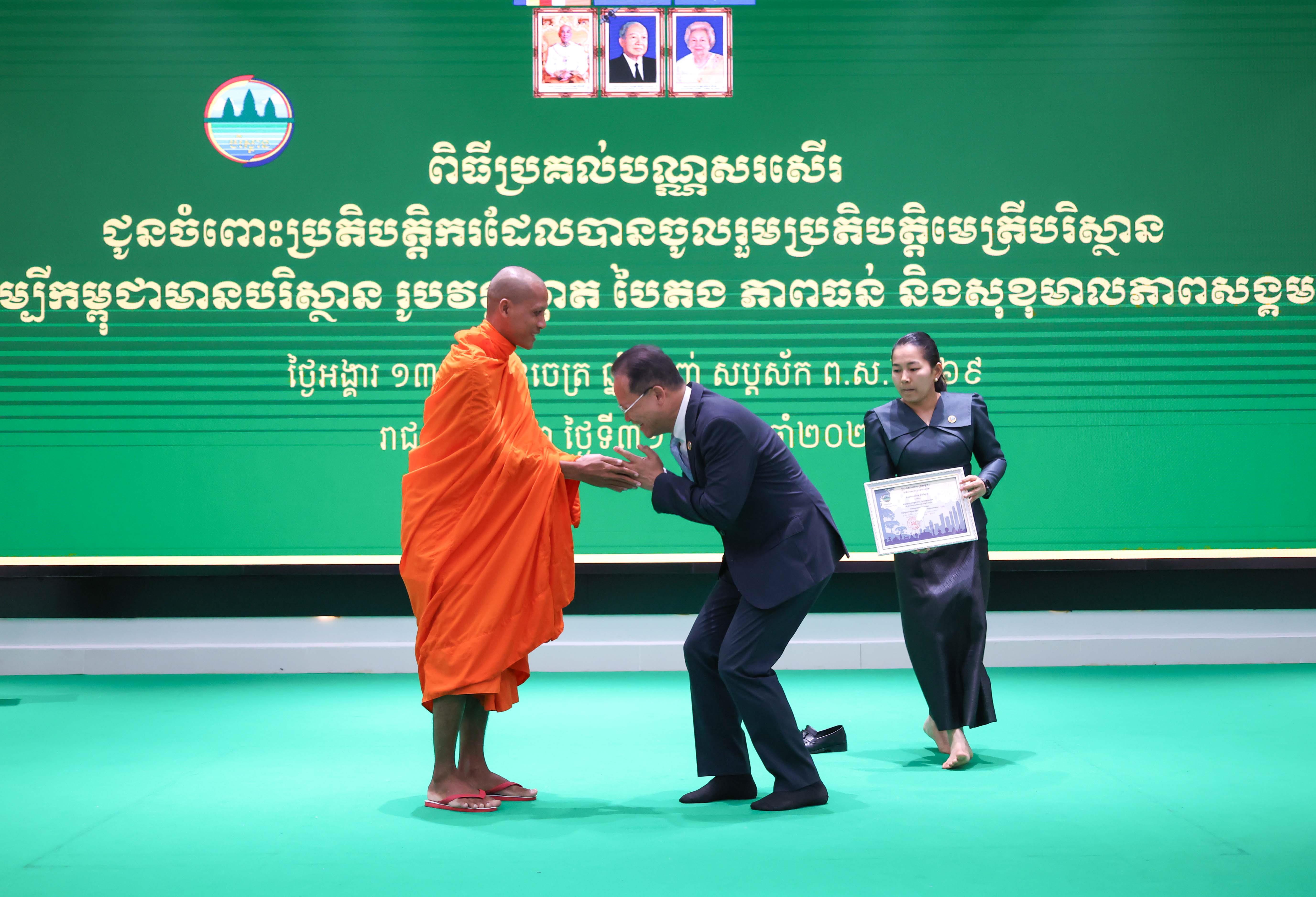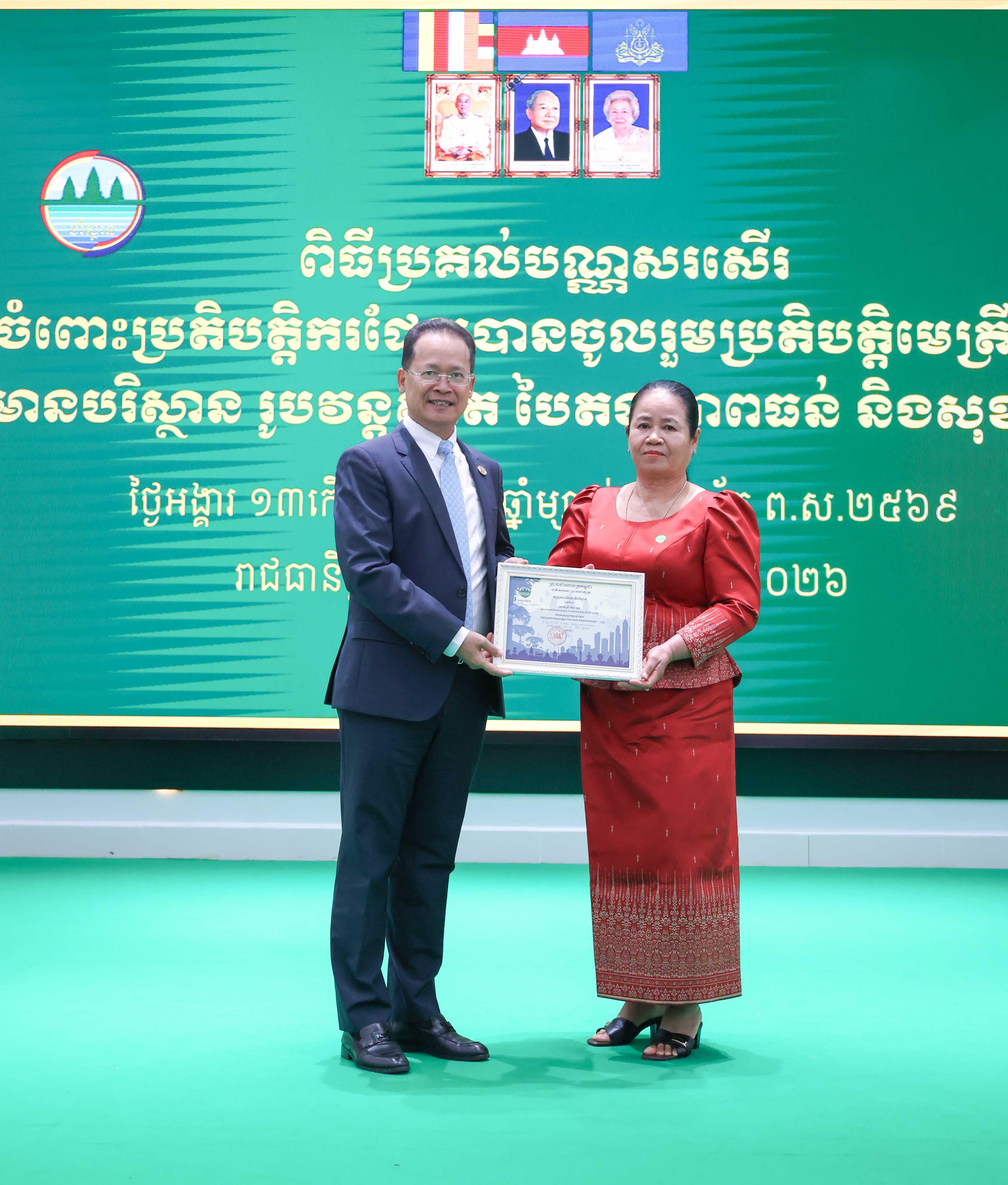 សូមបញ្ជាក់ថា ក្រុមការងារនាយកដ្ឋានរង្វាន់និងលើកទឹកចិត្ត នៃអគ្គនាយកដ្ឋានចំណេះដឹងនិងព័ត៌មានបរិស្ថាន សហការជាមួយ ក្រុមការងារវាយតម្លៃគុណវុឌ្ឍិមេត្រីបរិស្ថាន របស់មន្ទីរបរិស្ថានរាជធានី ខេត្ត បានធ្វើការវាយតម្លៃ និងជ្រើសរើសរូបវន្តបុគ្គល និងនីតិបុគ្គល ទាំងវិស័យសាធារណៈ និងវិស័យឯកជន ដែលបានប្រតិបត្តិមេត្រីបរិស្ថានបានល្អប្រសើរ ឆ្លើយតបទៅនឹងយុទ្ធសាស្ត្រចក្រាវិស័យបរិស្ថាន តាមរយៈការអនុវត្ត «ភាពស្អាត» «ភាពបៃតង» និង «ចីរភាព» ដើម្បីធានាបាននូវចីរភាពបរិស្ថាននៅកម្ពុជា បានចំនួន ៥០៣បណ្ណ និងប្រតិបត្តិករចំនួន៥៤អង្គភាព-ស្ថាប័ន និងមន្ត្រីឧទ្យានុរក្សចំនួន ៩៩រូប បានទទួលក្នុងឆ្នាំ២០២៦។