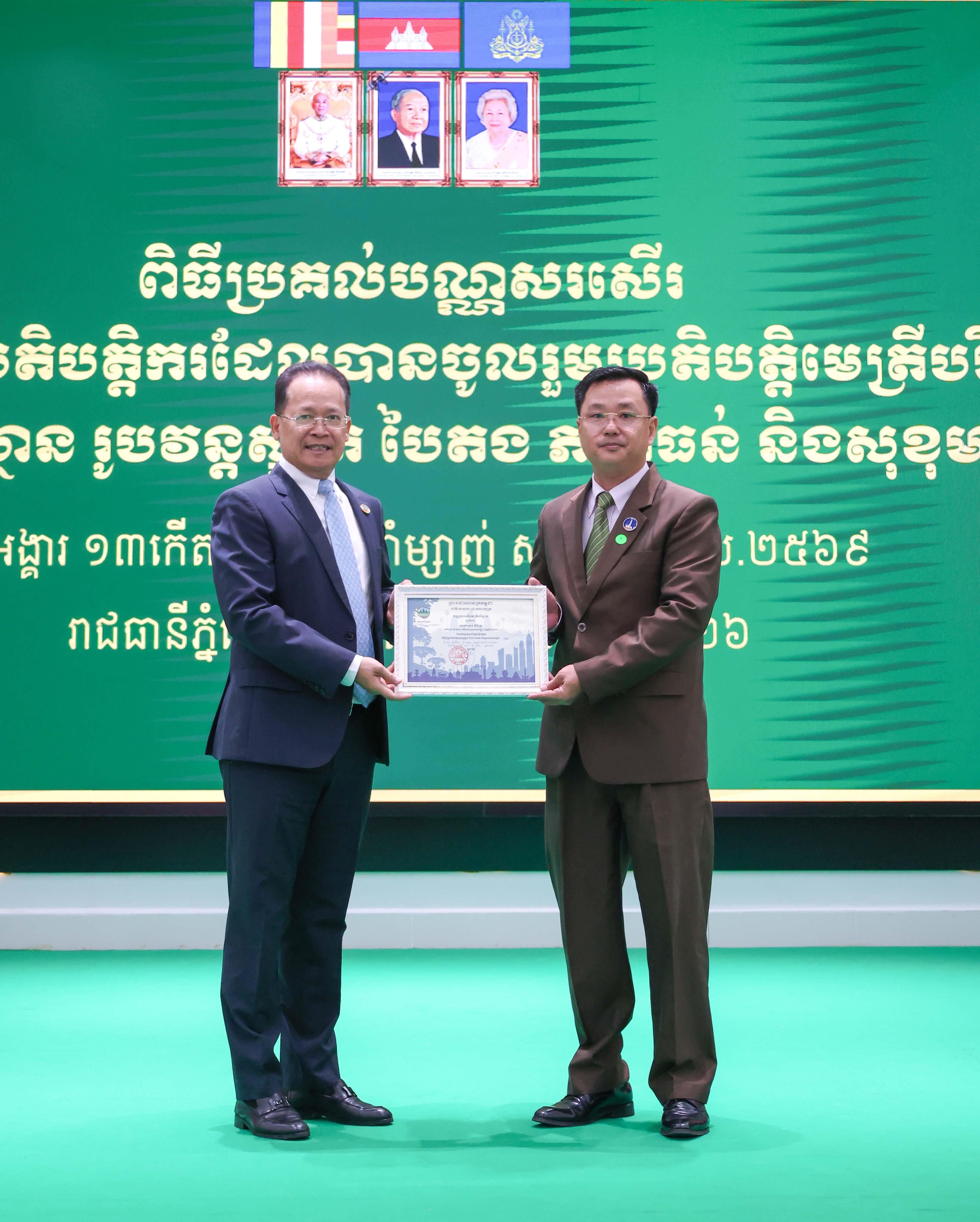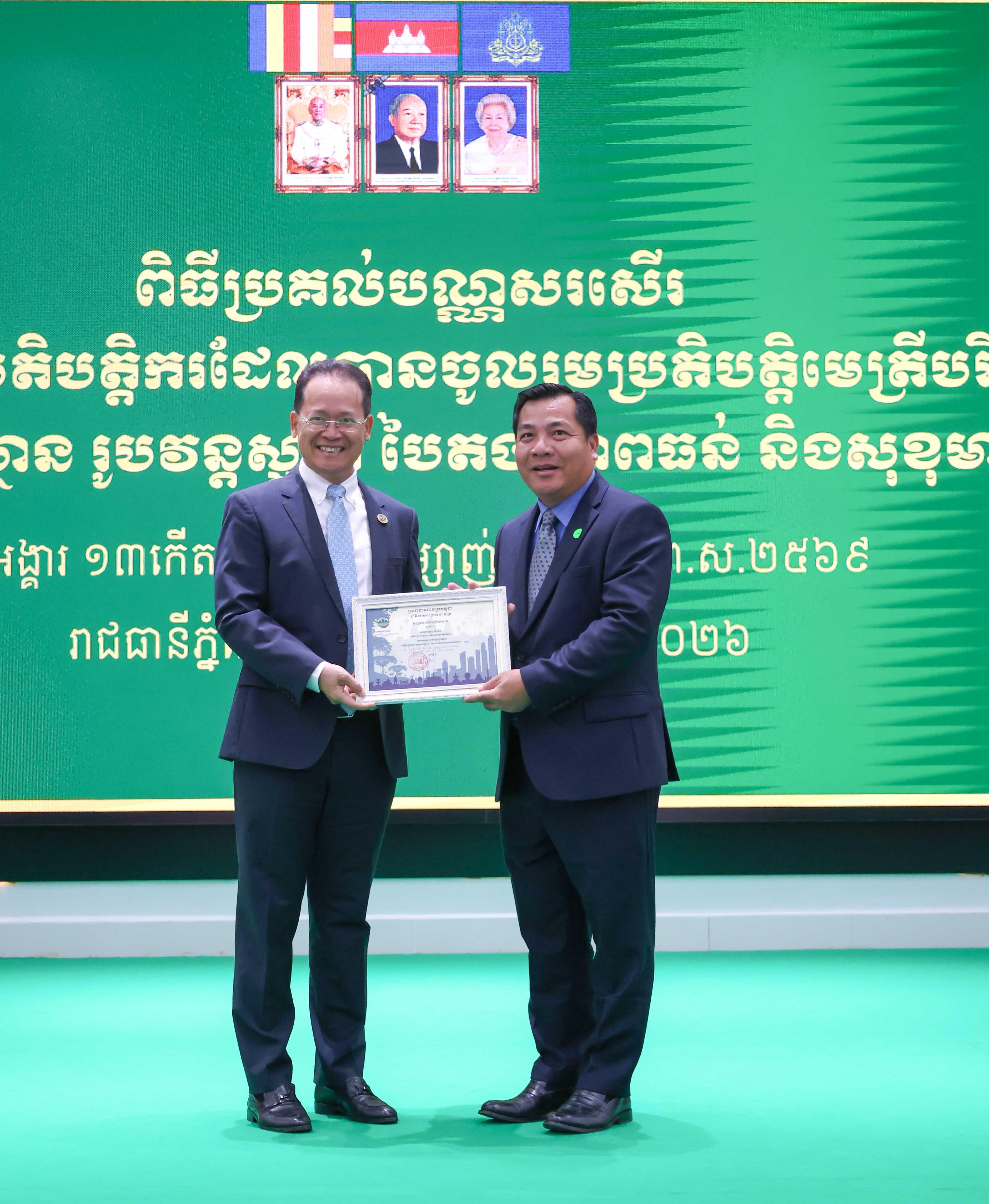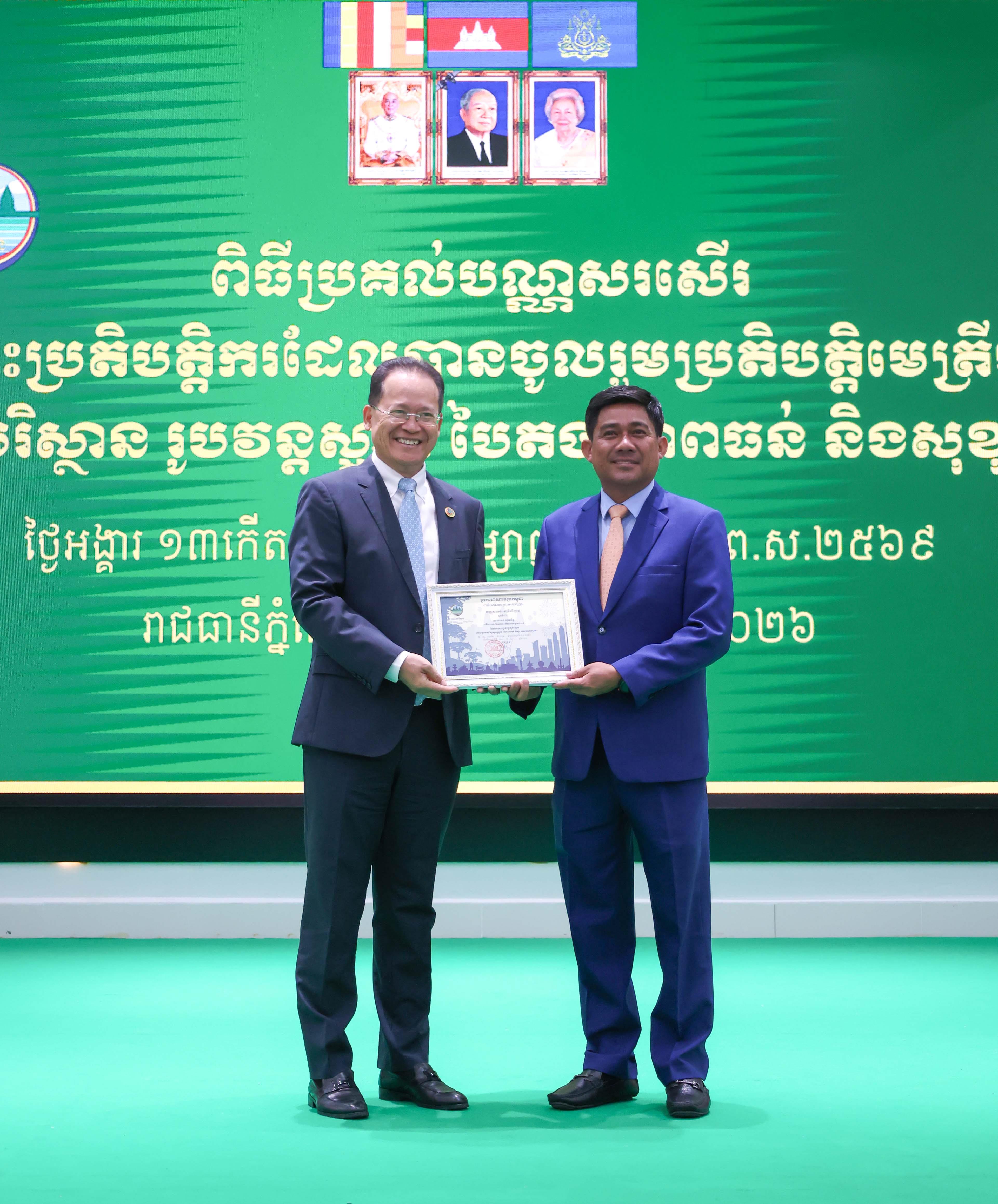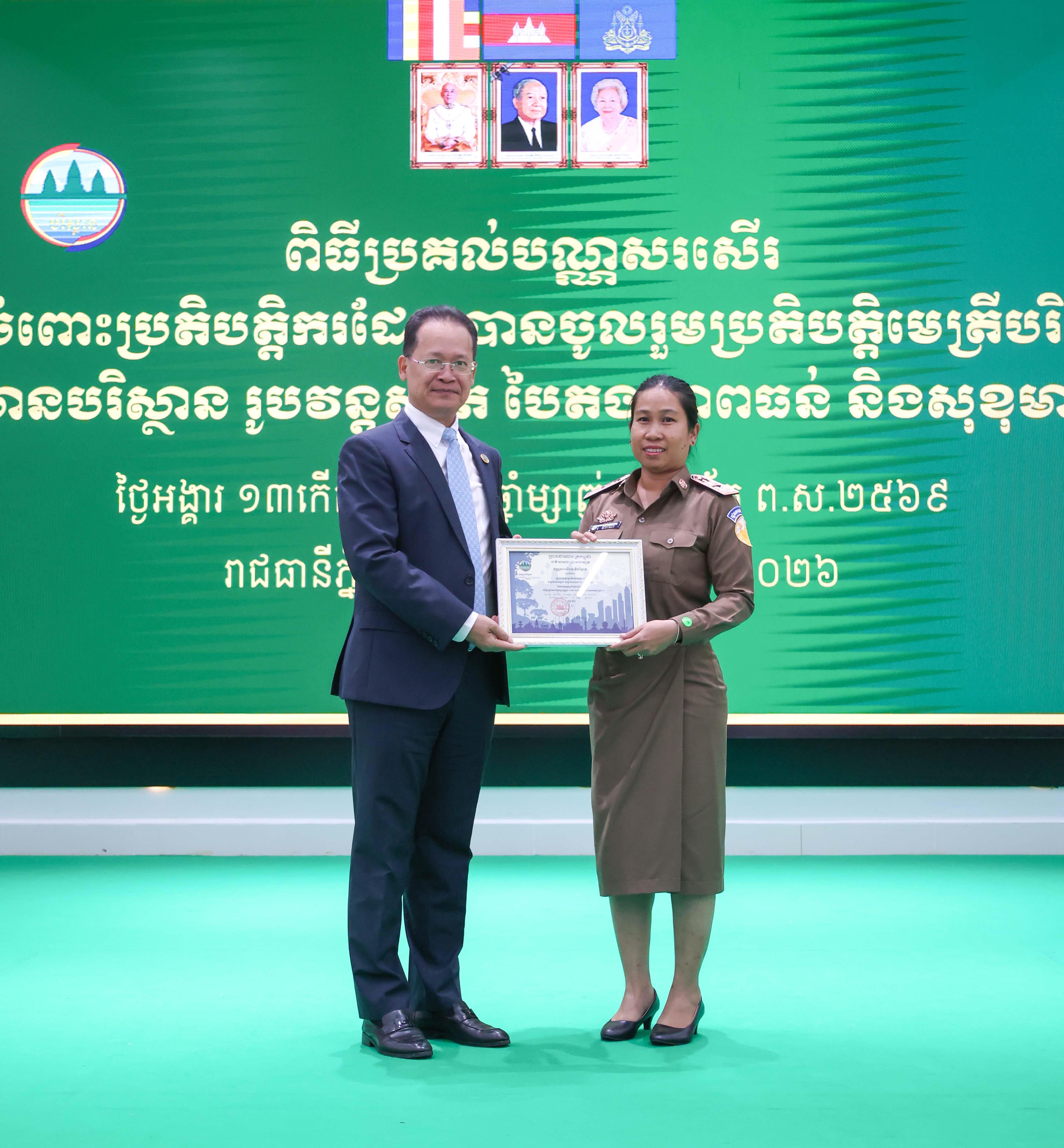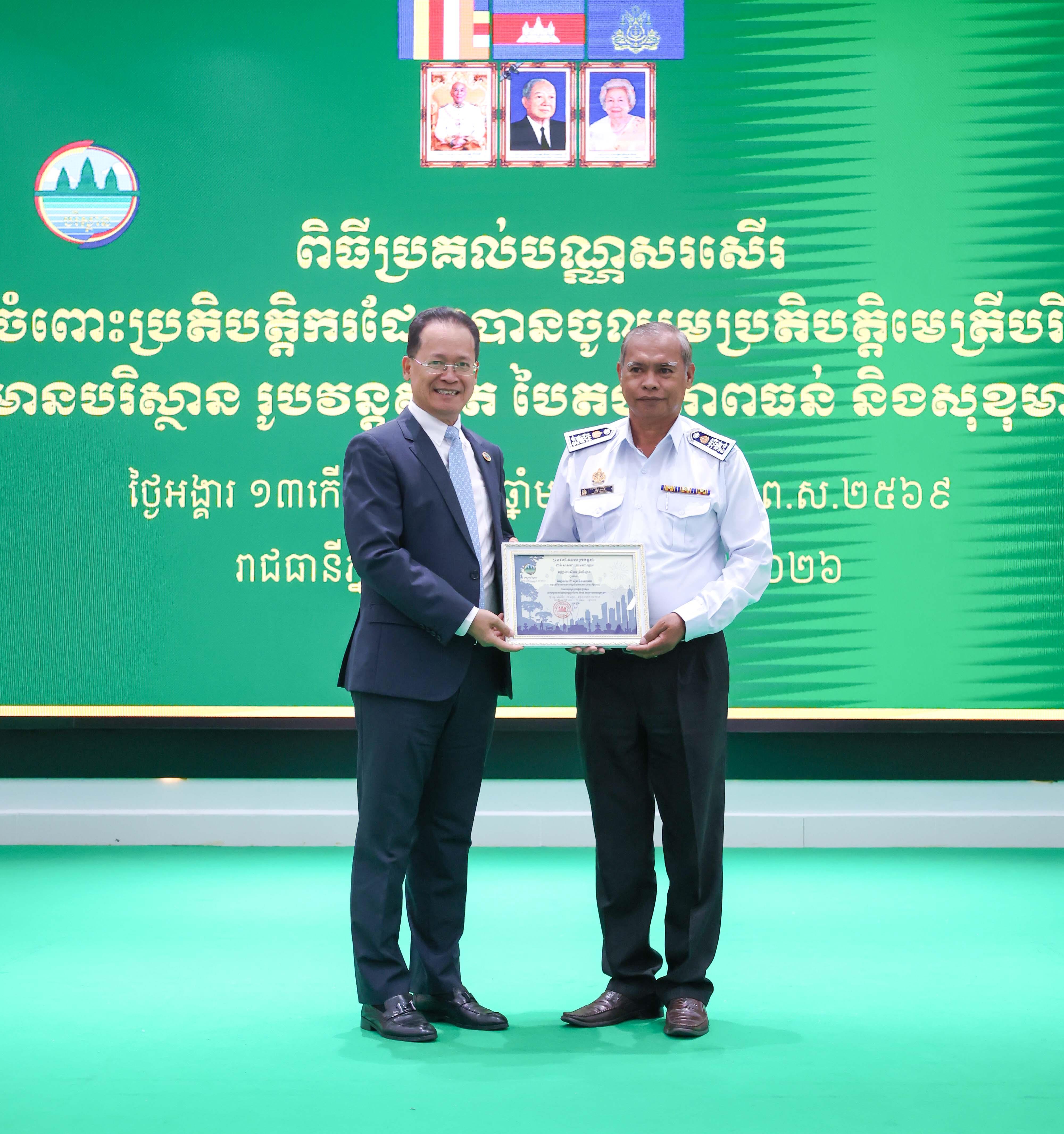 (ភ្នំពេញ)៖ ប្រតិបត្តិករចំនួន៥៤អង្គភាព-ស្ថាប័ន និងមន្ត្រីឧទ្យានុរក្សចំនួន៩៩រូប បានទទួលបណ្ណមេត្រីបរិស្ថាន ឆ្នាំ២០២៦ ដោយផ្ទាល់ពីលោកបណ្ឌិត អ៊ាង សុផល្លែត រដ្ឋមន្រ្តីក្រសួងបរិស្ថាន បន្ទាប់ពីក្រសួងបរិស្ថានពិនិត្យ និងវាយតម្លៃឃើញថាបានអនុវត្តសកម្មបានល្អ ឆ្លើយតបទៅនឹងយុទ្ធសាស្ត្រចក្រាវិស័យបរិស្ថានតាមរយៈការអនុវត្ត «ភាពស្អាត» «ភាពបៃតង» និង «ចីរភាព» ដើម្បីធានាបាននូវចីរភាពបរិស្ថាននៅកម្ពុជា។