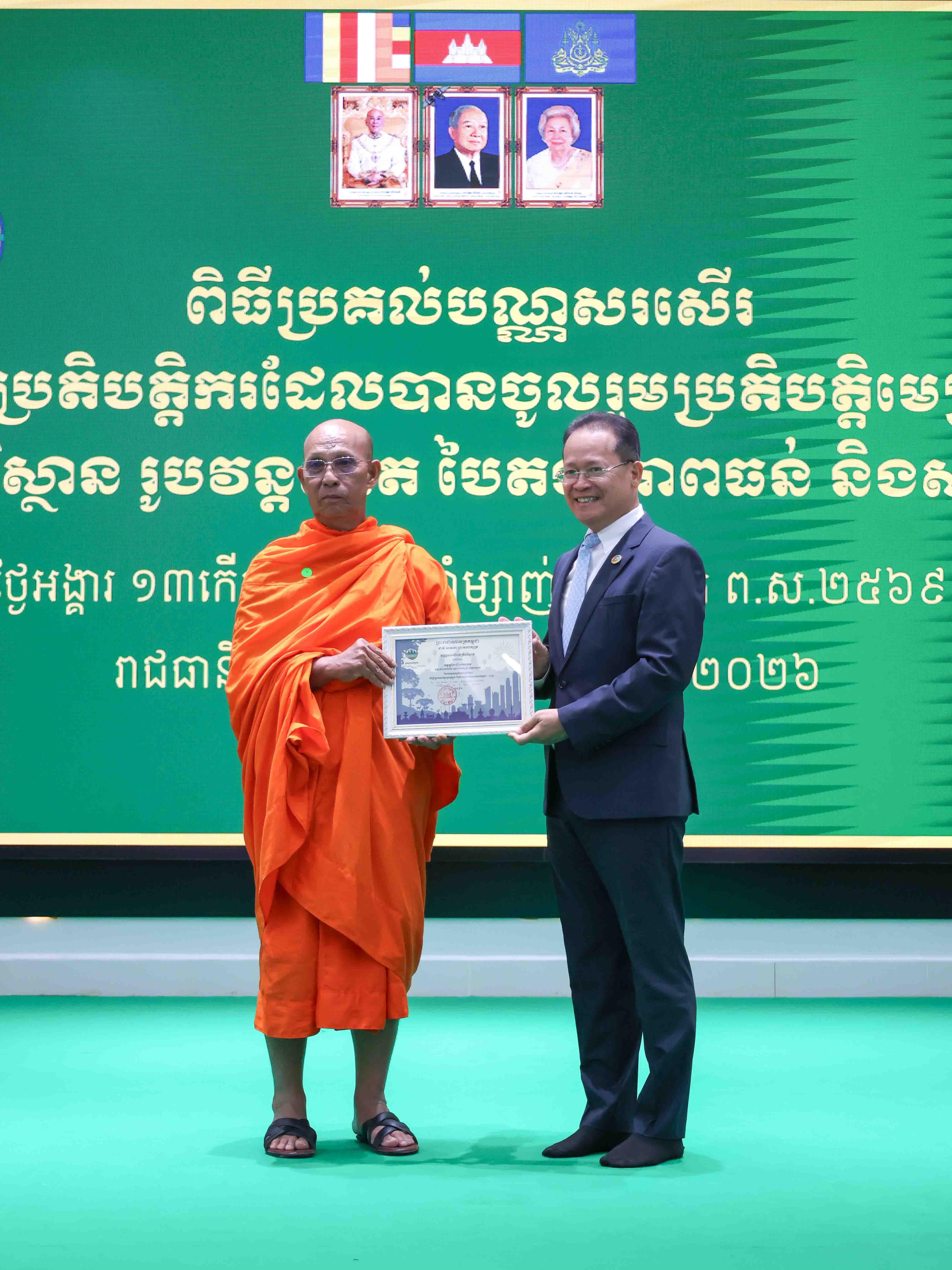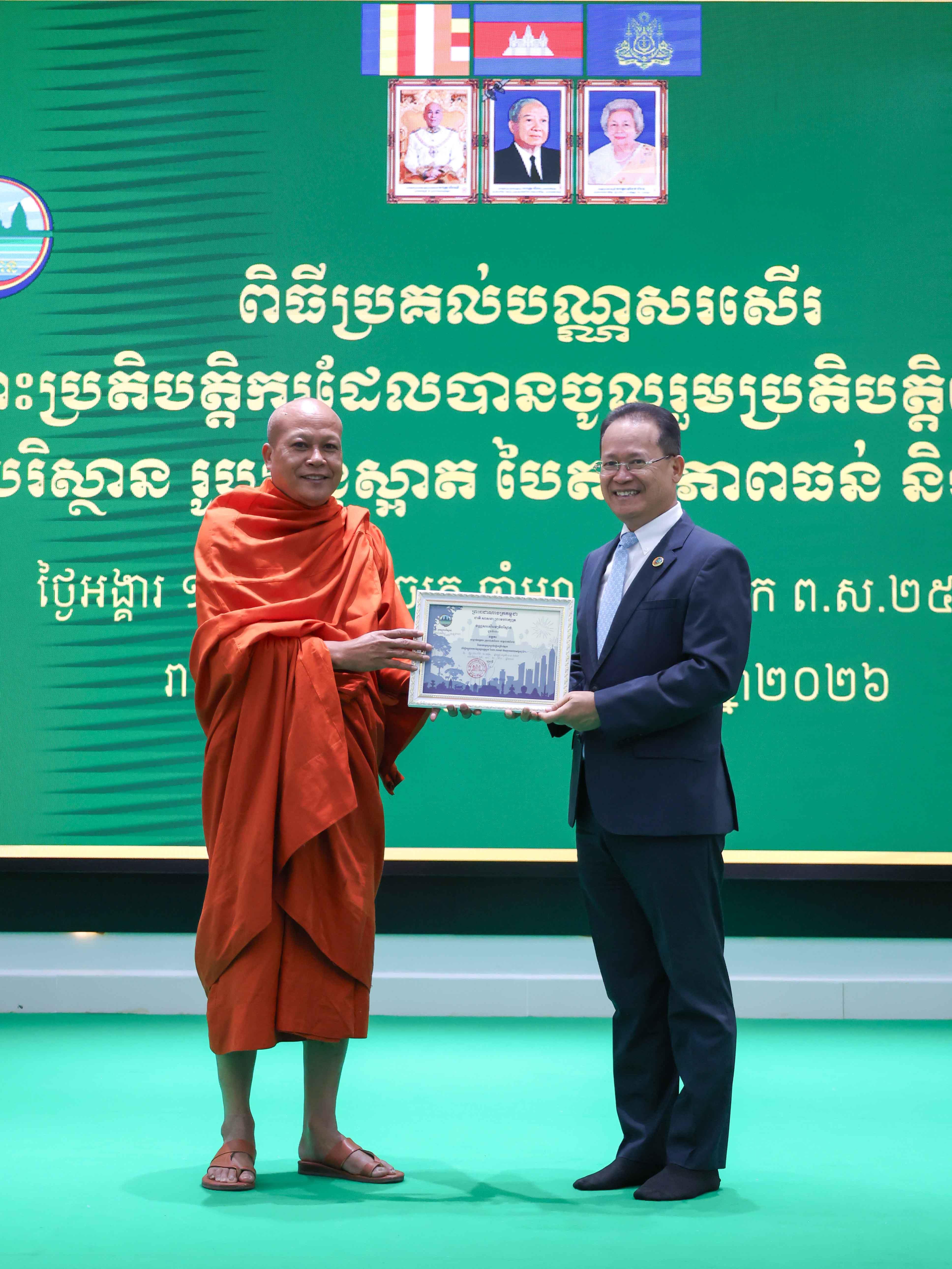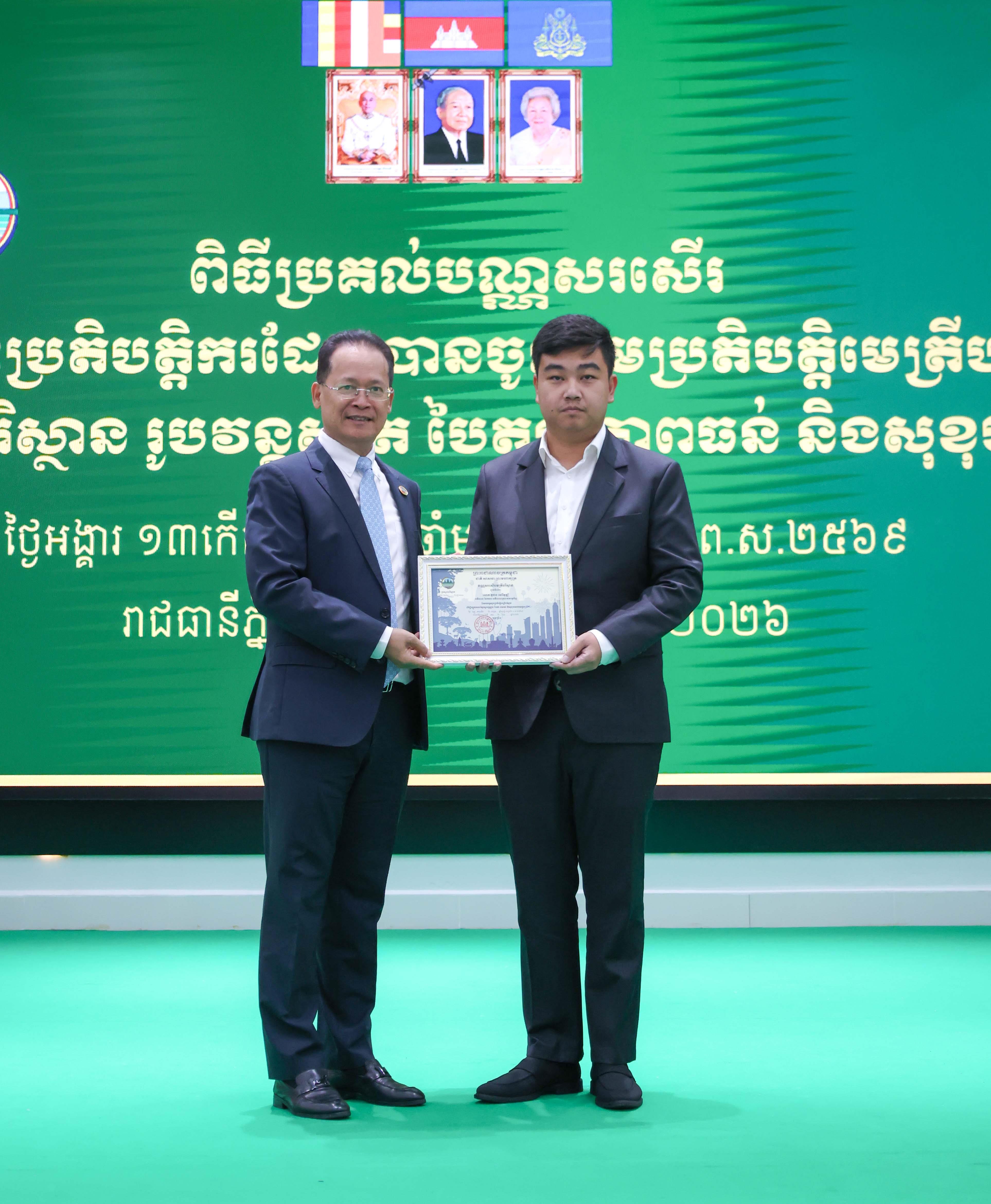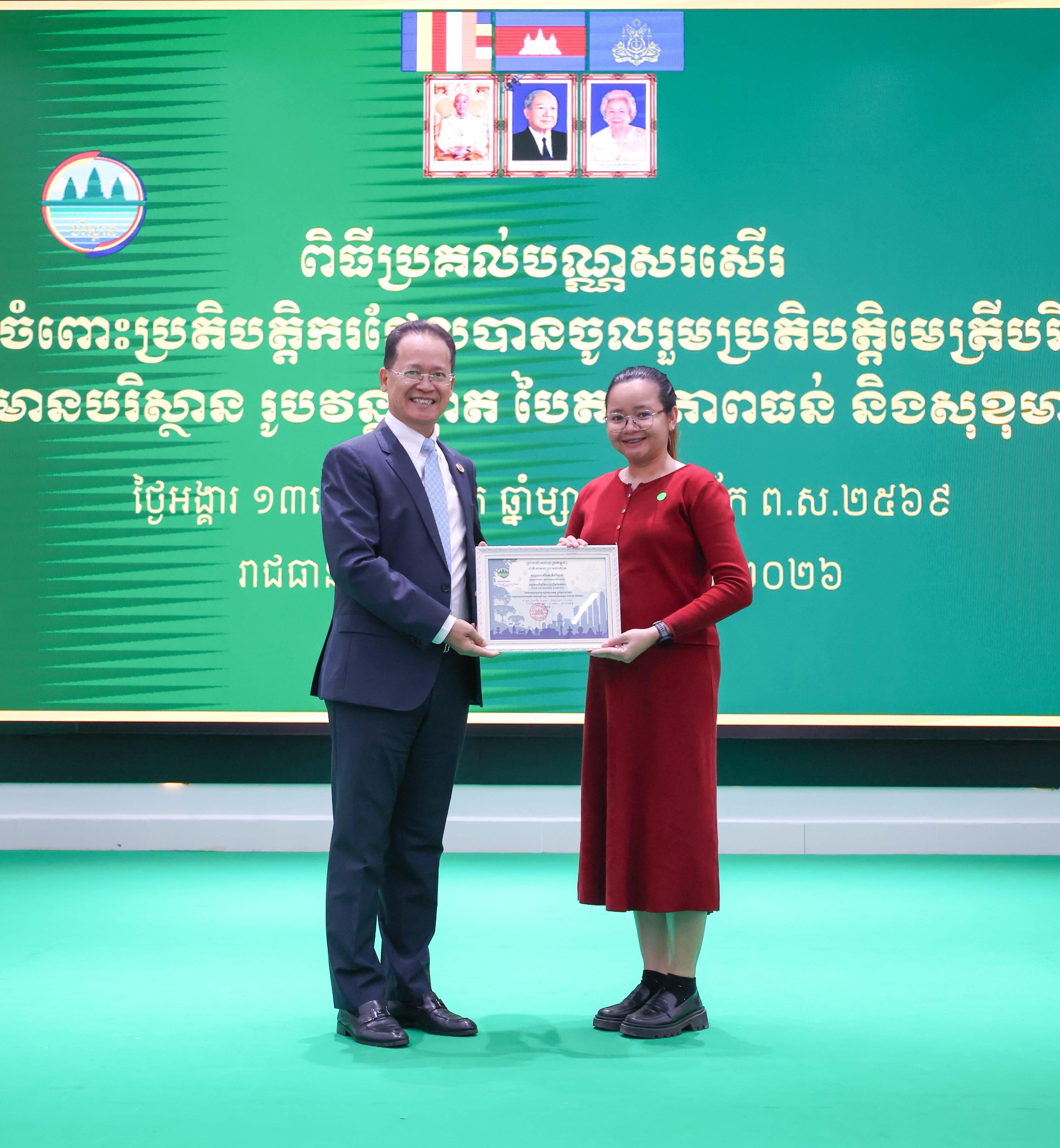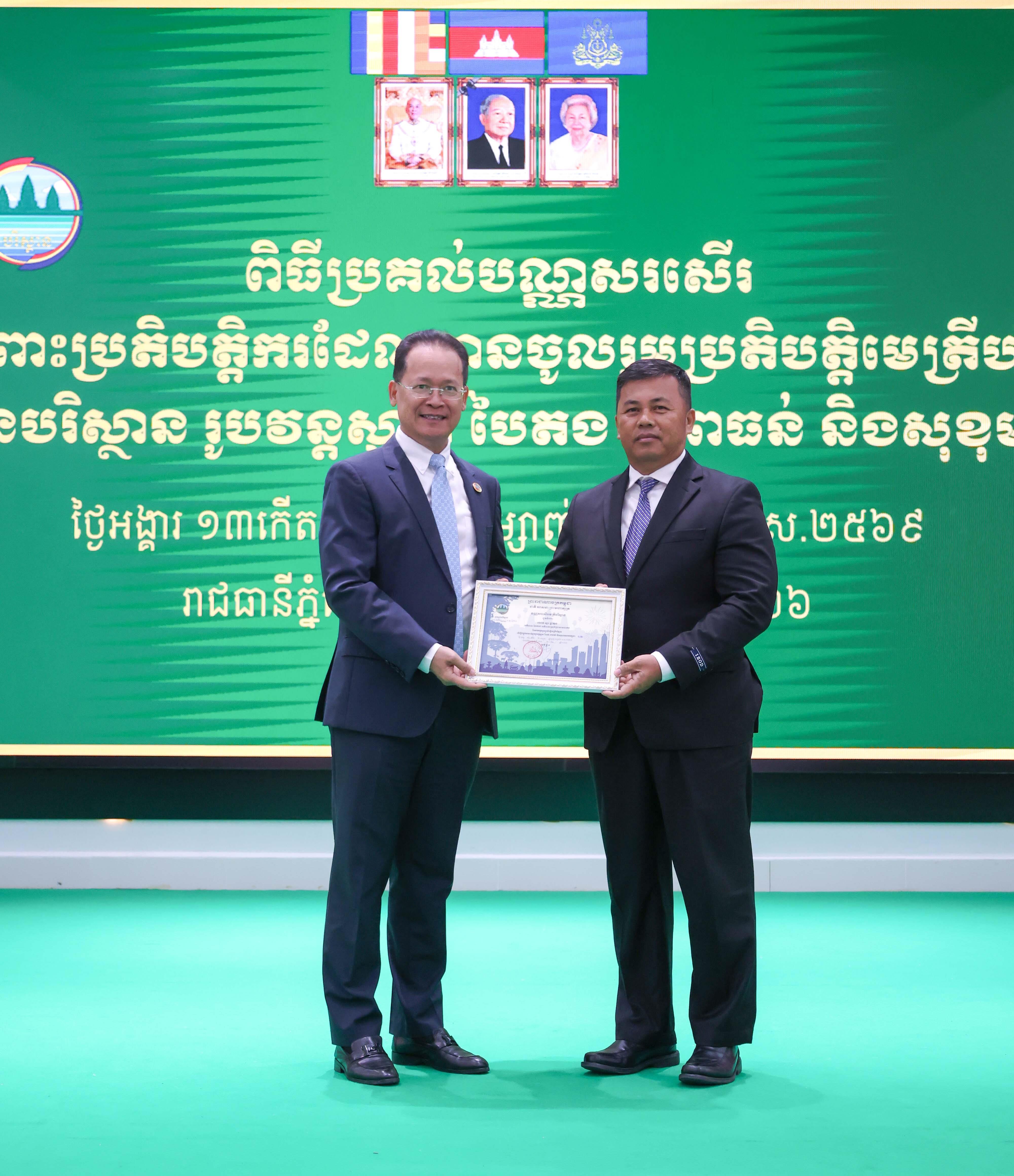 (ភ្នំពេញ)៖ ប្រតិបត្តិករចំនួន៥៤អង្គភាព-ស្ថាប័ន និងមន្ត្រីឧទ្យានុរក្សចំនួន៩៩រូប បានទទួលបណ្ណមេត្រីបរិស្ថាន ឆ្នាំ២០២៦ ដោយផ្ទាល់ពីលោកបណ្ឌិត អ៊ាង សុផល្លែត រដ្ឋមន្រ្តីក្រសួងបរិស្ថាន បន្ទាប់ពីក្រសួងបរិស្ថានពិនិត្យ និងវាយតម្លៃឃើញថាបានអនុវត្តសកម្មបានល្អ ឆ្លើយតបទៅនឹងយុទ្ធសាស្ត្រចក្រាវិស័យបរិស្ថានតាមរយៈការអនុវត្ត «ភាពស្អាត» «ភាពបៃតង» និង «ចីរភាព» ដើម្បីធានាបាននូវចីរភាពបរិស្ថាននៅកម្ពុជា។