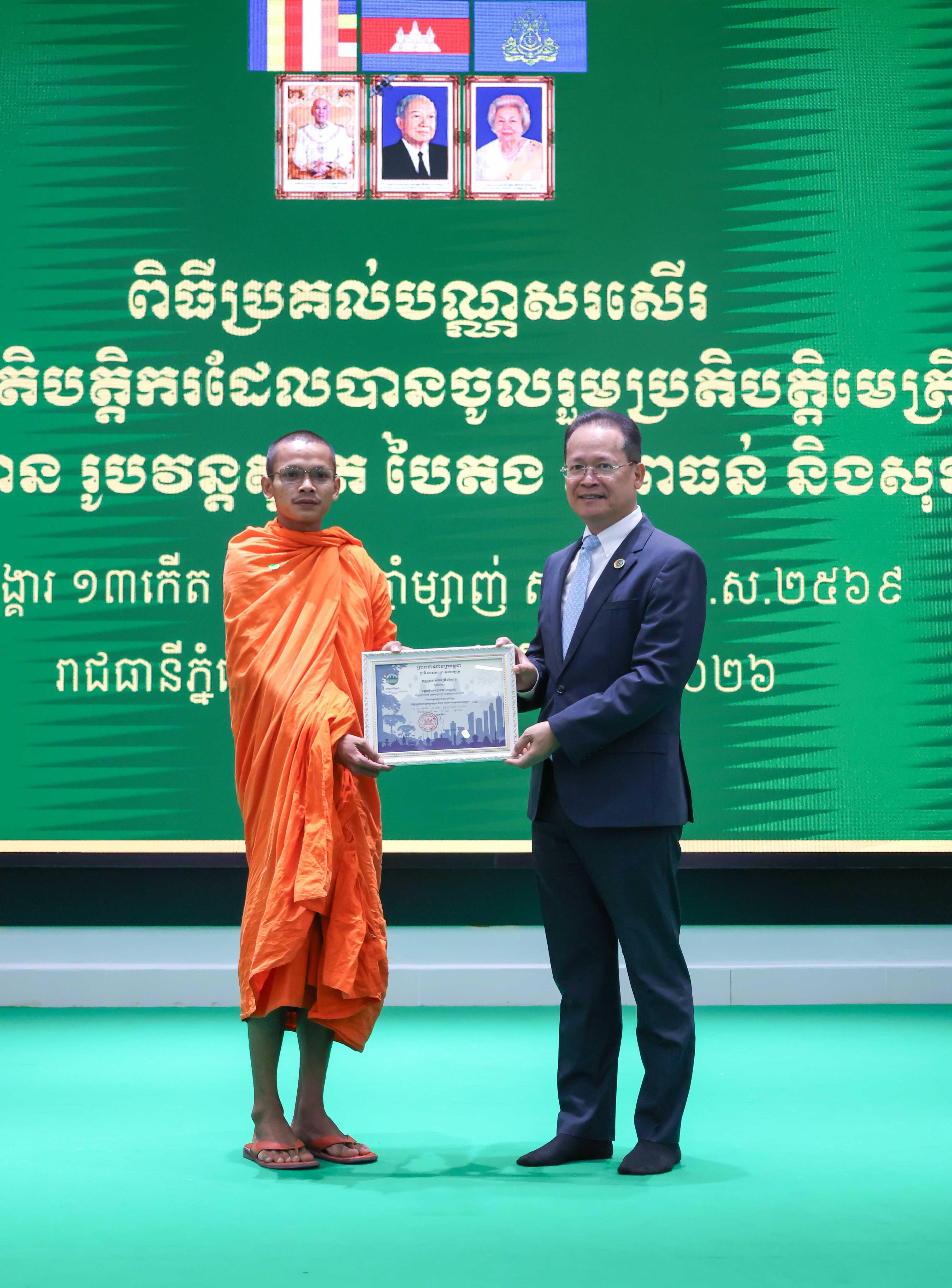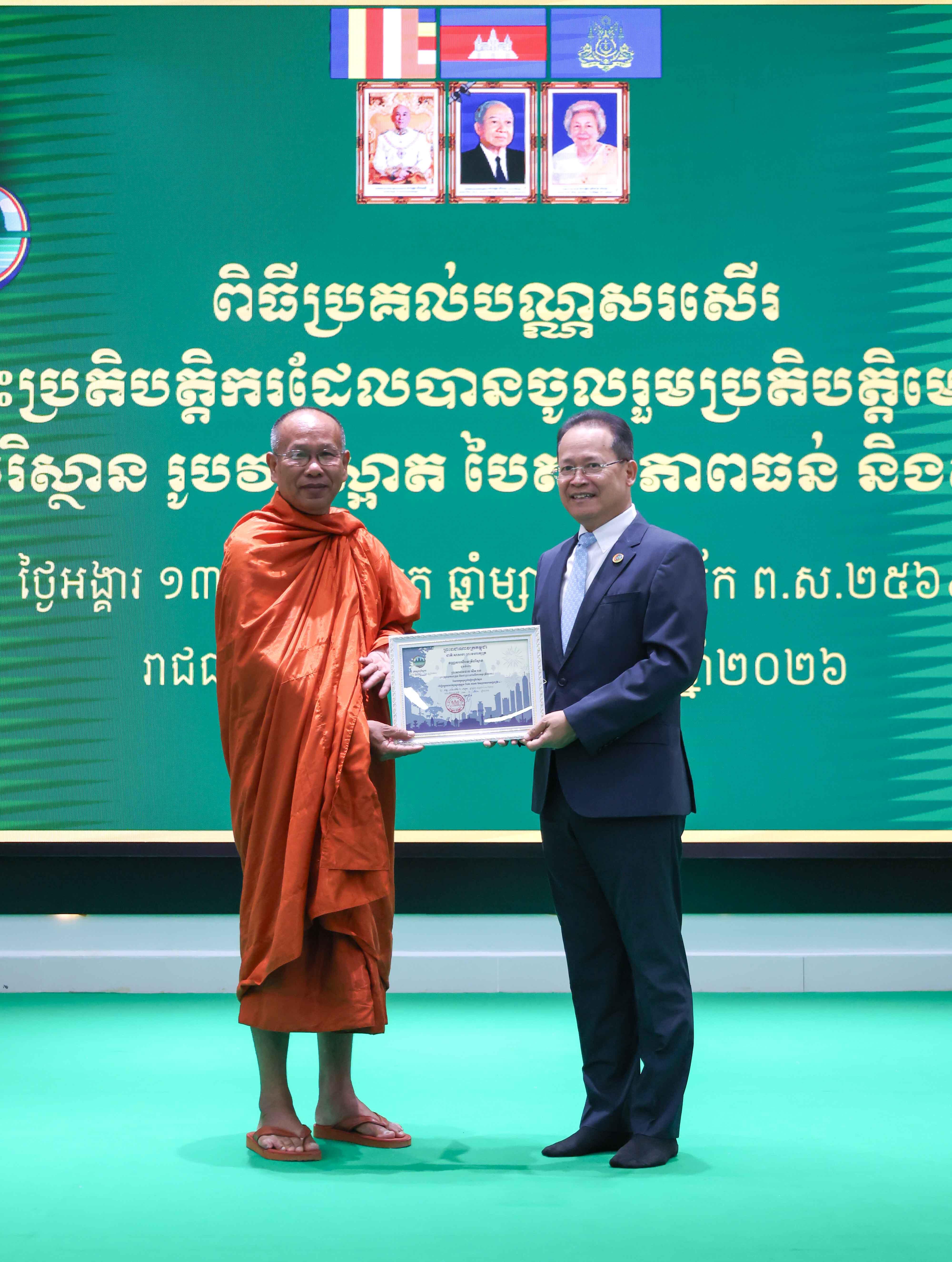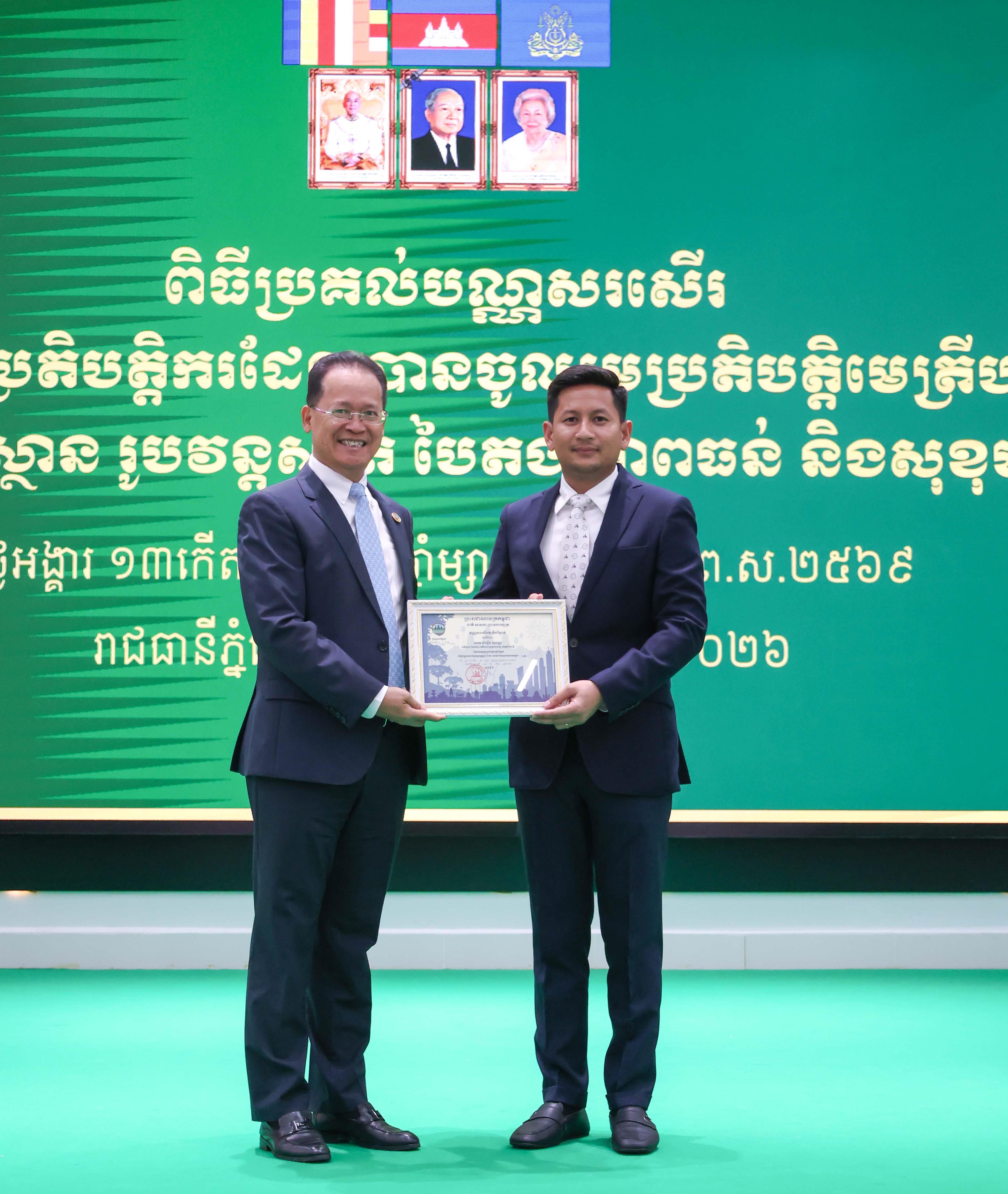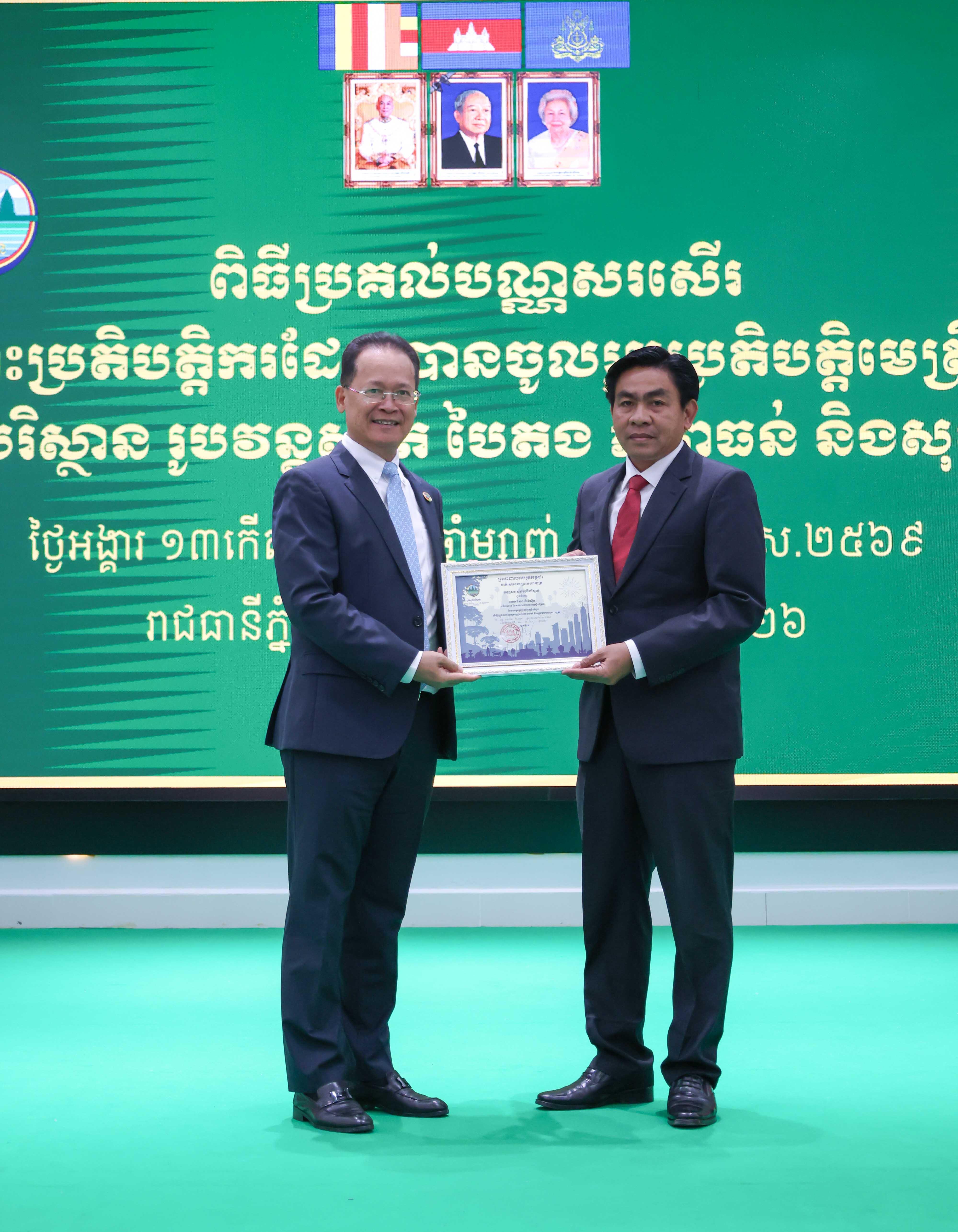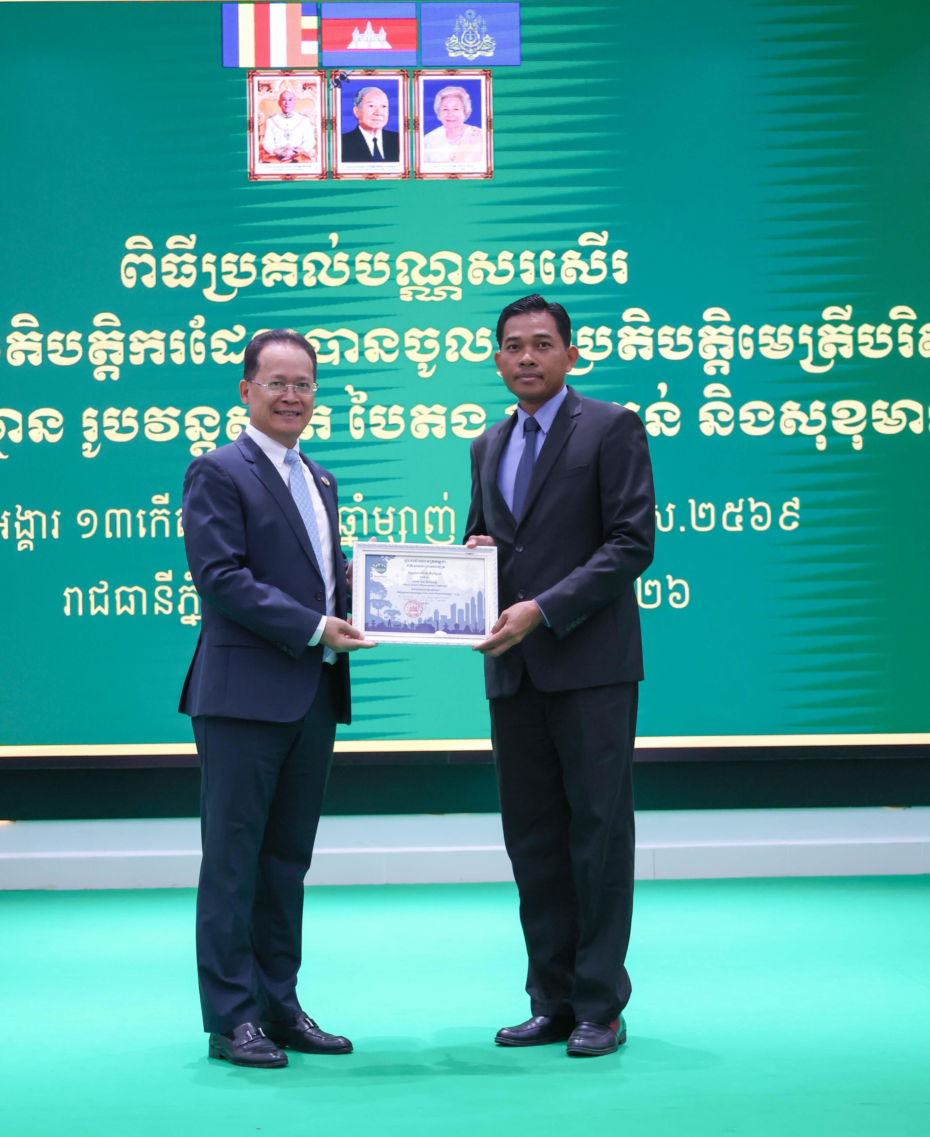 (ភ្នំពេញ)៖ ប្រតិបត្តិករចំនួន៥៤អង្គភាព-ស្ថាប័ន និងមន្ត្រីឧទ្យានុរក្សចំនួន៩៩រូប បានទទួលបណ្ណមេត្រីបរិស្ថាន ឆ្នាំ២០២៦ ដោយផ្ទាល់ពីលោកបណ្ឌិត អ៊ាង សុផល្លែត រដ្ឋមន្រ្តីក្រសួងបរិស្ថាន បន្ទាប់ពីក្រសួងបរិស្ថានពិនិត្យ និងវាយតម្លៃឃើញថាបានអនុវត្តសកម្មបានល្អ ឆ្លើយតបទៅនឹងយុទ្ធសាស្ត្រចក្រាវិស័យបរិស្ថានតាមរយៈការអនុវត្ត «ភាពស្អាត» «ភាពបៃតង» និង «ចីរភាព» ដើម្បីធានាបាននូវចីរភាពបរិស្ថាននៅកម្ពុជា។