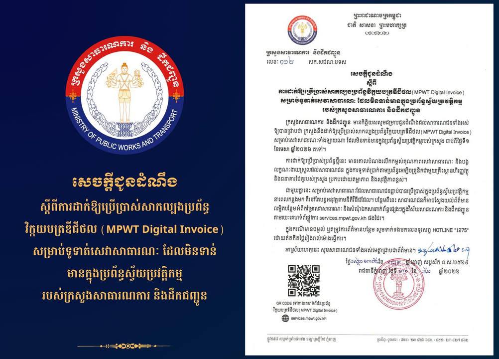 (ភ្នំពេញ)៖ ក្រសួងសាធារណការ និងដឹកជញ្ជូន ចេញសេចក្តីជូនដំណឹងស្តីពី ការដាក់ឱ្យប្រើប្រាស់សាកល្បងប្រព័ន្ធវិក្កយបត្រឌីជីថល(MPWT Digital Invoice)