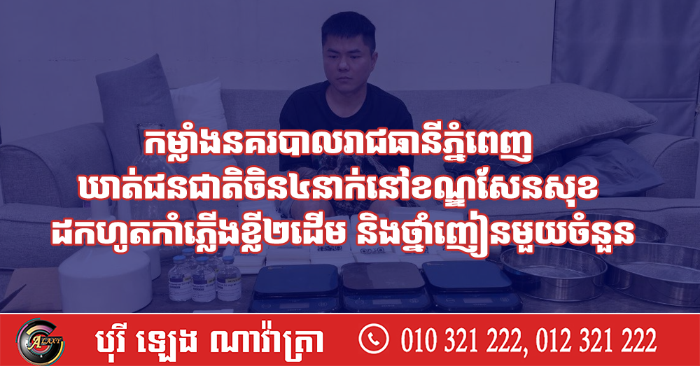 កម្លាំងនគរបាលរាជធានីភ្នំពេញ ឃាត់ជនជាតិចិន៤នាក់នៅខណ្ឌសែនសុខ ដកហូតកាំភ្លើងខ្លី២ដើម និងថ្នាំញៀនមួយចំនួន