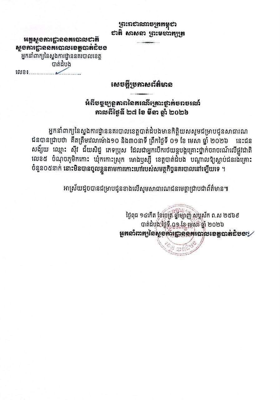 ក្នុងសេចក្តីថ្លែងការណ៍ បានរៀបរាប់ថា កាលពីយប់ថ្ងៃទី២៧ ខែមីនា ឆ្នាំ២០២៦ វេលាម៉ោង២២៖៤០នាទីលើផ្លូវជាតិលេខ៥ ចន្លោះបង្គោលគីឡូម៉ែតលេខ២៤៦-២៤៧ ស្ថិតក្នុងក្រុមទី១២ ភូមិកកោះ ឃុំកកោះ ស្រុកមោងឫស្សី ខេត្តបាត់ដំបង មានករណីគ្រោះថ្នាក់ចរាចរណ៍មួយកើតឡើងរវាងរថយន្តមួយគ្រឿងម៉ាក MERCEDESBENZ AMG GT53ពណ៌ខ្មៅស៊េរីឆ្នាំ២០២០ពាក់ផ្លាកលេខកម្ពុជា C.S.6168 បុកជាមួយ នឹងម៉ូតូចំនួន២គ្រឿងដែលម៉ូតូទី១ ម៉ាកហុងឌីម HONDADREAM ពណ៌ខ្មៅពាក់ផ្លាកលេខបាត់ដំបង1H-2105 ជិះគ្នាចំនួន ៣នាក់ បណ្តាលឱ្យស្លាប់ចំនួន ២នាក់ និងរងរបួសធ្ងន់ចំនួន ១នាក់ប្រុស រីឯម៉ូតូទី២ ម៉ាកហុងដាឌ្រីម HONDA DREAM ពណ៌ខ្មៅពាក់ផ្លាកលេខ បាត់ដំបង 1S-1965 ជិះគ្នាចំនួន ៣នាក់បណ្តាលឱ្យស្លាប់ចំនួន ០៣នាក់ប្រុសចំនួន ២នាក់ស្រីចំនួន ១នាក់ ។