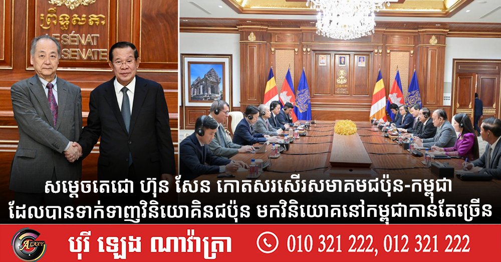(ភ្នំពេញ)៖ សម្តេចតេជោ ហ៊ុន សែន ប្រមុខរដ្ឋស្តីទី បានសម្តែងការកោតសរសើរសមាគមជប៉ុន-កម្ពុជា ដែលបានទាក់ទាញវិនិយោគិនជប៉ុន មកវិនិយោគនៅកម្ពុជាកាន់តែច្រើន។