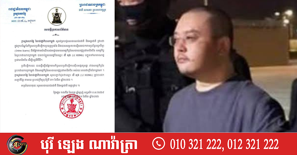 សមត្ថកិច្ចកម្ពុជា ចាប់ខ្លួនជនជាតិចិនម្នាក់ឈ្មោះ លី សុង (LI XIONG) ម្ចាស់ក្រុមហ៊ុន Huione ពាក់ព័ន្ធបទល្មើស Online Scam បញ្ជូនទៅចិនវិញ