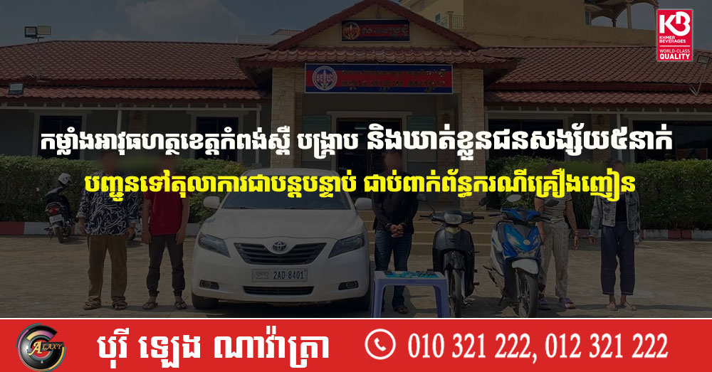 កម្លាំងអាវុធហត្ថខេត្តកំពង់ស្ពឺ បង្ក្រាប និងឃាត់ខ្លួនជនសង្ស័យ៥នាក់ បញ្ជូនទៅតុលាការជាបន្តបន្ទាប់ ជាប់ពាក់ព័ន្ធករណីគ្រឿងញៀន (Video inside)