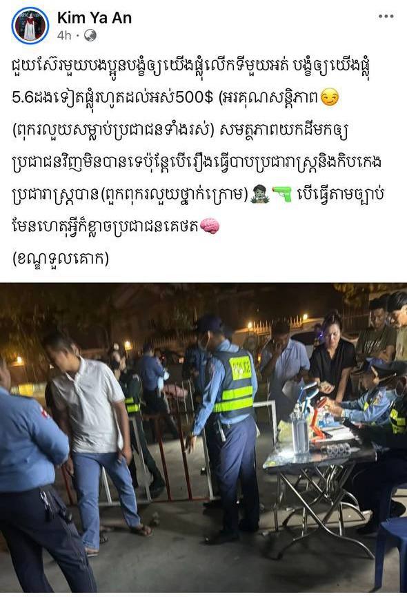 ក្រោយការពិន័យរួច សមត្តកិច្ចមិនទាន់អនុញ្ញាតឲ្យគាត់ទៅនោះទេដោយរង់ចាំ (ស្វាងស្រាសិន) ទើបបានអនុញ្ញាតឲ្យគាត់បើករថយន្តបន្តដំណើរទៅមុខ។ លុះព្រឹកឡើងថ្ងៃដដែលអ្នកបើករថយន្តខាងលើស្រាប់តែបង្ហោះព័ត៌មាន មិនពិតមានលក្ខណៈញុះញង់ប៉ះពាល់កិត្តិយស សេចក្តីថ្លៃថ្នូររបស់សមត្ថកិច្ច ជាពិសេសនាំឲ្យមហាជនយល់ច្រឡំមកលើសមត្ថកិច្ចតាមបណ្តាញសង្គមហ្វេសប៊ុករបស់ខ្លួនឈ្មោះ «Kim Ya An» ដែលមានខ្លឹមសារថា «ជួយស៊ែរមួយបងប្អូនបង្ខំឲ្យយើងផ្លុំលើកទីមួយអត់ បង្ខំឲ្យយើងខ្ញុំ 5-6ដងទៀតផ្លុំរហូតដល់អស់500$ (ពុករលួយសម្លាប់ប្រជាជនទាំងរស់ និងខ្លឹមសាររបៀបញុះញង់មួយចំនួនទៀតផងដែរ...»។
