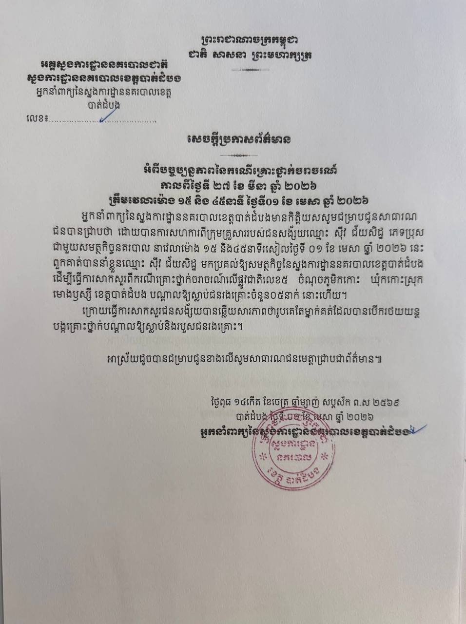 អ្នកនាំពាក្យ នៃស្នងការដ្ឋាននគរបាលខេត្តបាត់ដំបង បានបញ្ជាក់ថា ដោយបានការសហការពីក្រុមគ្រួសាររបស់ជនសង្ស័យឈ្មោះ ស៊ីវ ជ័យសិដ្ឋ ភេទប្រុស ជាមួយសមត្ថកិច្ចនគរបាល នាវេលាម៉ោង ១៥៖៤៥នាទីរសៀលថ្ងៃទី១ ខែមេសា ឆ្នាំ២០២៦នេះ ពួកគាត់បាននាំខ្លួនឈ្មោះ ស៊ីវ ជ័យសិដ្ឋ មកប្រគល់ឲ្យសមត្ថកិច្ច នៃស្នងការដ្ឋាននគរបាលខេត្តបាត់ដំបង ដើម្បីធ្វើការសាកសួរពីករណីគ្រោះថ្នាក់ចរាចរណ៍លើផ្លូវជាតិលេខ៥ ចំណុចភូមិកកោះ ឃុំកកោះ ស្រុក មោងឫស្សី ខេត្តបាត់ដំបង បណ្ដាលឲ្យស្លាប់ជនរងគ្រោះចំនួន៥នាក់ (ស្ដ្រីពោះធំម្នាក់) នោះហើយ។