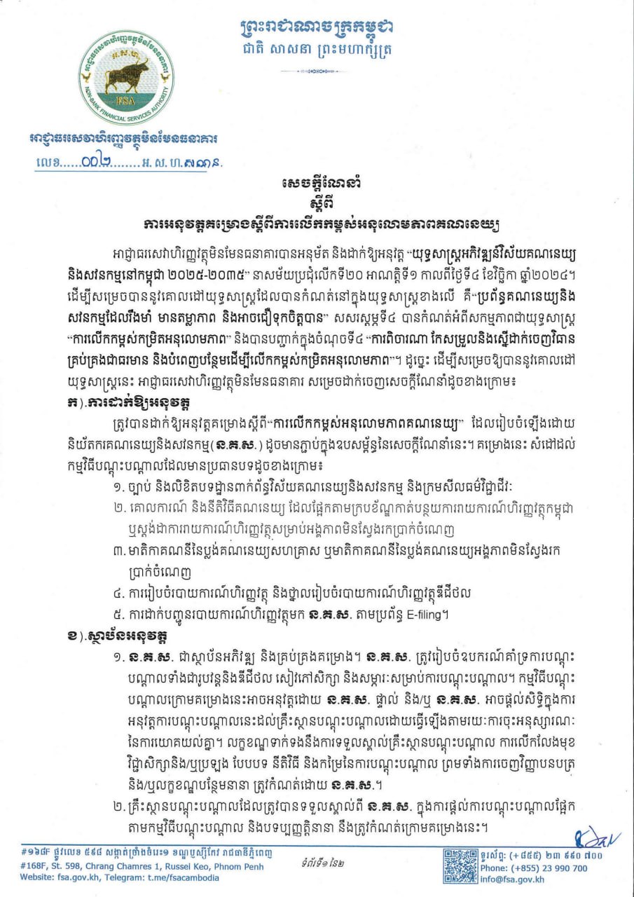 អាជ្ញាធរសេវាហិរញ្ញវត្ថុមិនមែនធនាគារ ចេញសេចក្តីណែនាំ ស្តីពី ការអនុវត្តគម្រោង ស្តីពីការលើកកម្ពស់អនុលោមភាពគណនេយ្យ
