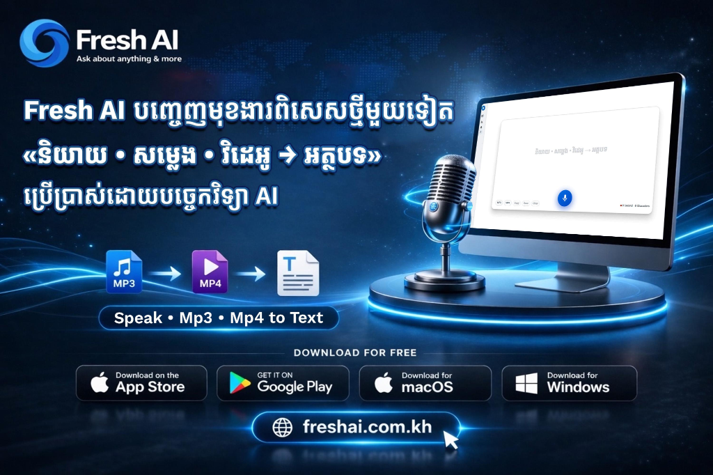 (ភ្នំពេញ)៖ នៅក្នុងយុគសម័យឌីជីថលដែលពេលវេលាគឺជាមាសប្រាក់ ការអង្គុយស្ដាប់សំឡេងហើយវាយអត្ថបទតាមកំពុងក្លាយជាការងារដែលស៊ីពេលខ្លាំង។ ដើម្បីដោះស្រាយបញ្ហានេះ Fresh AI បានបញ្ចេញកំណែអាប់ដេតថ្មី Version 23 ដែលនាំមកនូវមុខងារដ៏អស្ចារ្យគឺការបំលែងពីការ «និយាយ • សម្លេង • វិដេអូ → អត្ថបទ» ដោយស្វ័យប្រវត្តិ។ Speak • Mp3 • Mp4 to Text !