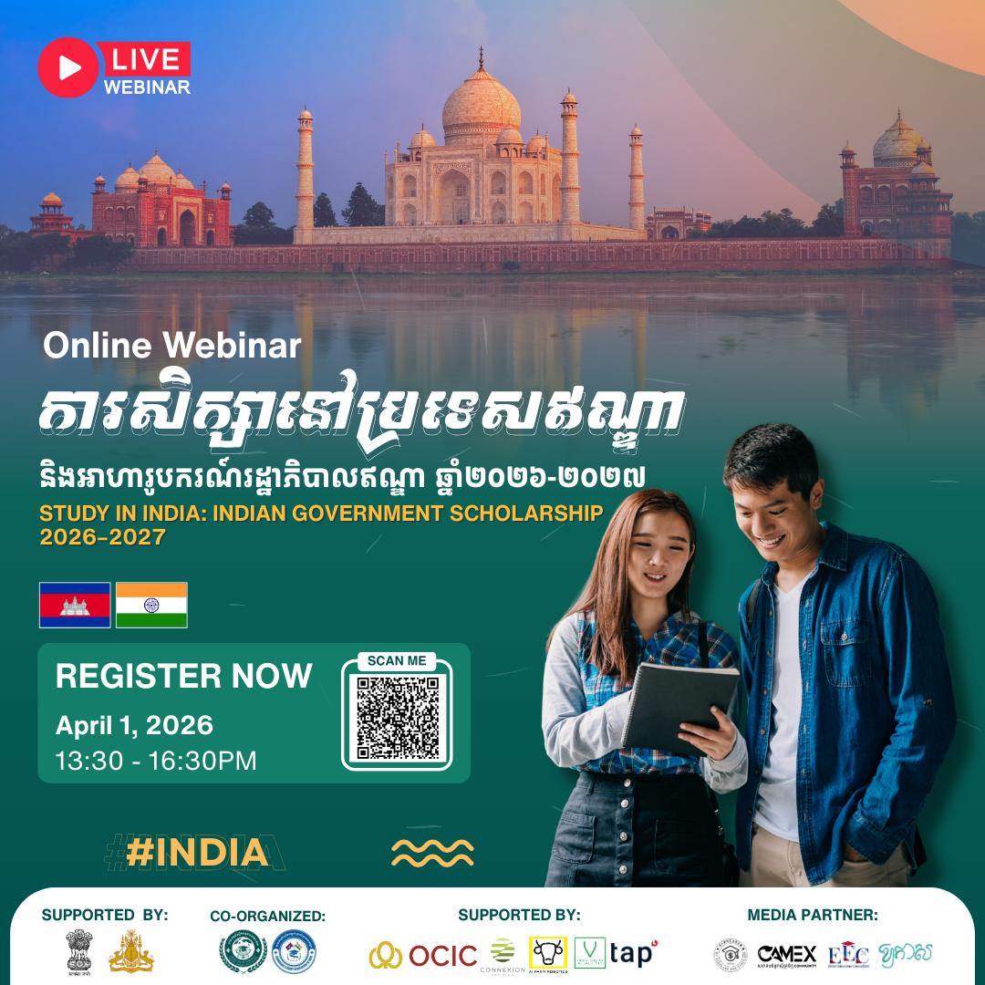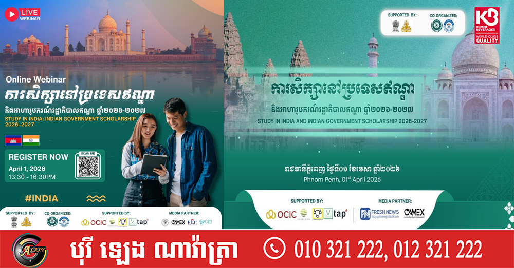 (ភ្នំពេញ)៖ នៅថ្ងៃទី០១ ខែមេសា ឆ្នាំ២០២៦ សហព័ន្ធនិស្សិតកម្ពុជានៅបរទេស (CamStudent) សហការជាមួយ សមាគមនិស្សិតកម្ពុជាប្រចាំនៅប្រទេសឥណ្ឌា (CamSai) ដោយមានការគាំទ្រពីស្ថានទូតឥណ្ឌាប្រចាំកម្ពុជា និងស្ថានទូតកម្ពុជាប្រចាំប្រទេសឥណ្ឌា បានរៀបចំសិក្ខាសាលាតាមប្រព័ន្ធអ៊ីនធឺណិតដោយជោគជ័យស្តីពី «ការសិក្សានៅប្រទេសឥណ្ឌា និងអាហារូបករណ៍រដ្ឋាភិបាលឥណ្ឌា ២០២៦-២០២៧»។