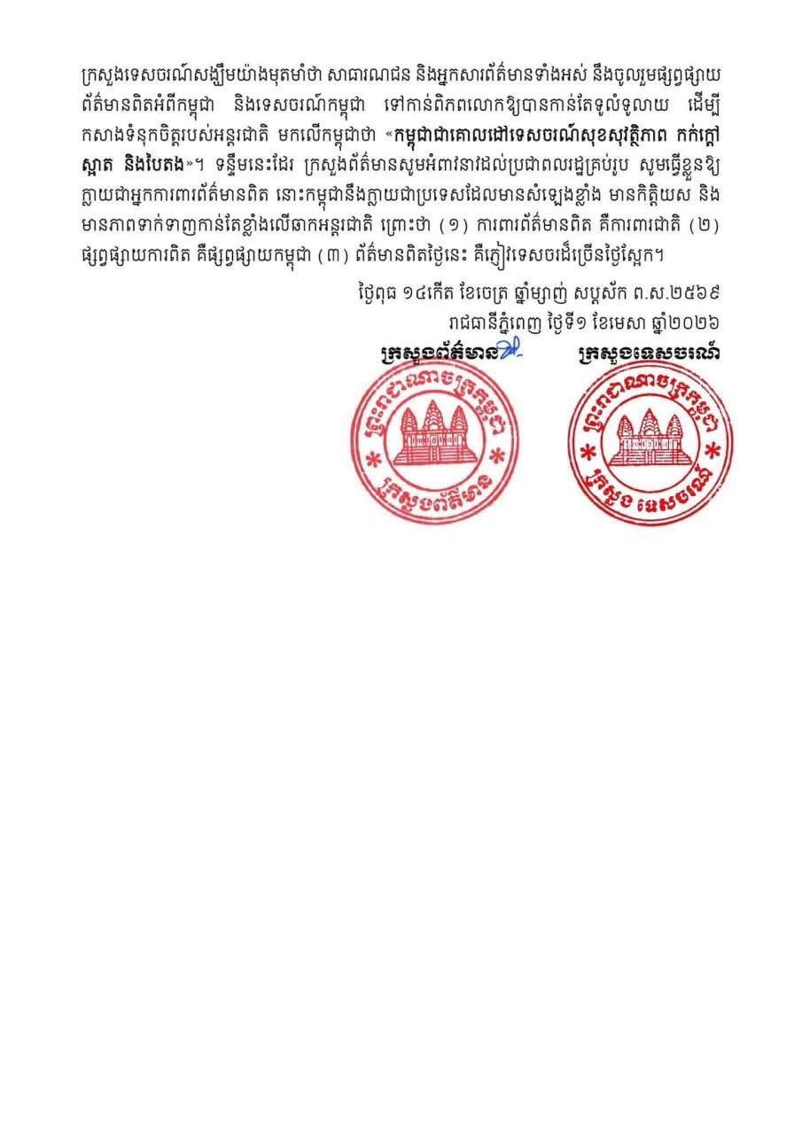 ខាងក្រោមនេះជាសេចក្តីប្រកាសរួមរបស់ក្រសួងព័ត៌មាន និងក្រសួងទេសចរណ៍៖
