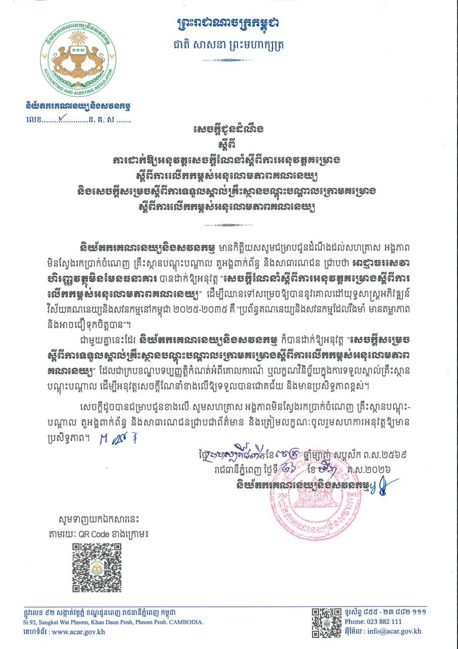 និយ័តករគណនេយ្យ និងសវនកម្ម ជូនដំណឹងពីការដាក់ឱ្យអនុវត្តសេចក្តីណែនាំ ស្តីពីការអនុវត្តគម្រោង ការលើកកម្ពស់អនុលោមភាព គណនេយ្យ និងសេចក្តីសម្រេច ការទទួលស្គាល់គ្រឹះស្ថានបណ្តុះបណ្តាល