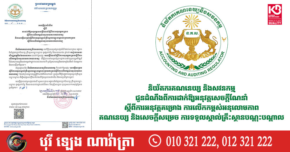 (ភ្នំពេញ)៖ និយ័តករគណនេយ្យ និងសវនកម្ម បានសេចក្តីជូនដំណឹង ស្តីពី ការដាក់ឱ្យអនុវត្តសេចក្តីណែនាំ ស្តីពីការអនុវត្តគម្រោង ស្តីពីការលើកកម្ពស់អនុលោមភាព គណនេយ្យ និងសេចក្តីសម្រេច ស្តីពីការទទួលស្គាល់គ្រឹះស្ថានបណ្តុះបណ្តាល ក្រោមគម្រោង ស្តីពីការលើកកម្ពស់អនុលោមភាពគណនេយ្យ៕