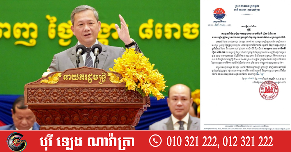 (ភ្នំពេញ)៖ ក្រសួងព័ត៌មាន បានចេញសេចក្តីជូនដំណឹងថា នៅឆ្នាំ២០២៦នេះ មិនមានឡើយនូវពិធីជួបជុំរវាង សម្តេចមហាបវរធិបតី ហ៊ុន ម៉ាណែត នាយករដ្ឋមន្ត្រីកម្ពុជាជាមួយអ្នកសារព័ត៌មាន។