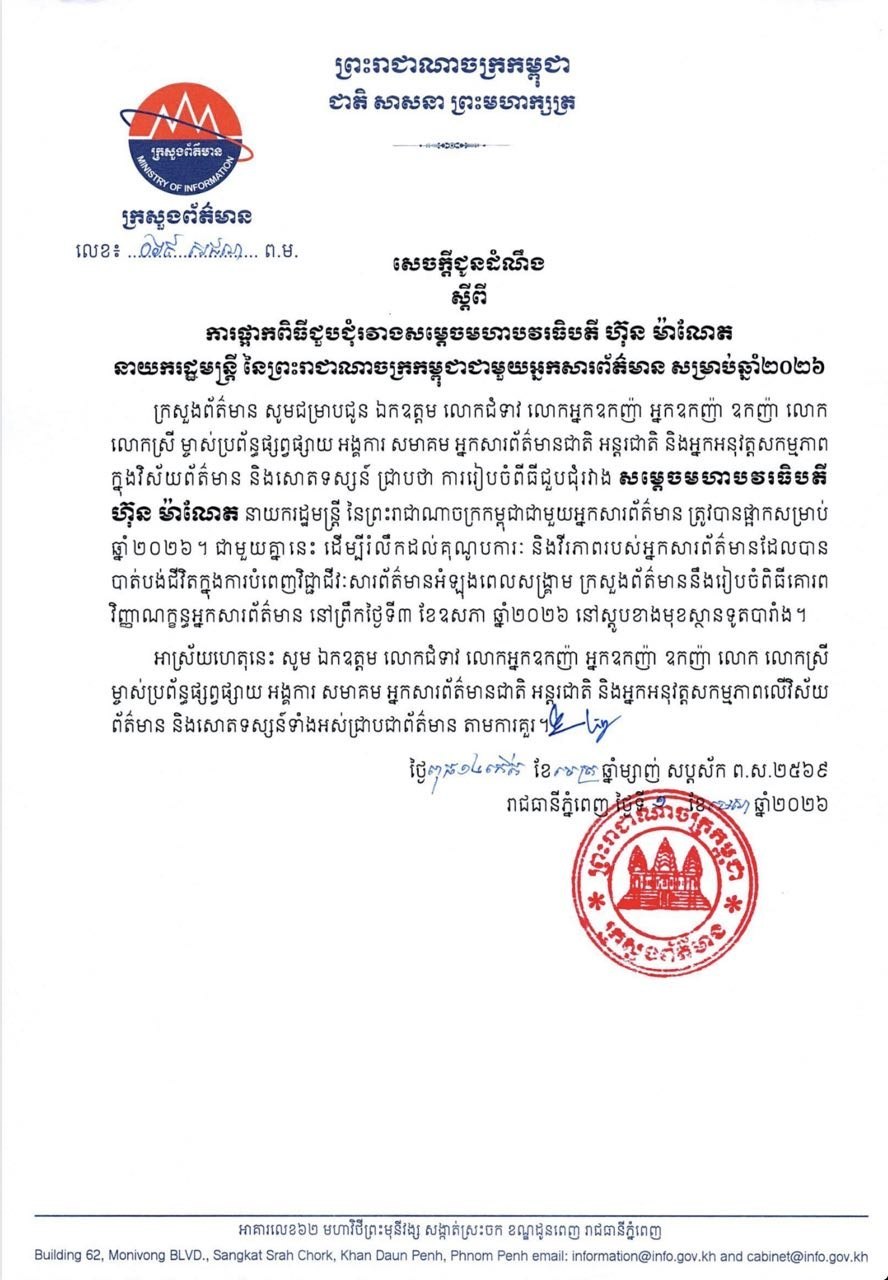 ក្រសួងព័ត៌មាន ប្រកាសថា ឆ្នាំ២០២៦នេះ មិនមានឡើយនូវពិធីជួបជុំរវាង សម្តេចមហាបវរធិបតី ហ៊ុន ម៉ាណែត ជាមួយអ្នកសារព័ត៌មាន (Video inside)