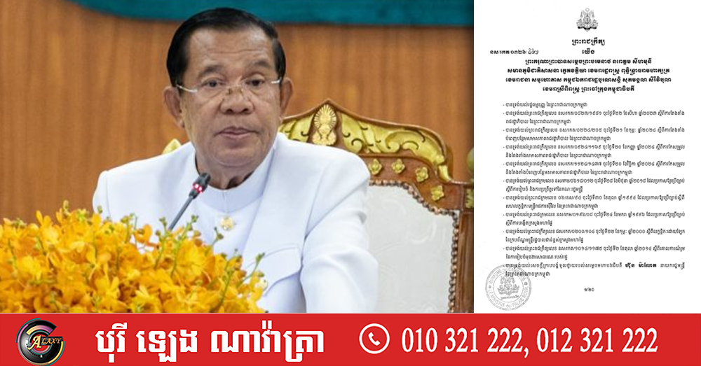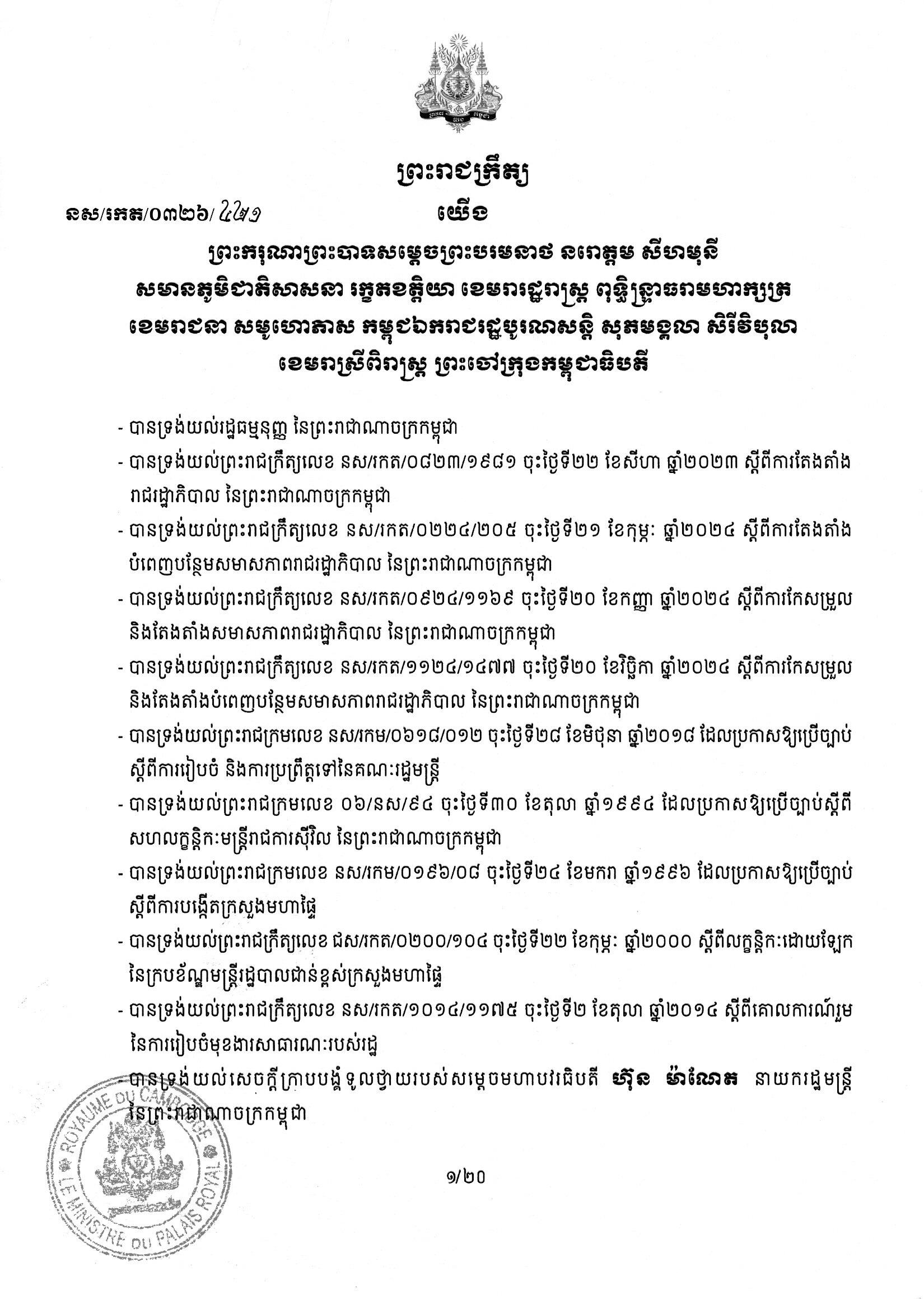 ខាងក្រោមនេះ ជាព្រះរាជក្រឹត្យរបស់សម្ដេចតេជោ ហ៊ុន សែន ប្រមុខរដ្ឋស្ដីទី៖