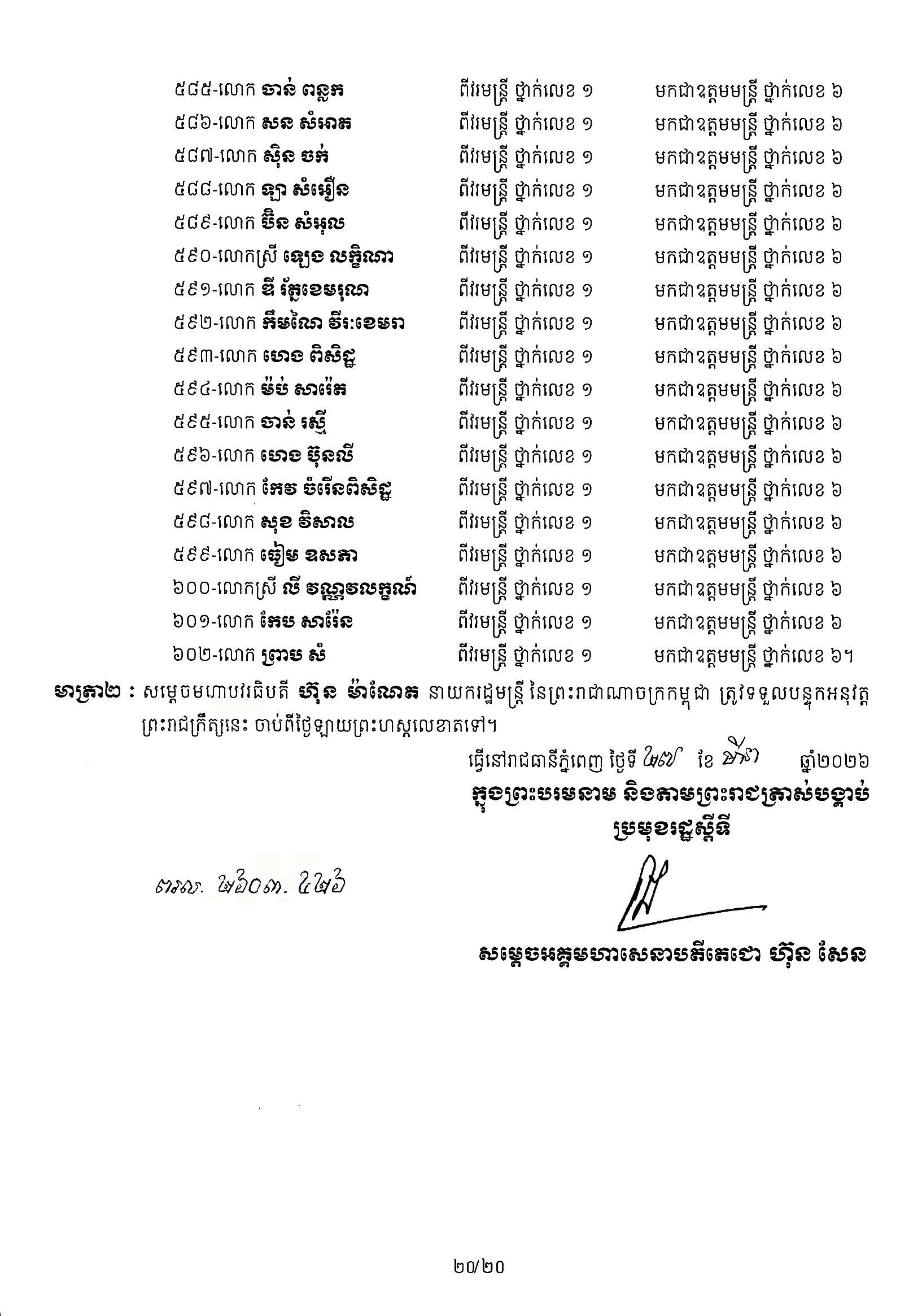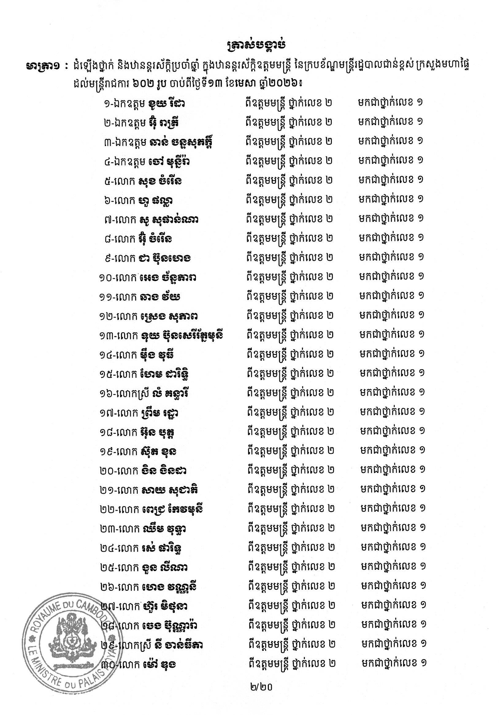 (ភ្នំពេញ)៖ សម្ដេចតេជោ ហ៊ុន សែន ប្រមុខរដ្ឋស្ដីទី បានចេញព្រះរាជក្រឹត្យដំឡើងថ្នាក់ និងឋានន្តរស័ក្តិប្រចាំឆ្នាំក្នុងឋានន្តរស័ក្តិឧត្តមមន្ត្រី នៃក្រខ័ណ្ឌមន្ត្រីរដ្ឋបាលជាន់ខ្ពស់ក្រសួងមហាផ្ទៃ ដល់មន្ត្រីរាជការចំនួន ៦០២រូប ចាប់ពីថ្ងៃទី១៣ ខែមេសា ឆ្នាំ២០២៦។ នេះបើតាមព្រះរាជក្រឹត្យ ដែលបណ្ដាញព័ត៌មាន Fresh News ទទួលបាននៅថ្ងៃទី០២ ខែមេសា ឆ្នាំ២០២៦៕