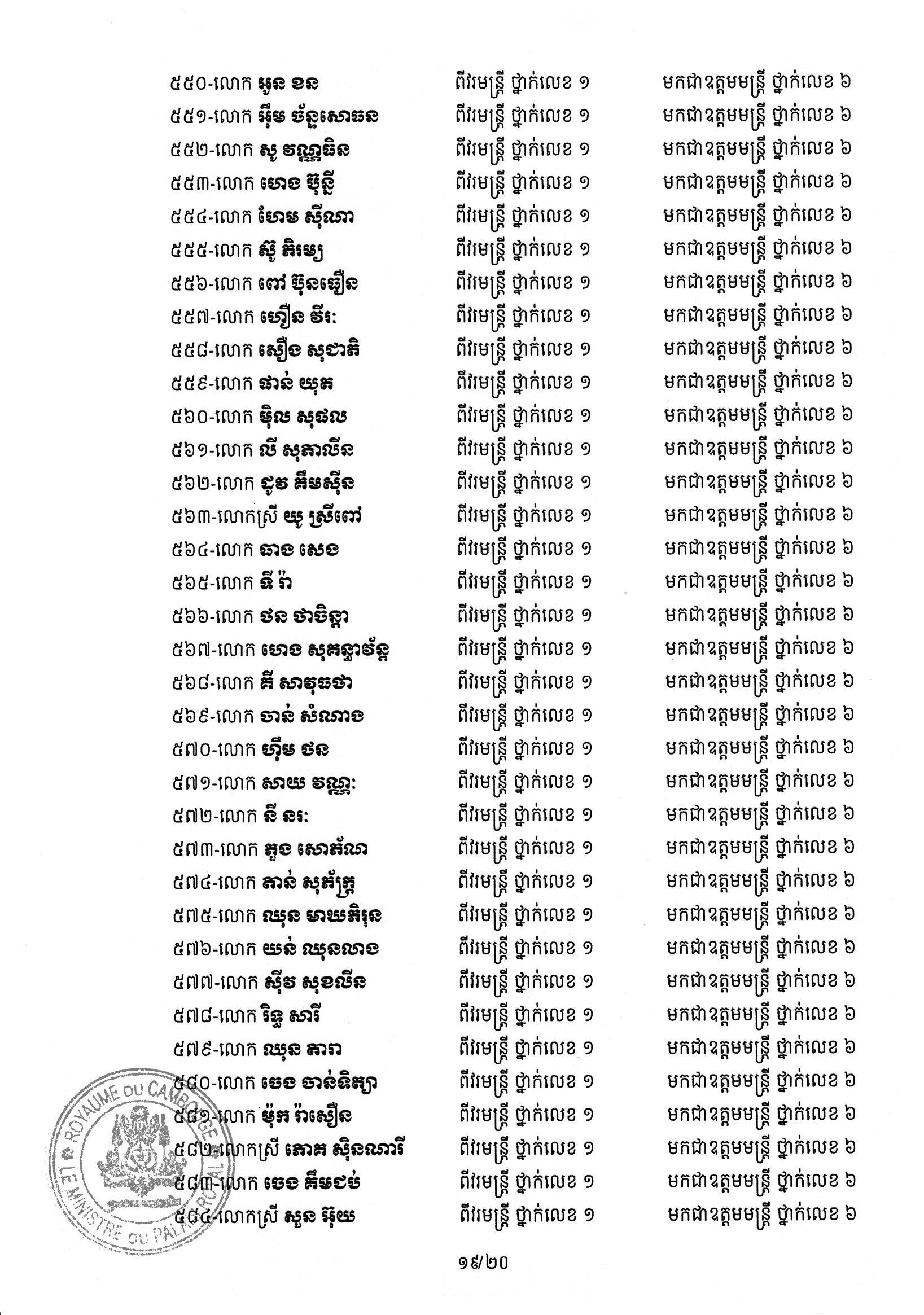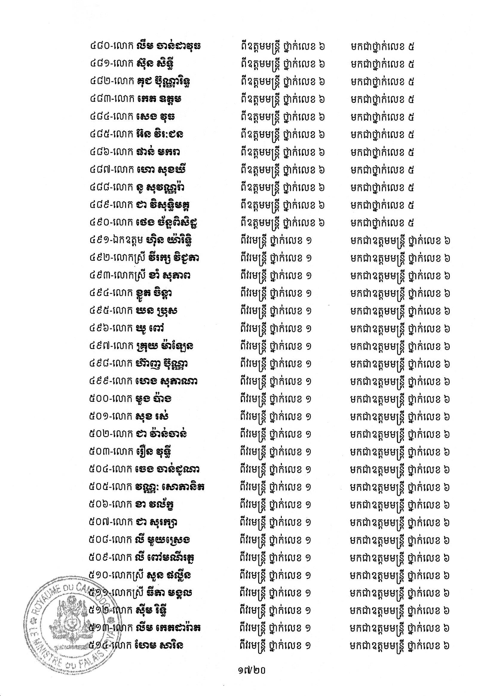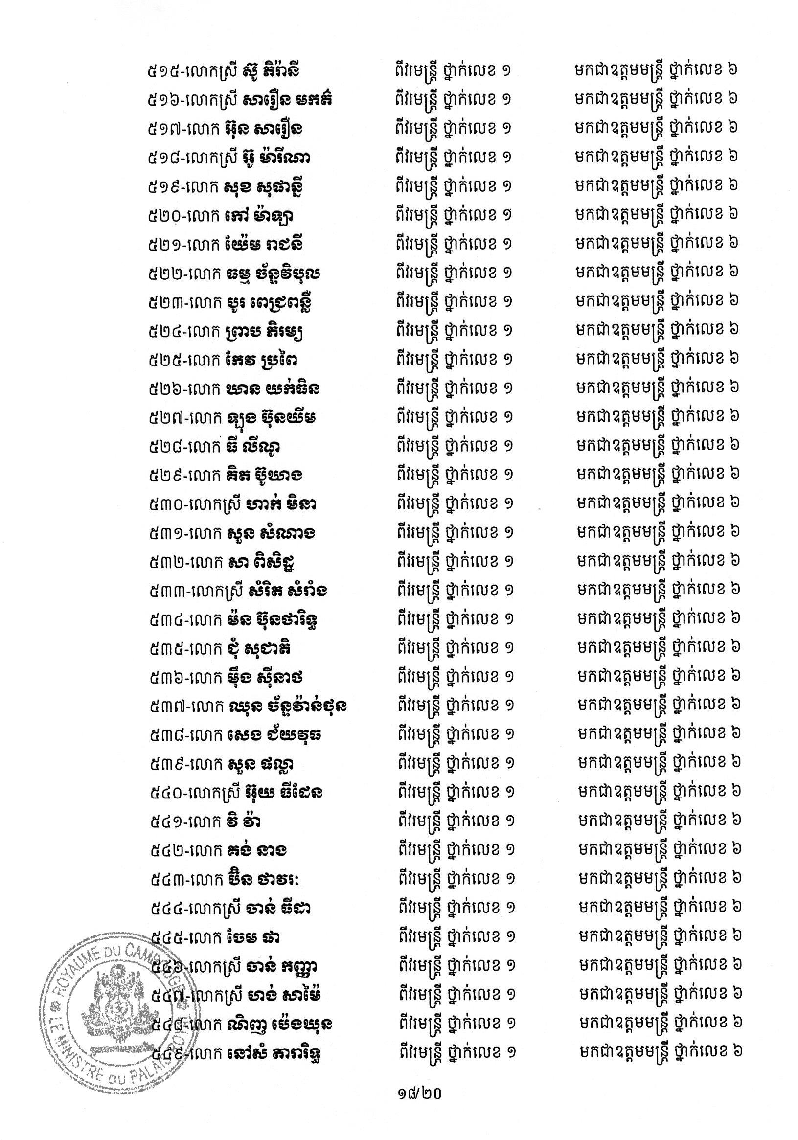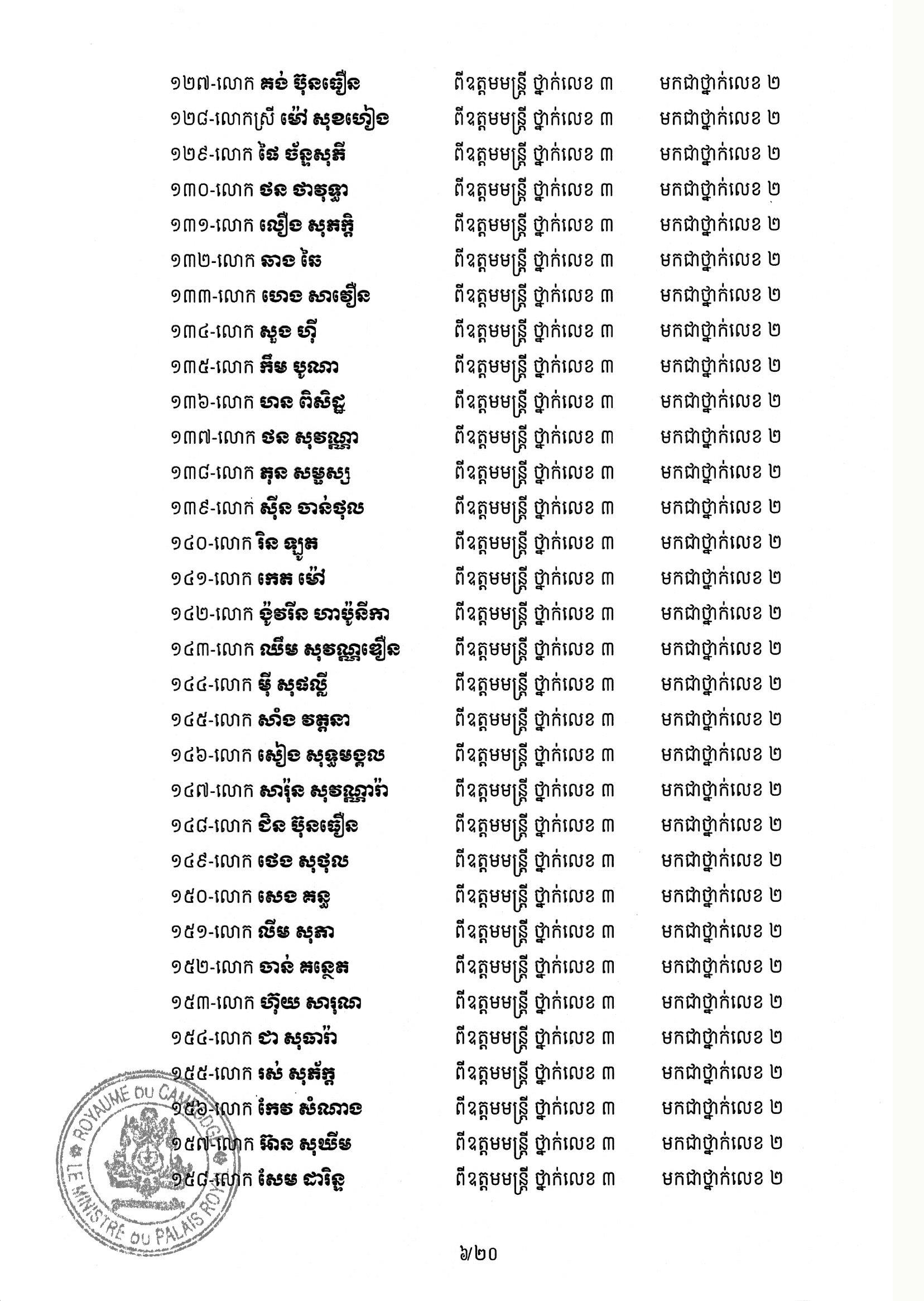 សម្ដេចតេជោ ហ៊ុន សែន ប្រមុខរដ្ឋស្ដីទី ចេញព្រះរាជក្រឹត្យដំឡើងថ្នាក់ និងឋានន្តរស័ក្តិប្រចាំឆ្នាំ ក្នុងឋានន្តរស័ក្តិឧត្តមមន្ត្រី នៃក្រខ័ណ្ឌមន្ត្រីរដ្ឋបាលជាន់ខ្ពស់ក្រសួងមហាផ្ទៃ ៦០២រូប